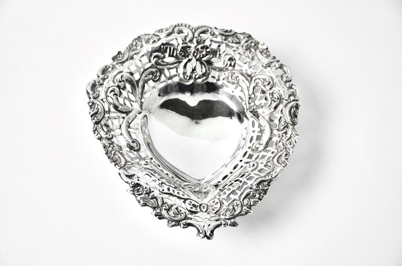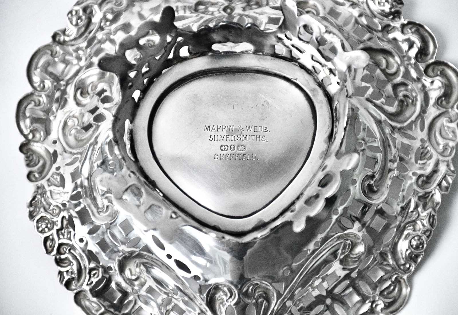 This stunning antique sterling silver bon bon or sweet meat dish, dating back to 1918 by Mappin & Webb, exudes an antique classic charm with its pierced decoration and heart shaped design. The sterling silver construction and antique style make it a timeless piece, perfect for serving sweets or other treats with a touch of vintage elegance. Made in the United Kingdom during the early 20th century, this dish is a beautiful addition to any home or collection.