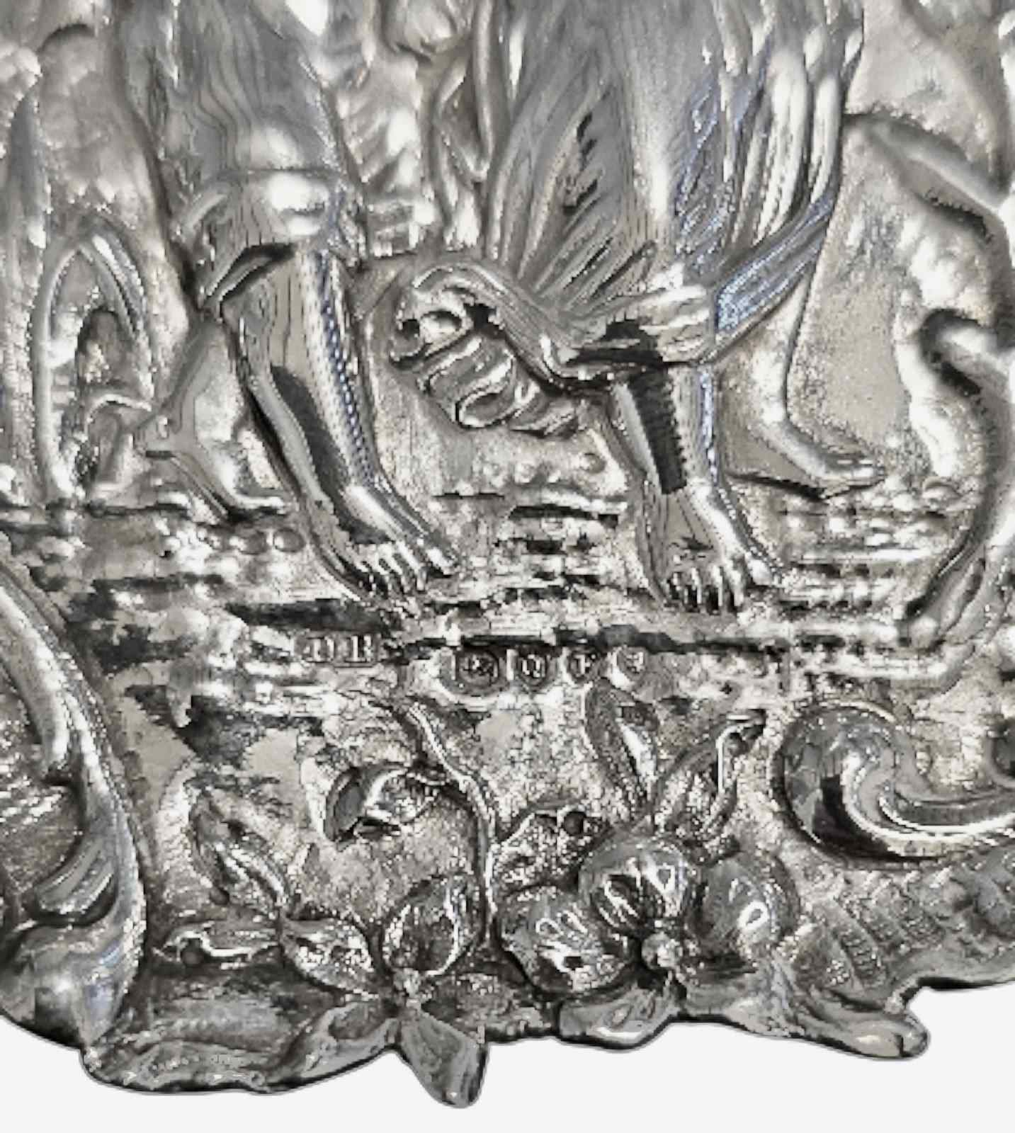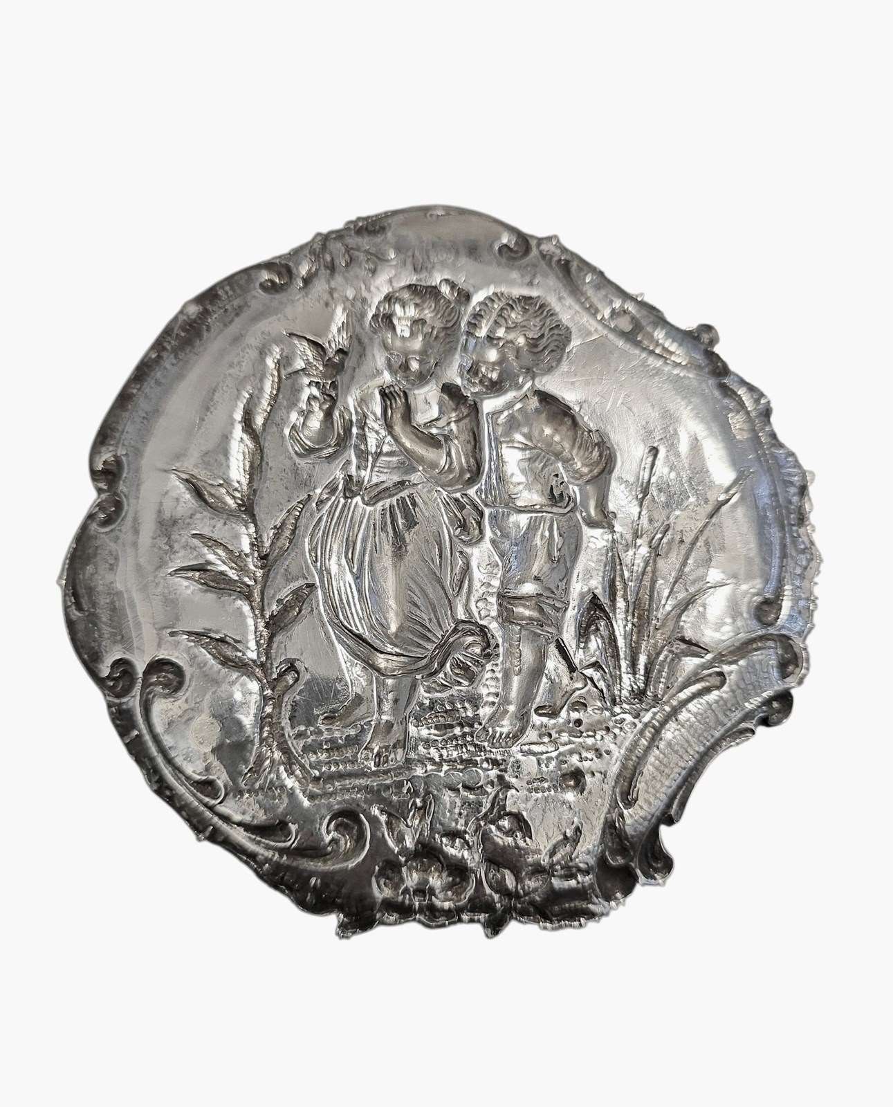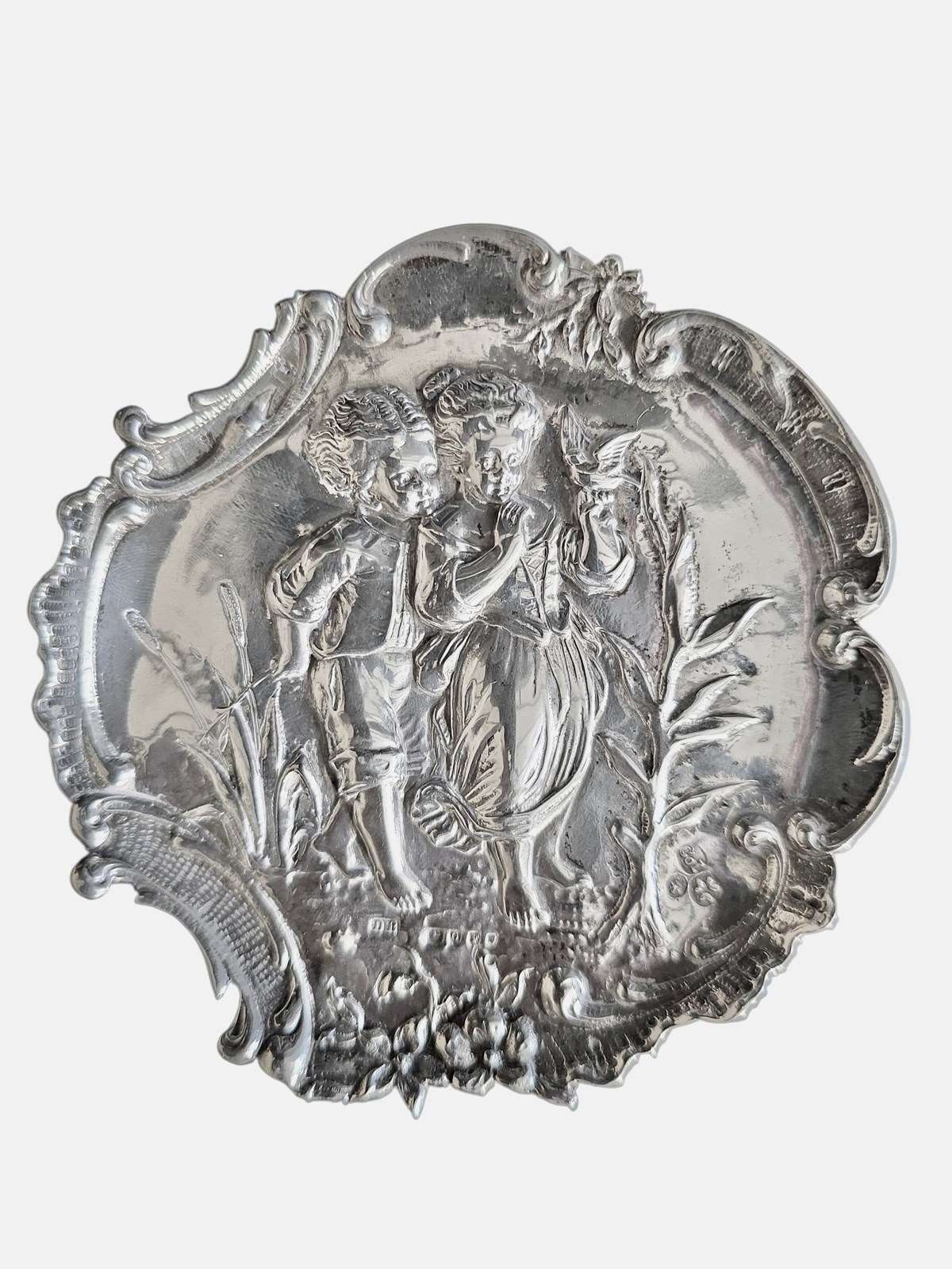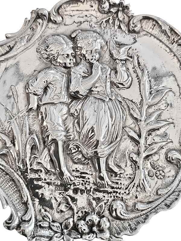 This has a beautiful antique sterling silver dish that was imported by David Bridge in 1891 and is very well designed with two figures looking at a bird on the young ladies hand. It has the original makers mark COI with what looks to be 3 hearts in a circle as the hallmarks from the silversmith. It looks French based on the scene depicted in the picture.