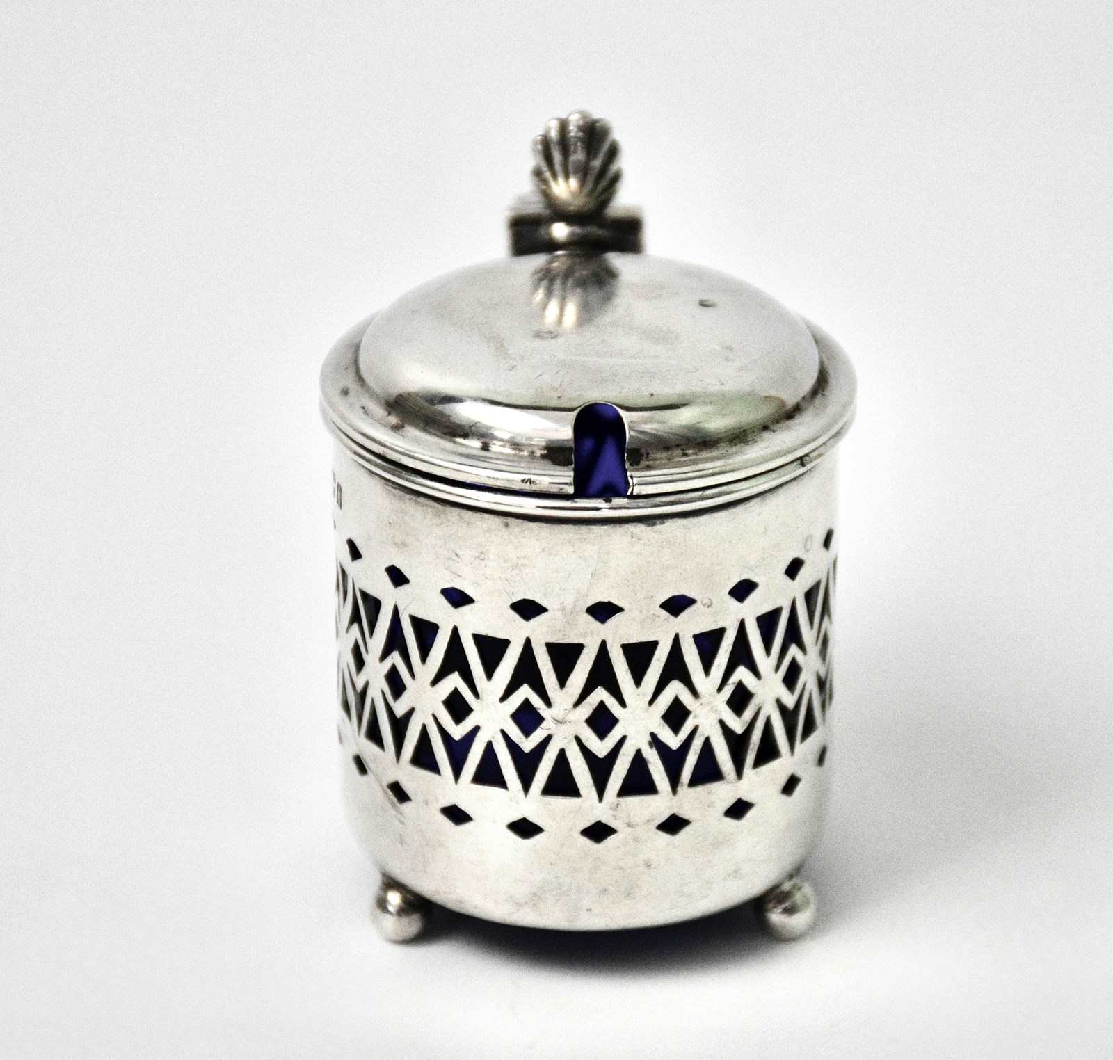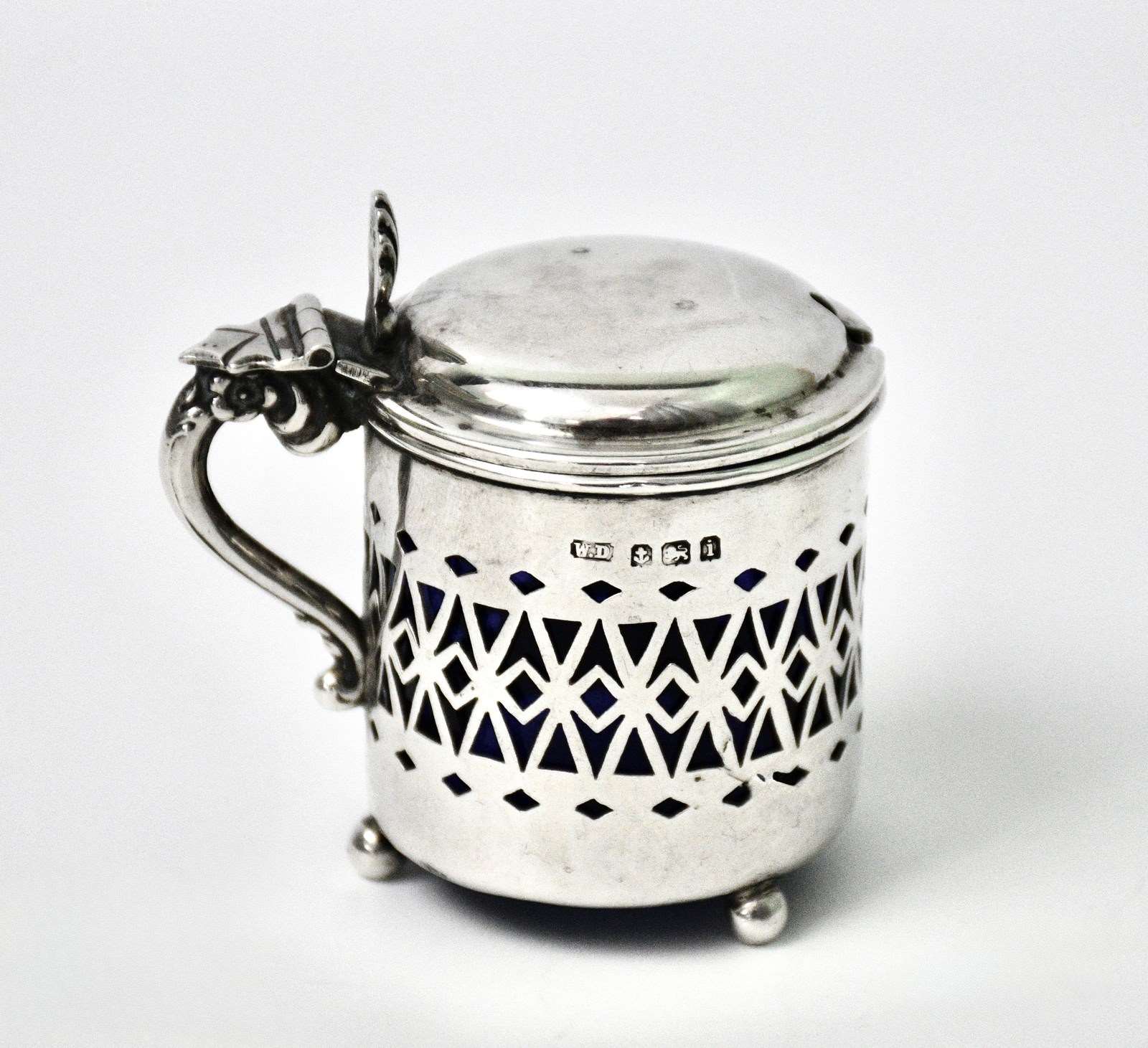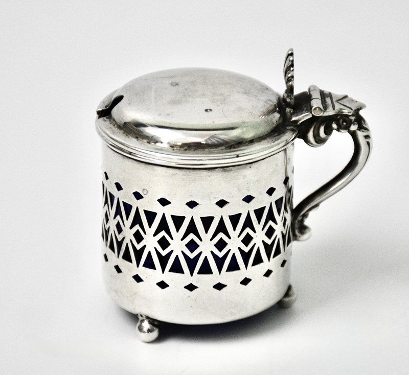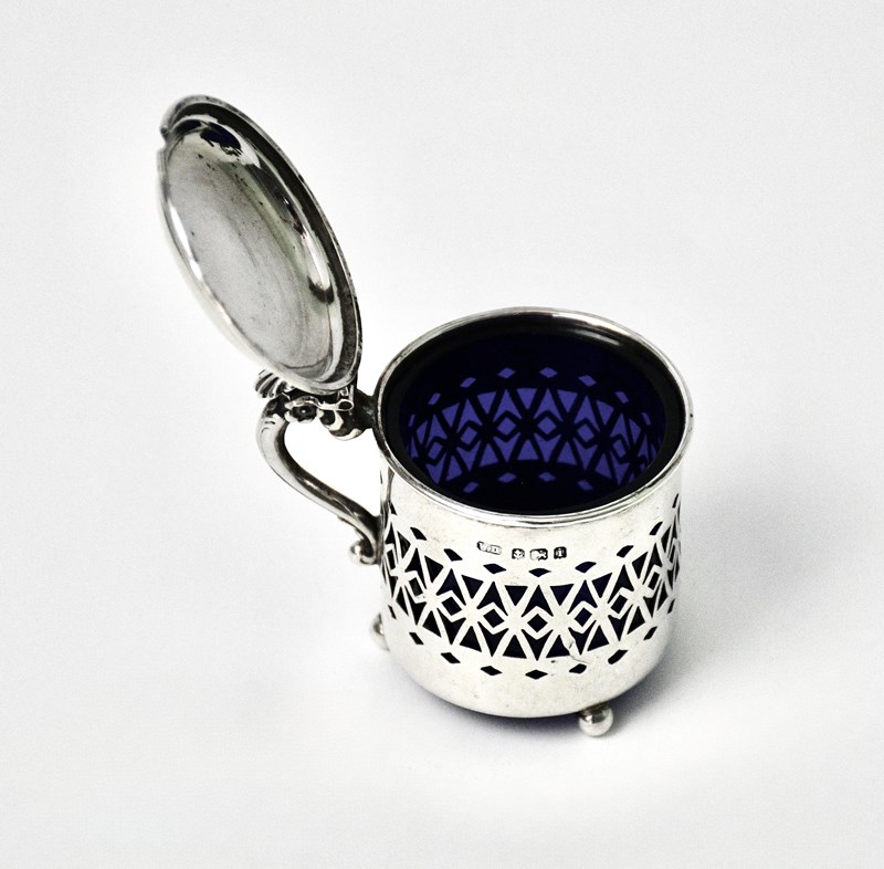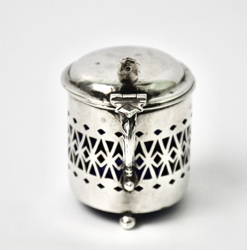 The Mustard pot and its blue glass liner are in very good condition with no damage, chips or restoration. It is well designed and has beautiful little ball feet for that extra bit of embellishment and measures 6 cm tall and 4 cm wide and weighs 13 grams without the Blue Glass Liner.