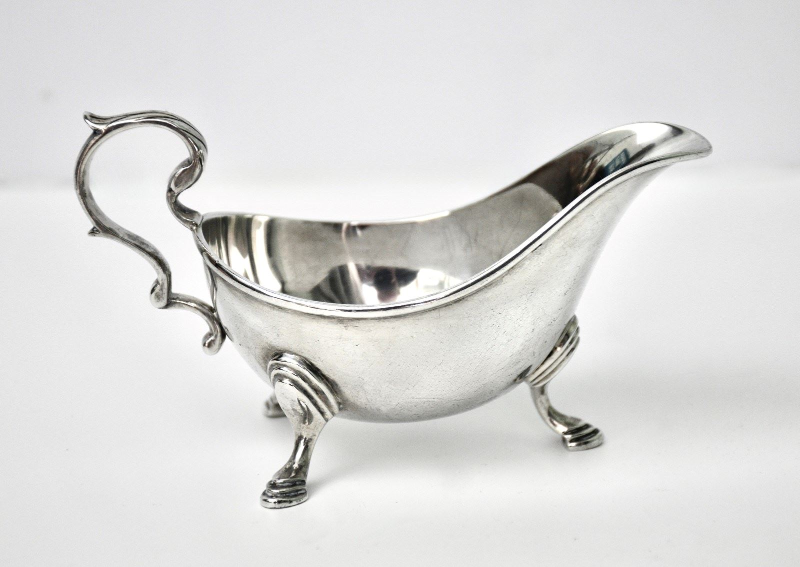 This beautiful antique sterling silver sauce boat made in London in 1903 by Thomas Goodfellow is a stunning example of his work. It is crafted from sterling silver and embodies the stylish and elegant design typical of antique silverware. This sauce boat is a fine example of British craftsmanship from the early 20th century, adding a touch of luxury and sophistication to any dining table.
