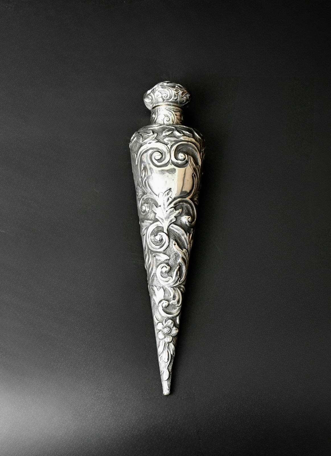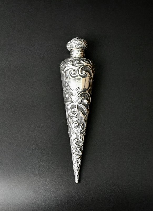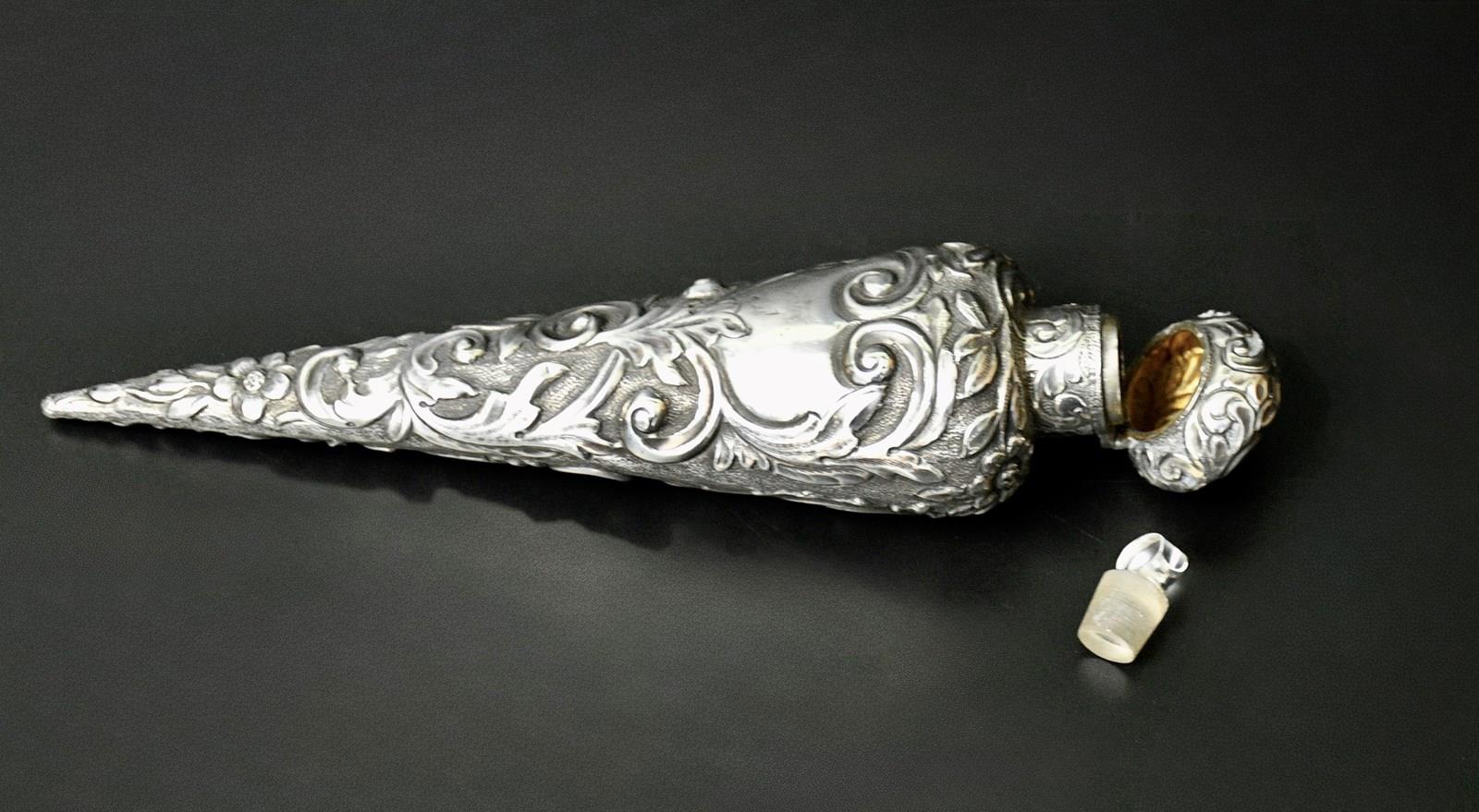 This Beautiful Conical Shaped Antique Sterling Silver Scent Bottle by Horton & Allday, hallmarked in Birmingham 1889 is a rare and elegant piece from the United Kingdom. it has a stunning scroll decoration with flowers and the cartouche is vacant. Crafted with precision and attention to detail, this collectable bottle features a stopper to preserve the fragrance. Perfect for collectors of vintage perfumes or those seeking a unique and stylish addition to their home decor, this silver scent bottle exudes old-world charm and sophistication.
