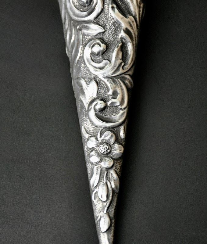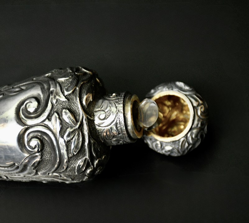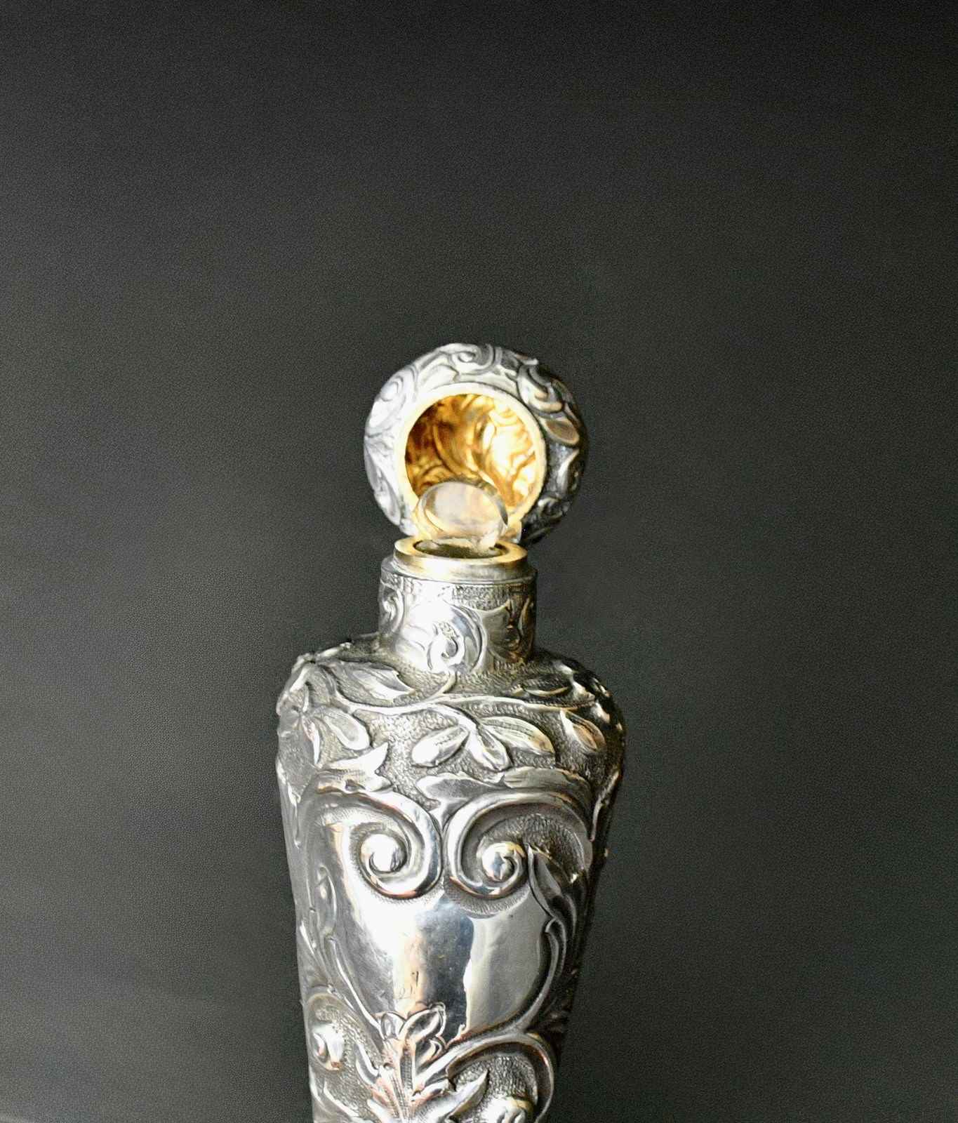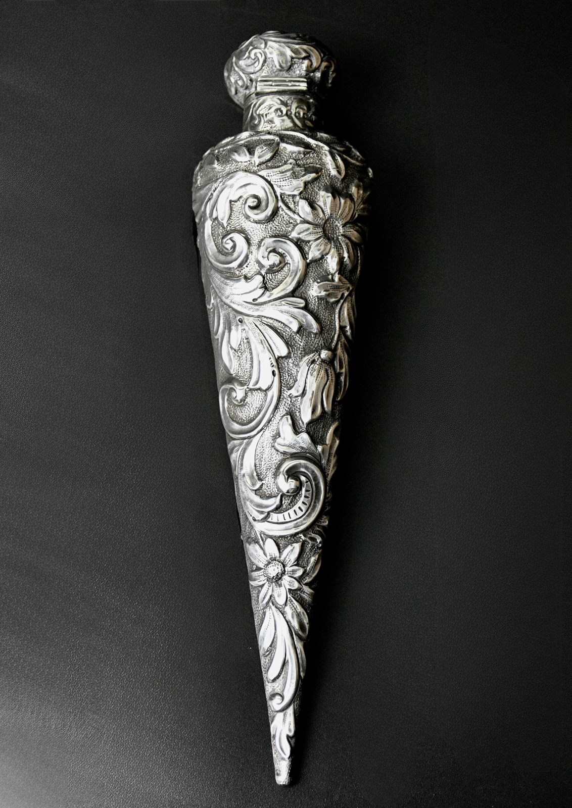 This Beautiful Conical Shaped Antique Sterling Silver Scent Bottle by Horton & Allday, hallmarked in Birmingham 1889 is a rare and elegant piece from the United Kingdom. it has a stunning scroll decoration with flowers and the cartouche is vacant. Crafted with precision and attention to detail, this collectable bottle features a stopper to preserve the fragrance. Perfect for collectors of vintage perfumes or those seeking a unique and stylish addition to their home decor, this silver scent bottle exudes old-world charm and sophistication.
