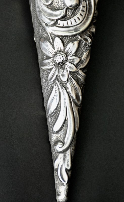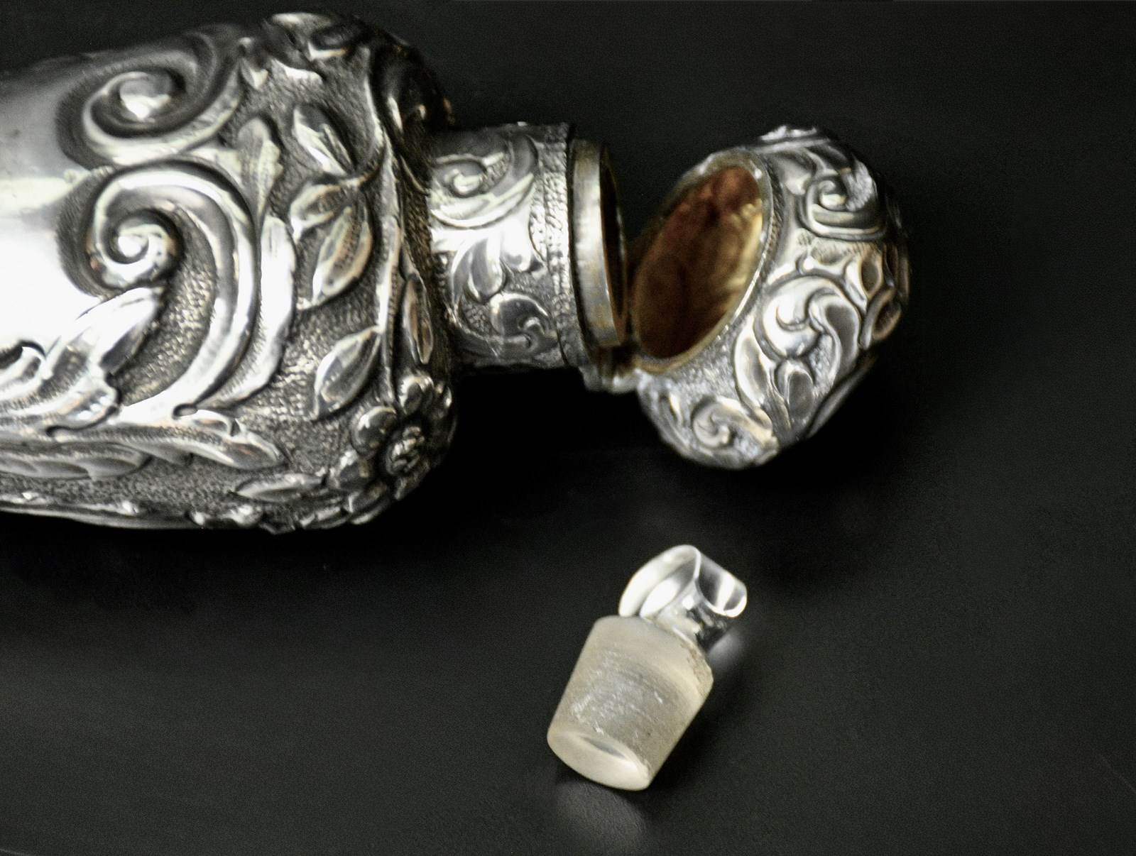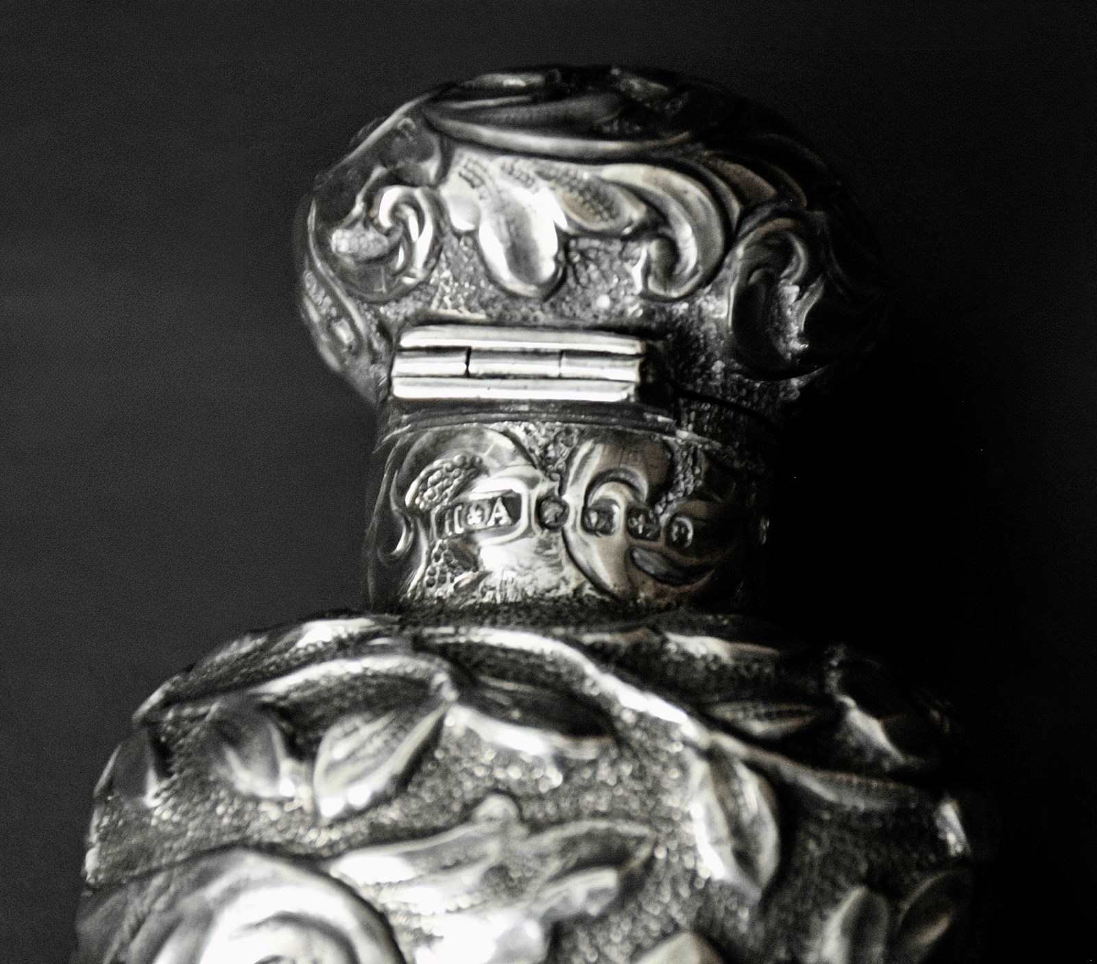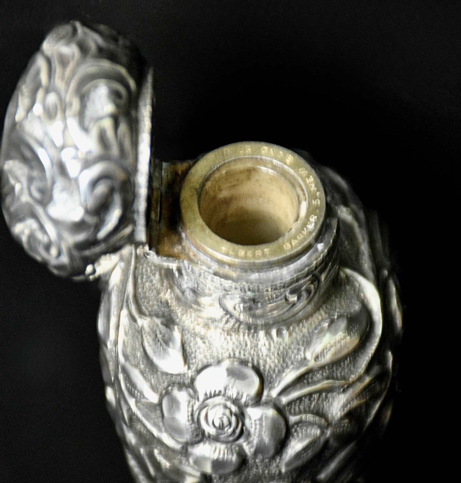 This scent bottle is a good size and a true statement piece. It has the retailers mark on the lid, around the collar of the glass stopper - which is in very good condition - no damage, and says "Albert Barker - 5 New Bond Street", It measures an impressive 19.5 cm long and 5 cm across the shoulder and weighs 134 grams without the glass stopper.