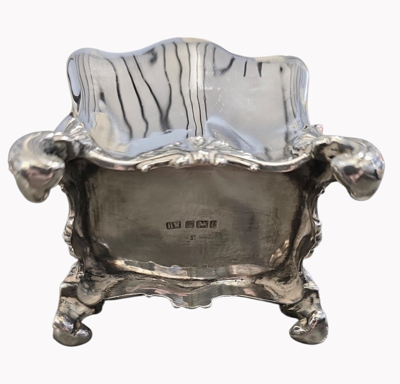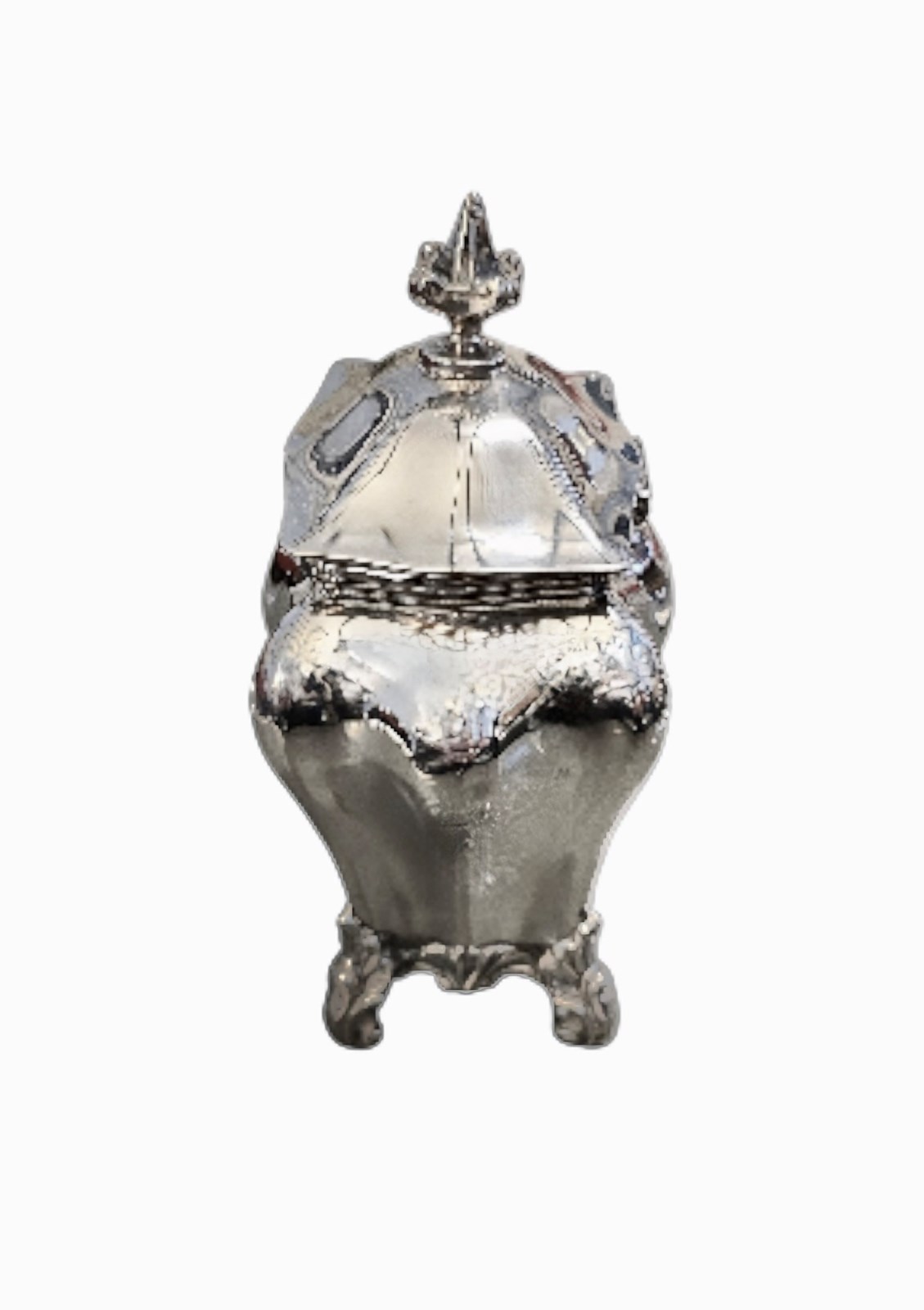 The tea caddy is in excellent condition with no restoration and only has a very small ding on the shoulder on one side that does not detract from the piece and you have to be looking for it. (see photo's for more details). It measures 14 cm tall, 9.5 cm wide across the front and 7 cm from front to back and very sturdy. it weighs an impressive 220 grams of Sterling Silver.