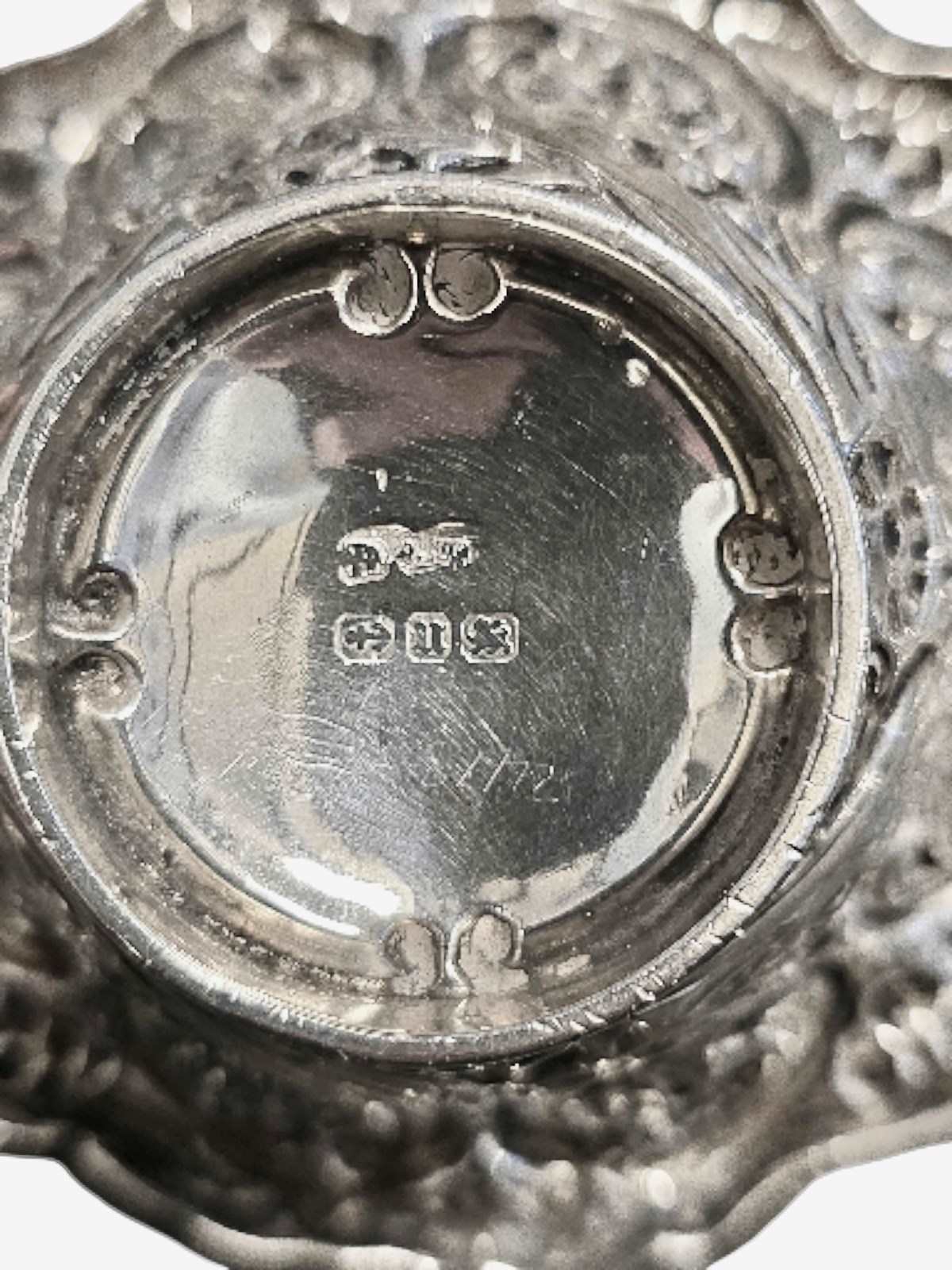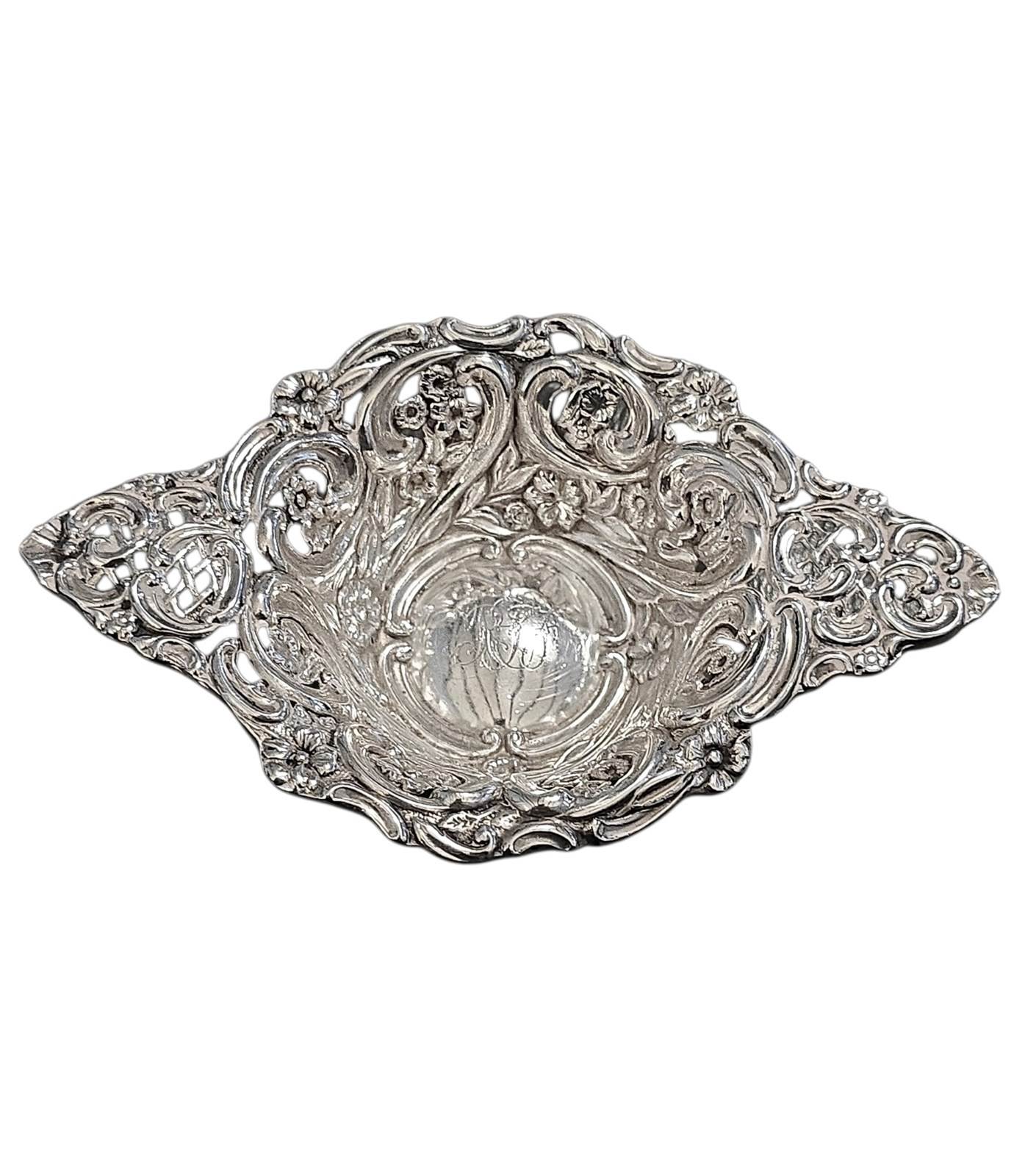 This beautiful small antique sterling silver Victorian bonbon or sweetmeat dish hallmarked Birmingham 1894 is a stunning example of Victorian-era craftsmanship. With a floral pierced decoration, this sterling silver dish exudes elegance and charm. Made in the United Kingdom during the Victorian era, this piece showcases the intricate design and attention to detail characteristic of that time period. Perfect for serving sweets or candies, this antique dish is a beautiful addition to any collection of silverware or antique items.