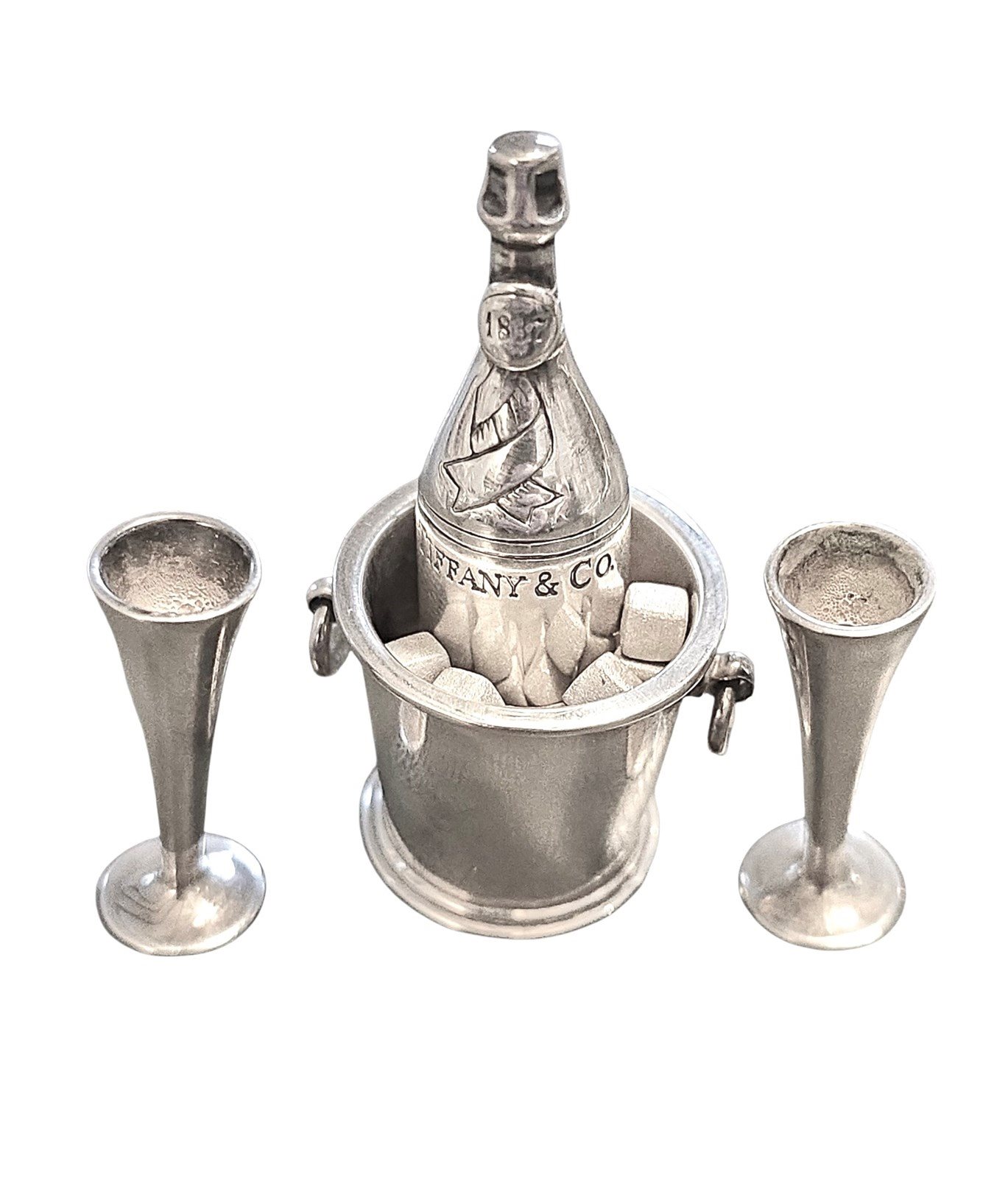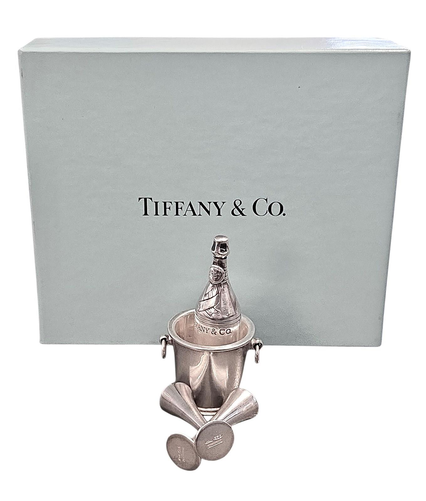 Silver Miniature Tiffany & Co Champagne Bottle, Bucket, 2 Flutes & Ice Cubes