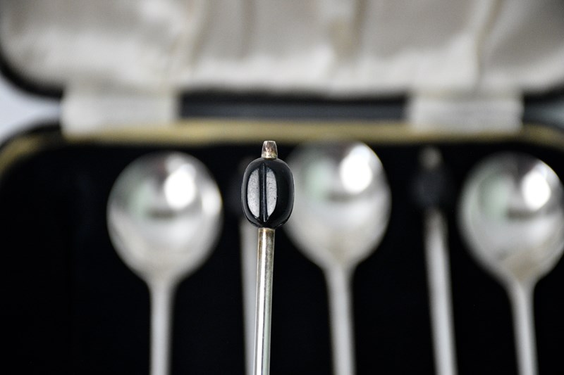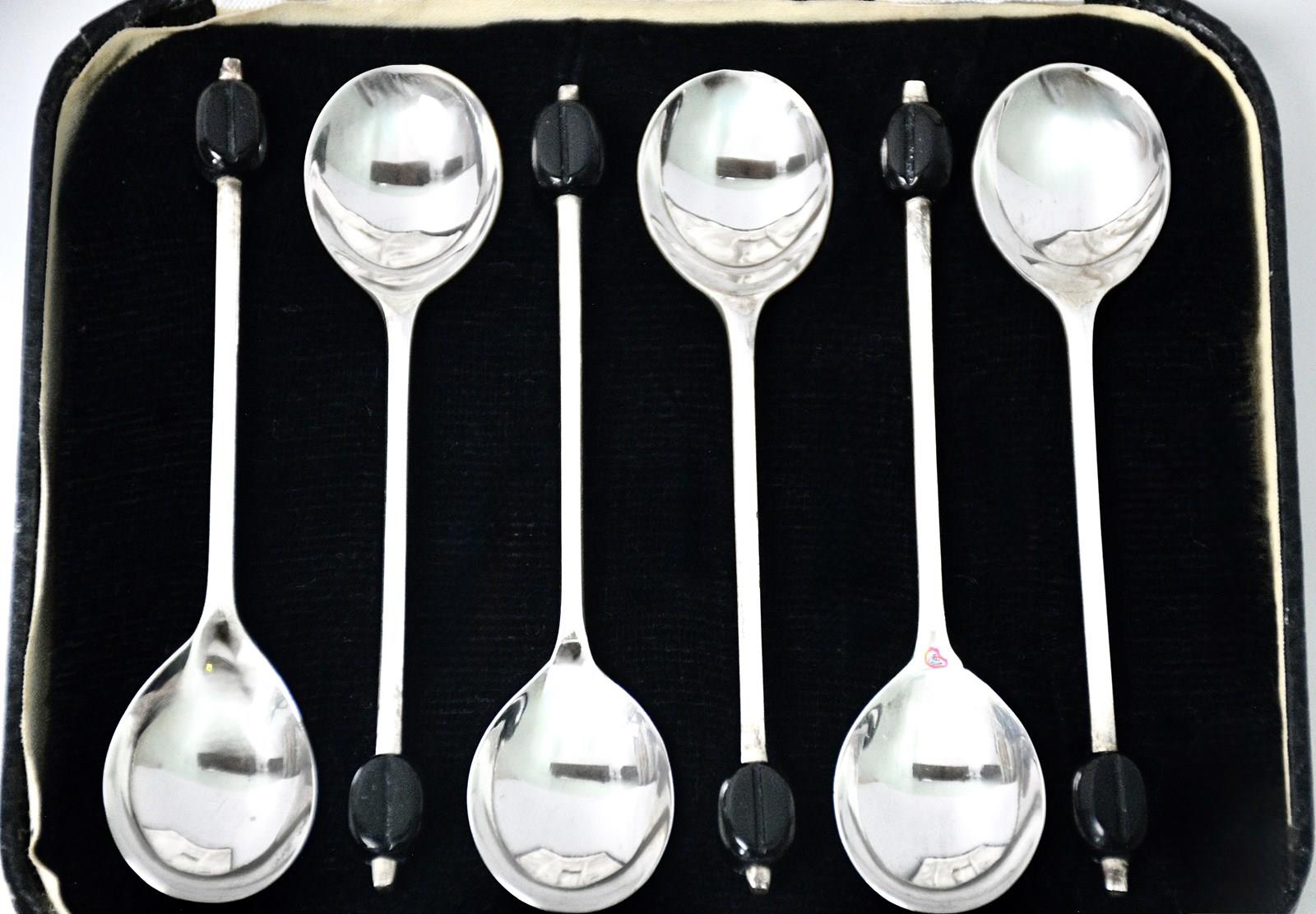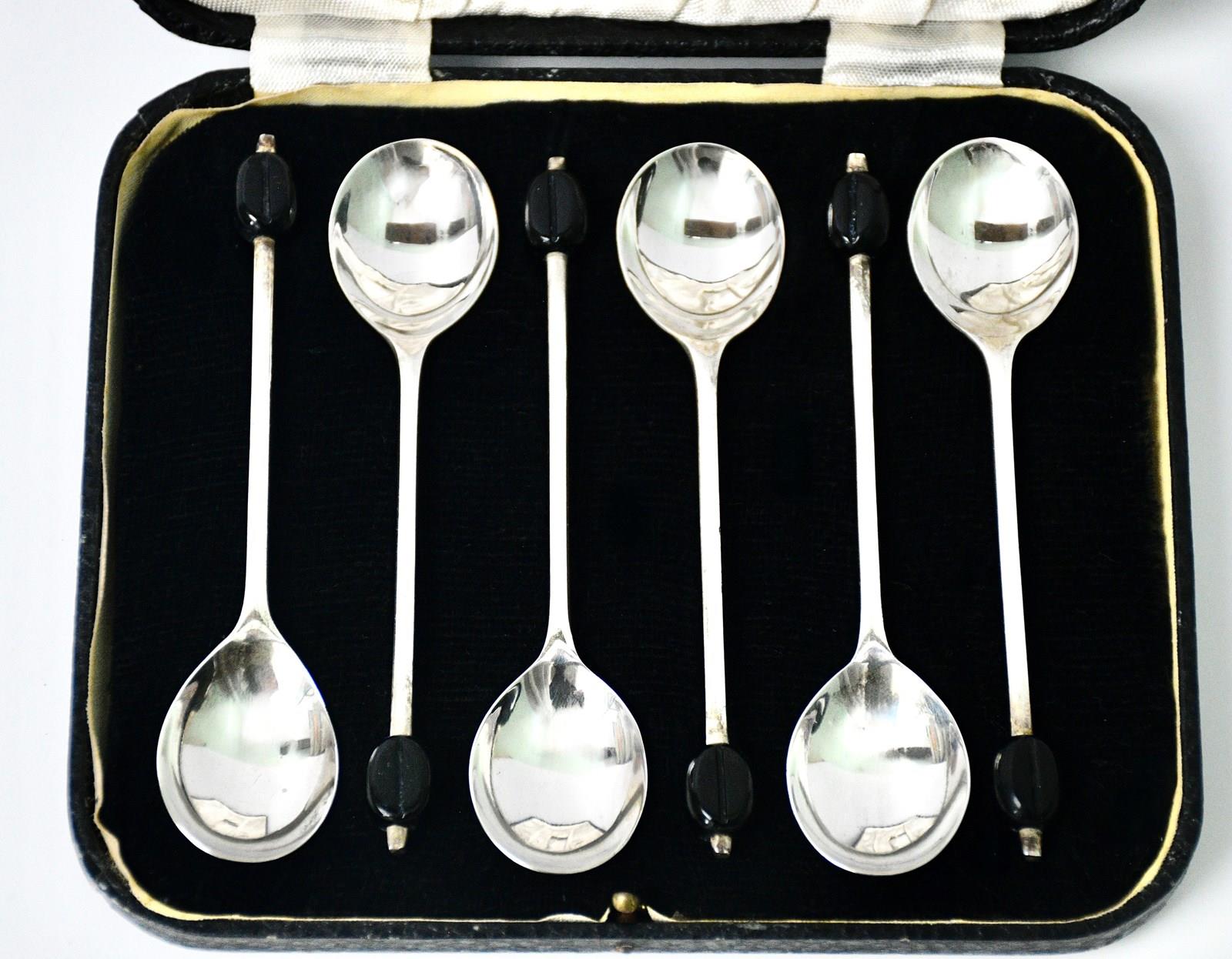This set of 6 sterling silver coffee spoons by Viners features a unique coffee bean finial design, crafted from sterling silver in Sheffield in 1957. The original box adds to the antique charm of these elegant spoons, making them a beautiful and practical addition to any coffee lover's collection. These high-quality spoons are a testament to the craftsmanship and attention to detail that Viners is known for, showcasing a classic British style that will never go out of fashion.