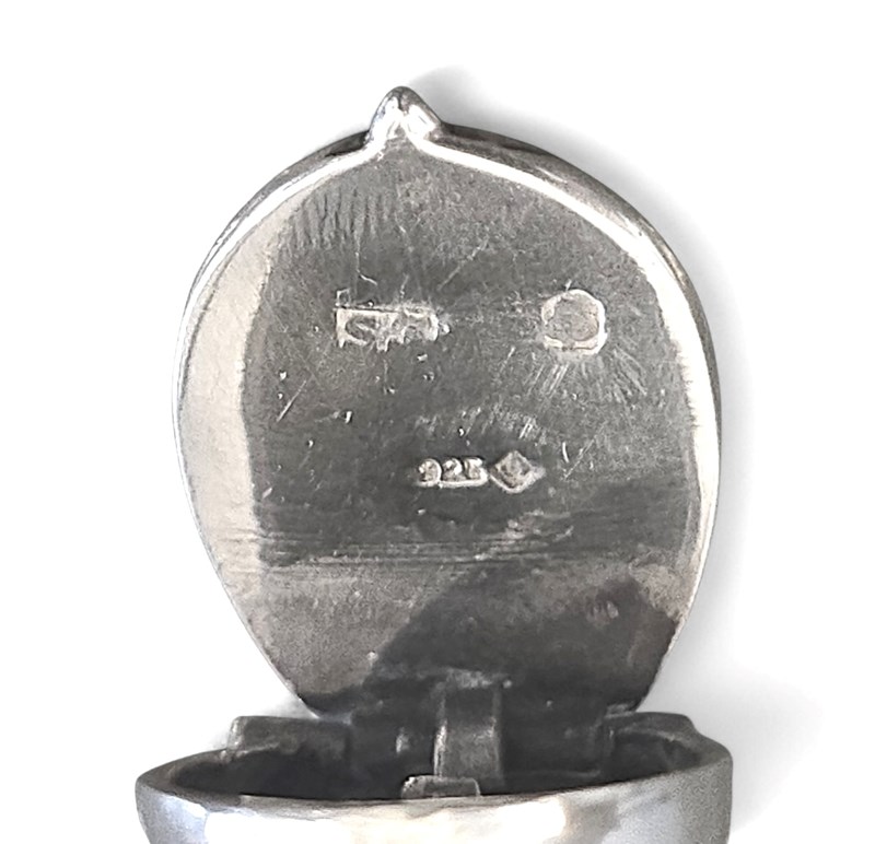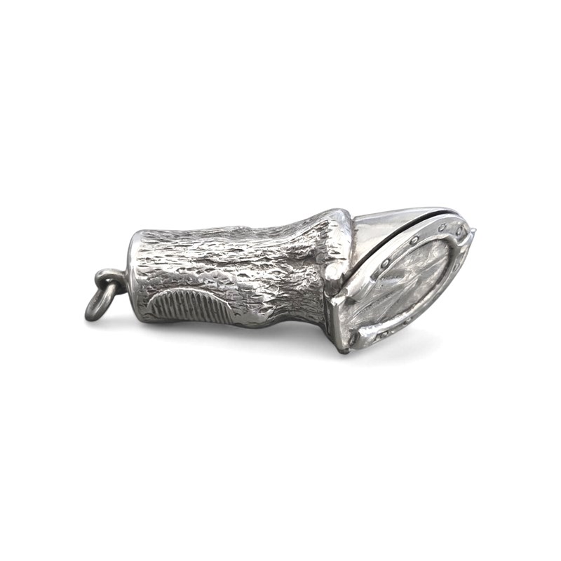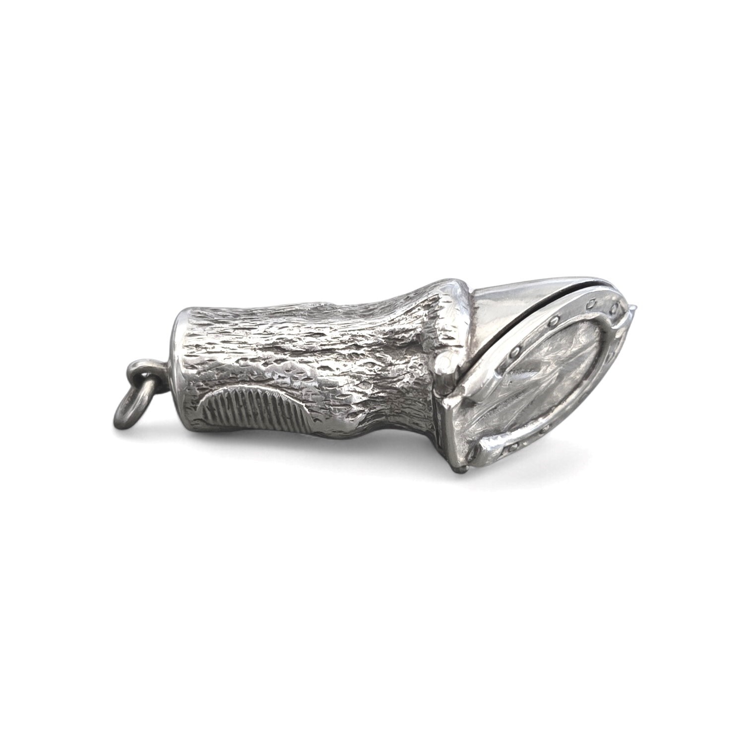 This stunning and rare sterling silver Vesta case with a horseshoe lid, hallmarked .925 by ES, is a beautifully crafted piece of equestrian style. Made in the United Kingdom post-1940, this sterling silver cigarette/vesta case features a unique hoofed foot with horseshoe pattern, adding a touch of charm to any collection. The high-quality craftsmanship and elegant design make it a timeless and stylish accessory for any horse lover or antique enthusiast to keep your matches dry.