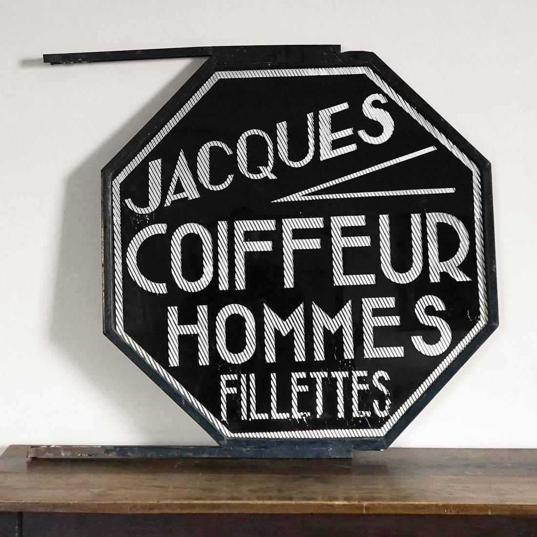 Vintage hairdressers advertising sign 'Jaques Coiffeur Hommes Fillettes'.