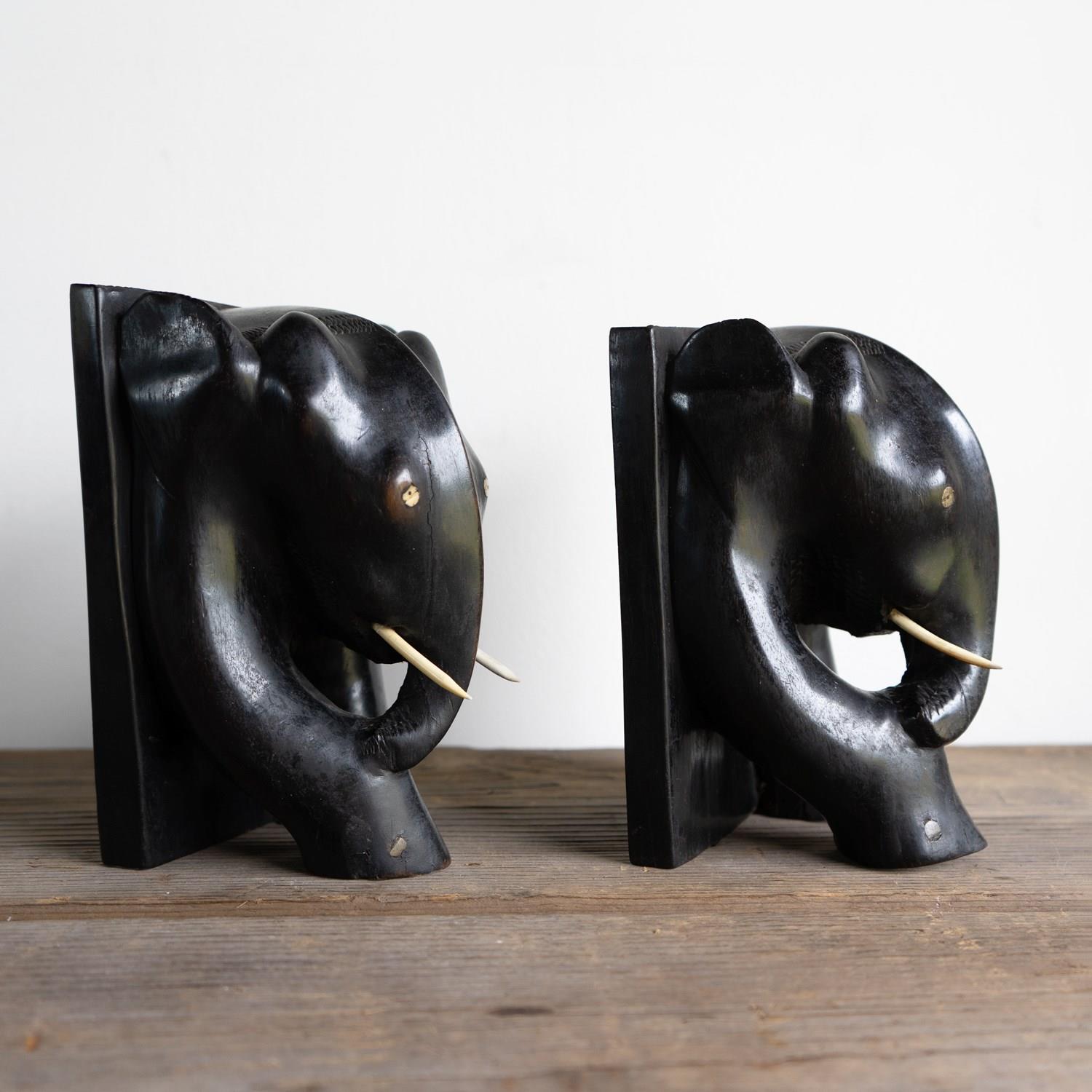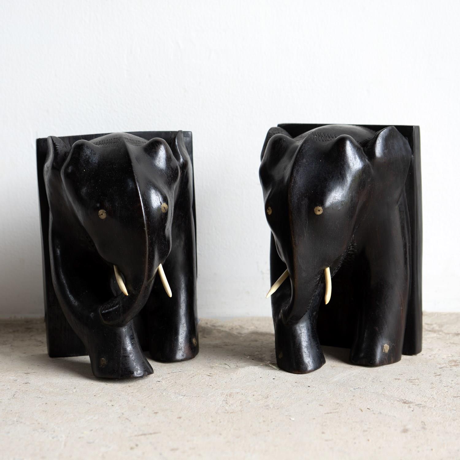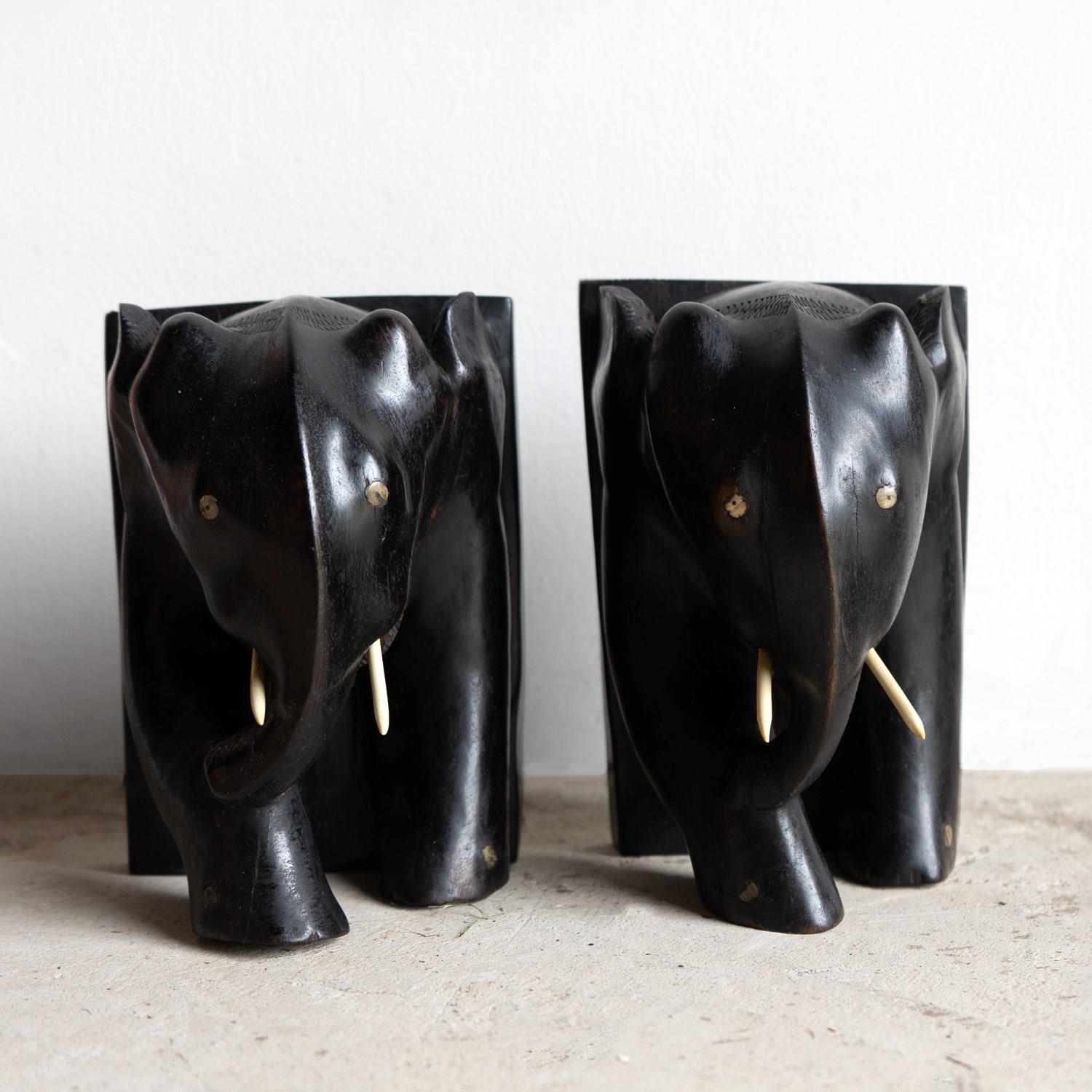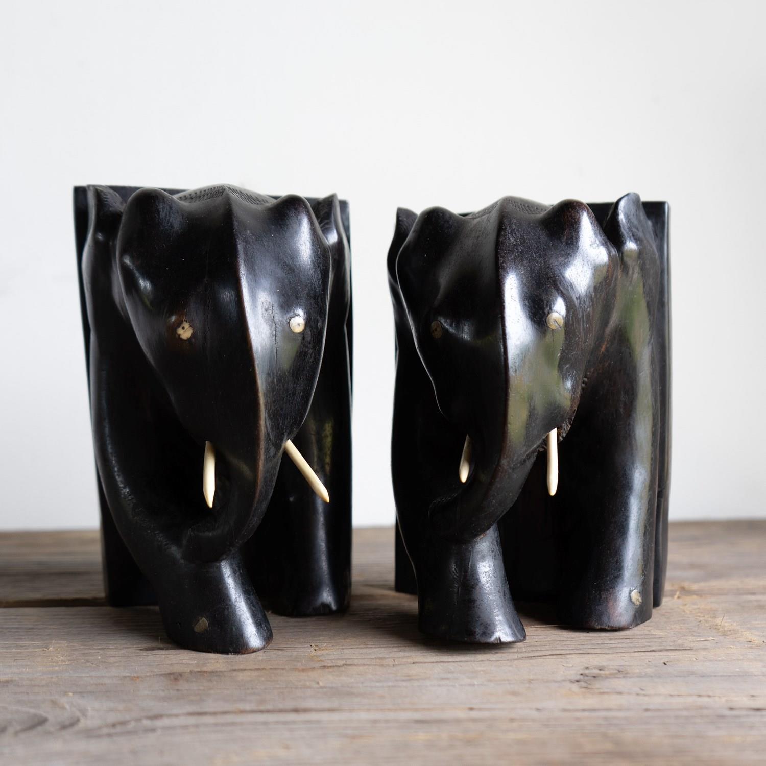 A charming and stylish pair of ebony bookends in the form of two elephants depicted in a somewhat stylised manner.
