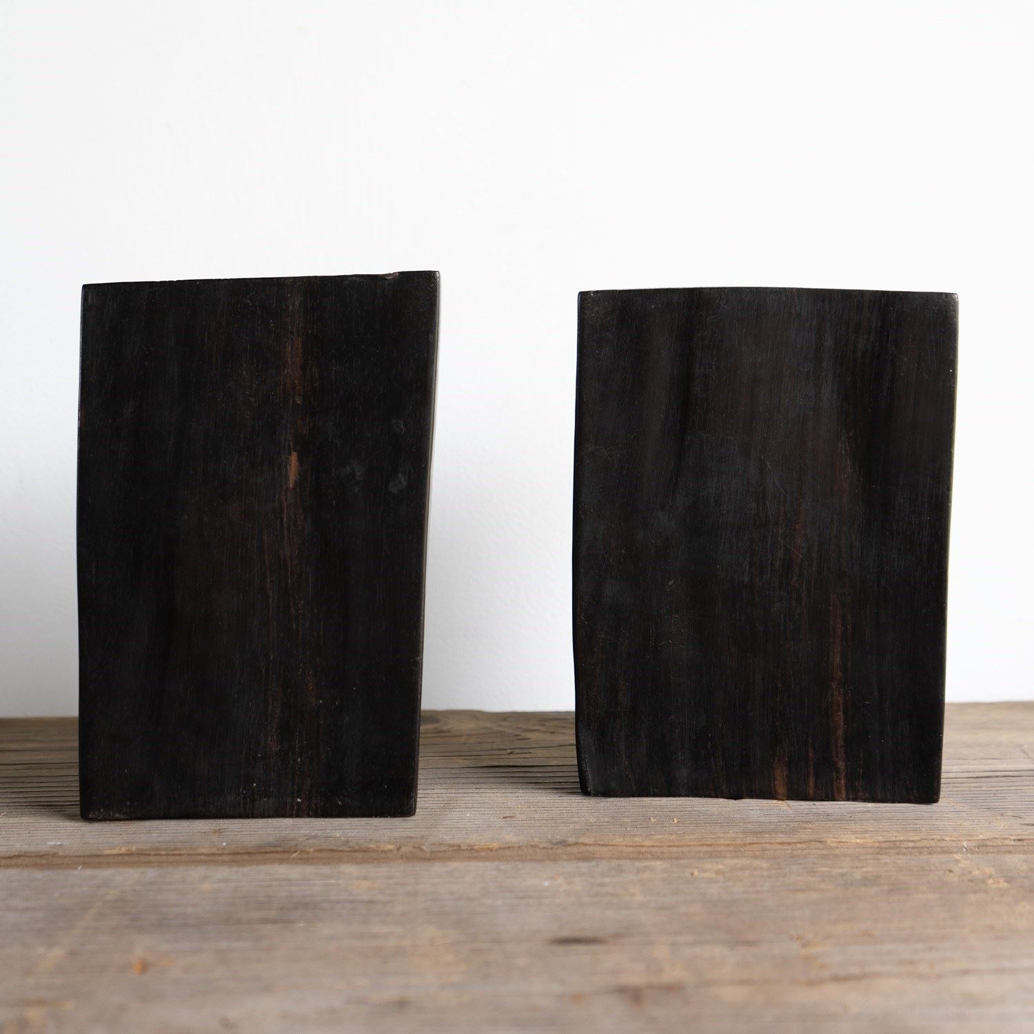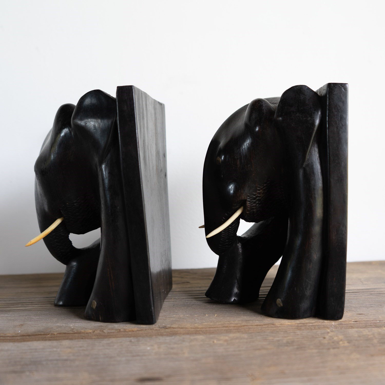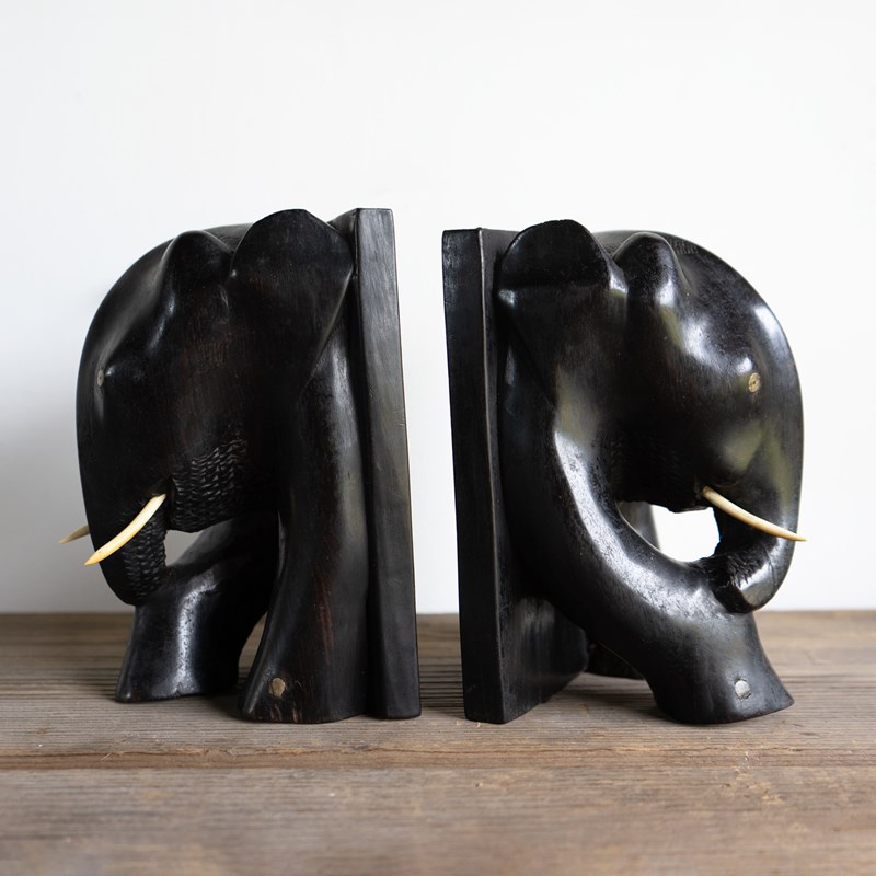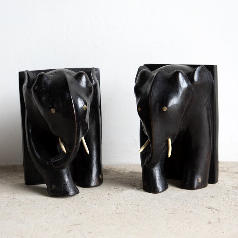A charming and stylish pair of ebony bookends in the form of two elephants depicted in a somewhat stylised manner.