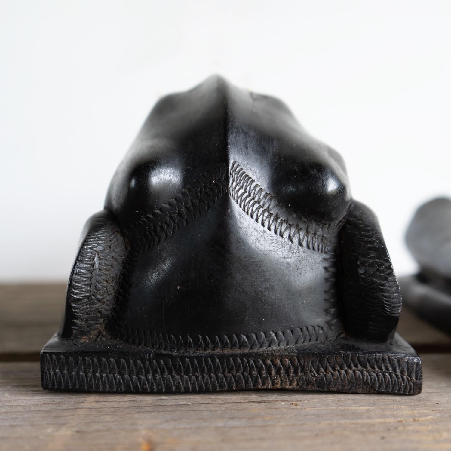 Each one is hand-carved from a single piece of ebony, mostly polished with some scratch carving to add decoration and definition in places.