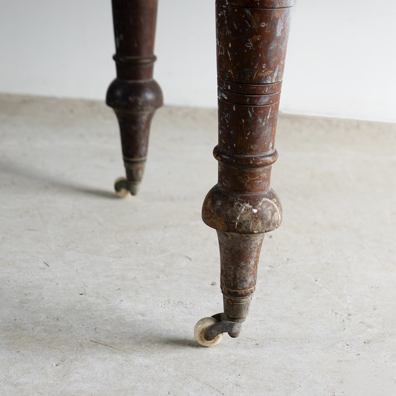 With two usable drawers and turned legs raised on its original brass and ceramic castors.