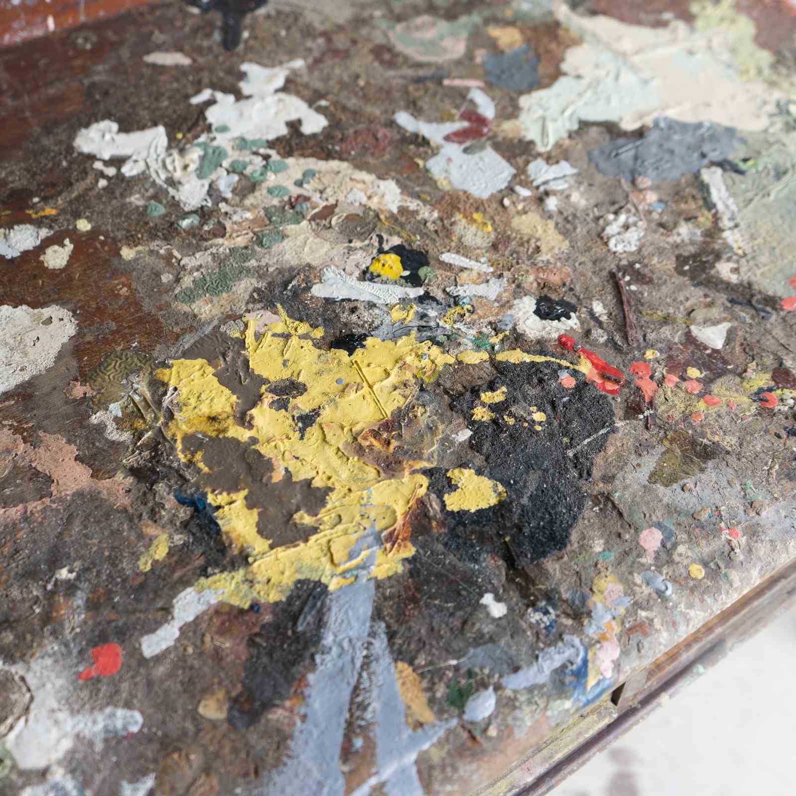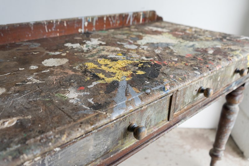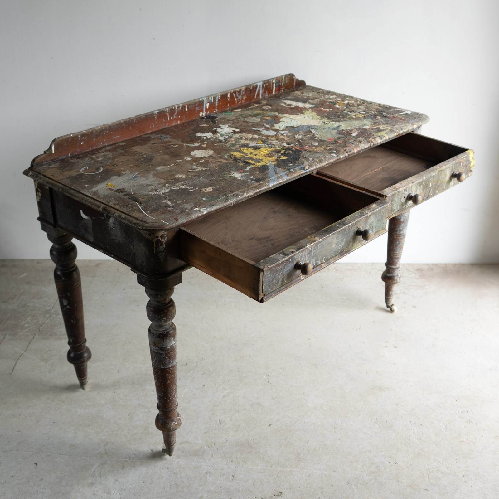The table is structurally sound and still very usable. There is wear throughout consistent with its studio use. It has lived a life, and this wear makes it what it is and tells its story. Most areas are covered in paint, and there are some battered areas, etc. The drawer handles are later replacements, and there are some honest repairs.
