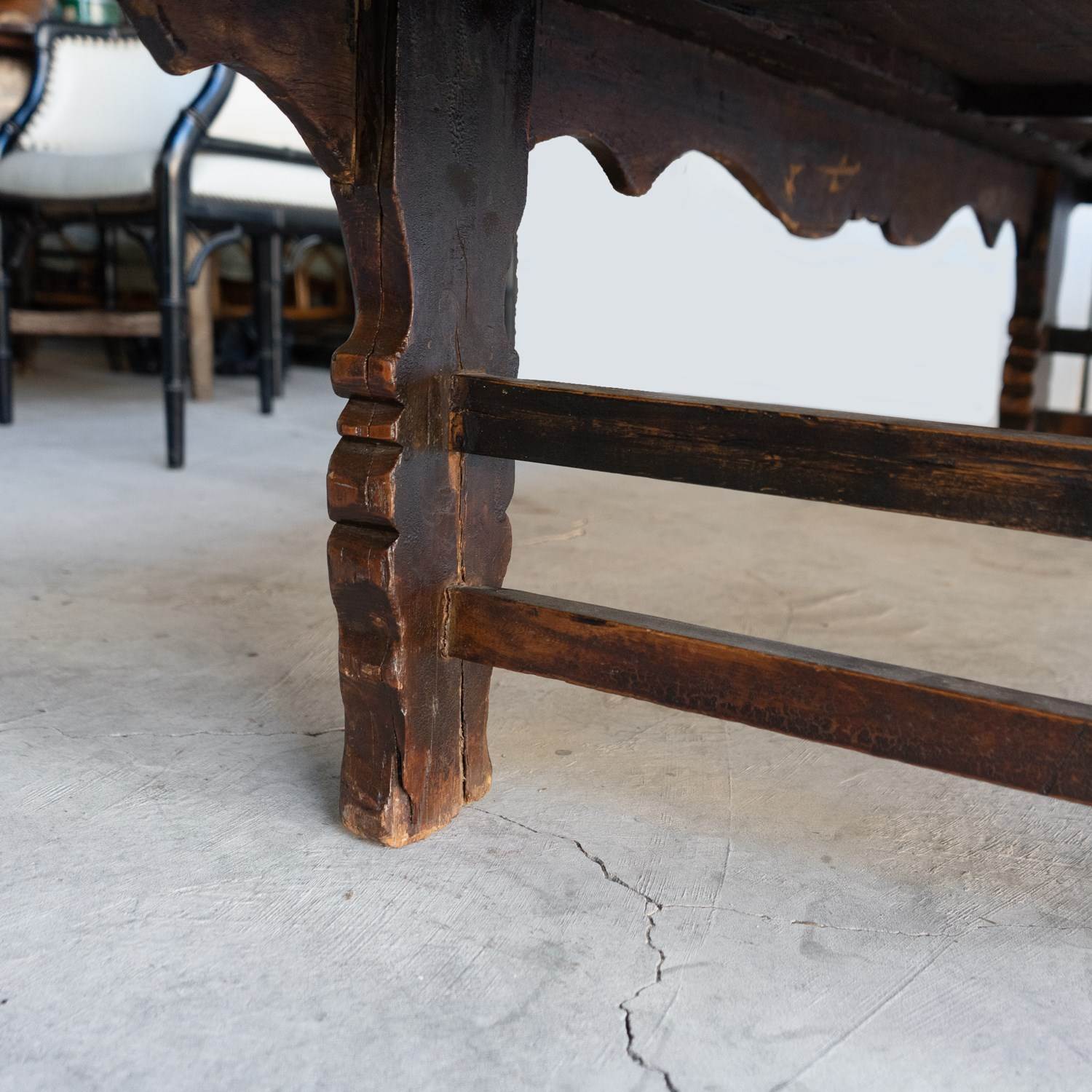 It is in good vintage condition with wear commensurate with age. The table feels sturdy and solid. The timber has been naturally worn over the years form use including some splits, repairs, some minor losses and there is an overall worn rustic feel to the piece.