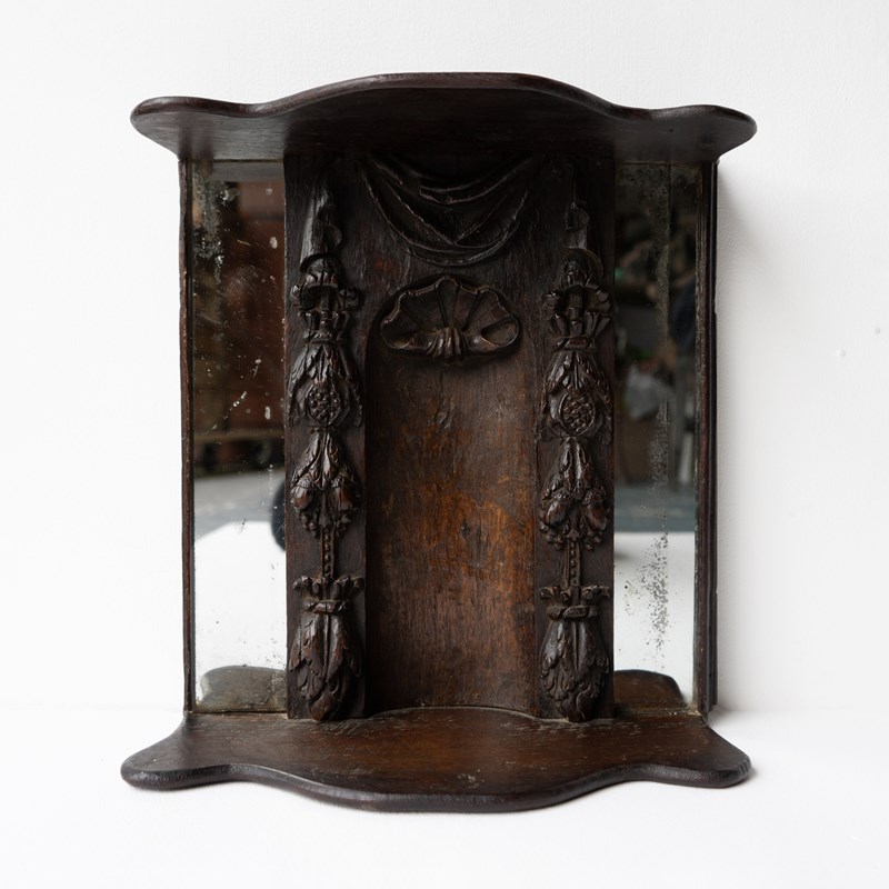 Antique Early Oak Carved Panel Niche, Wall Mounted Mirrored Shelf, 17Th Century
