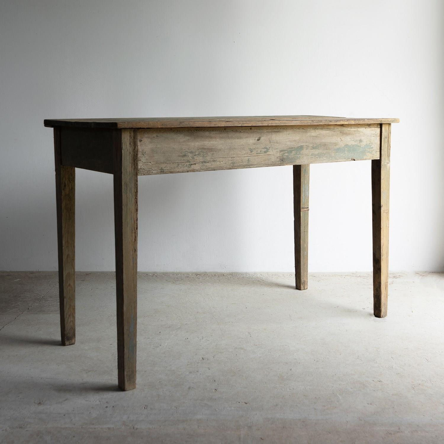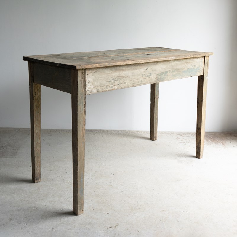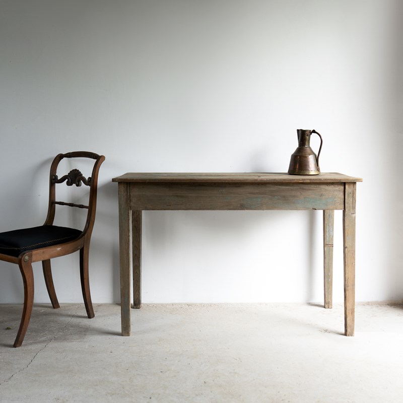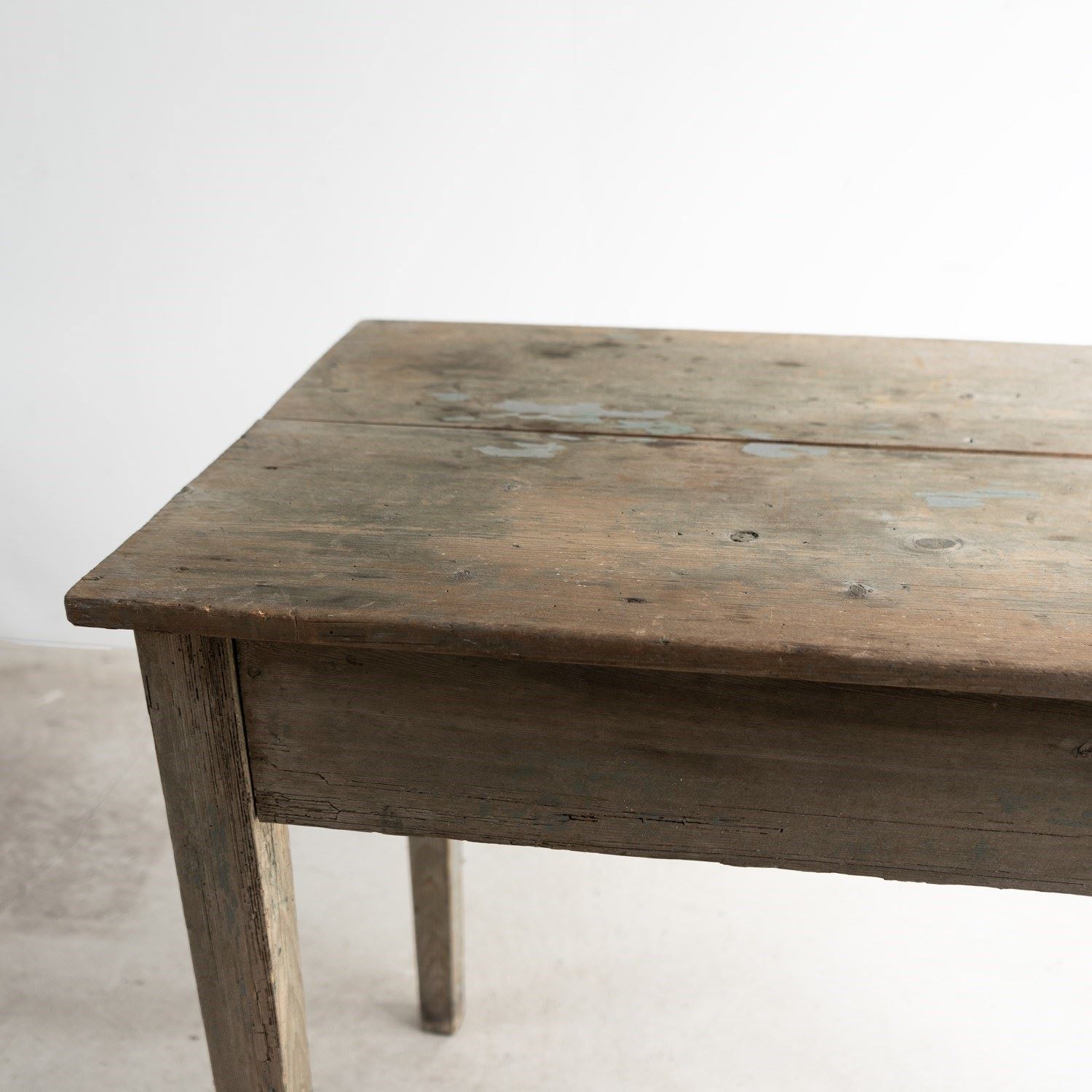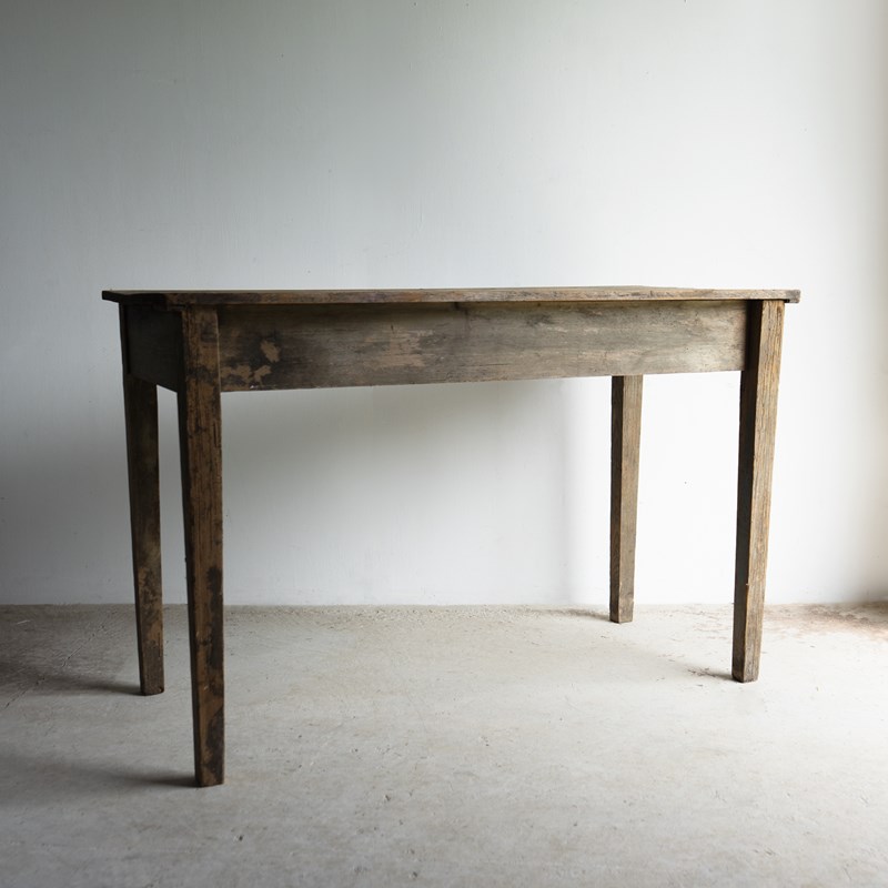 An antique side table, constructed of pine with tapered square legs, casting a simple and stylish silhouette.