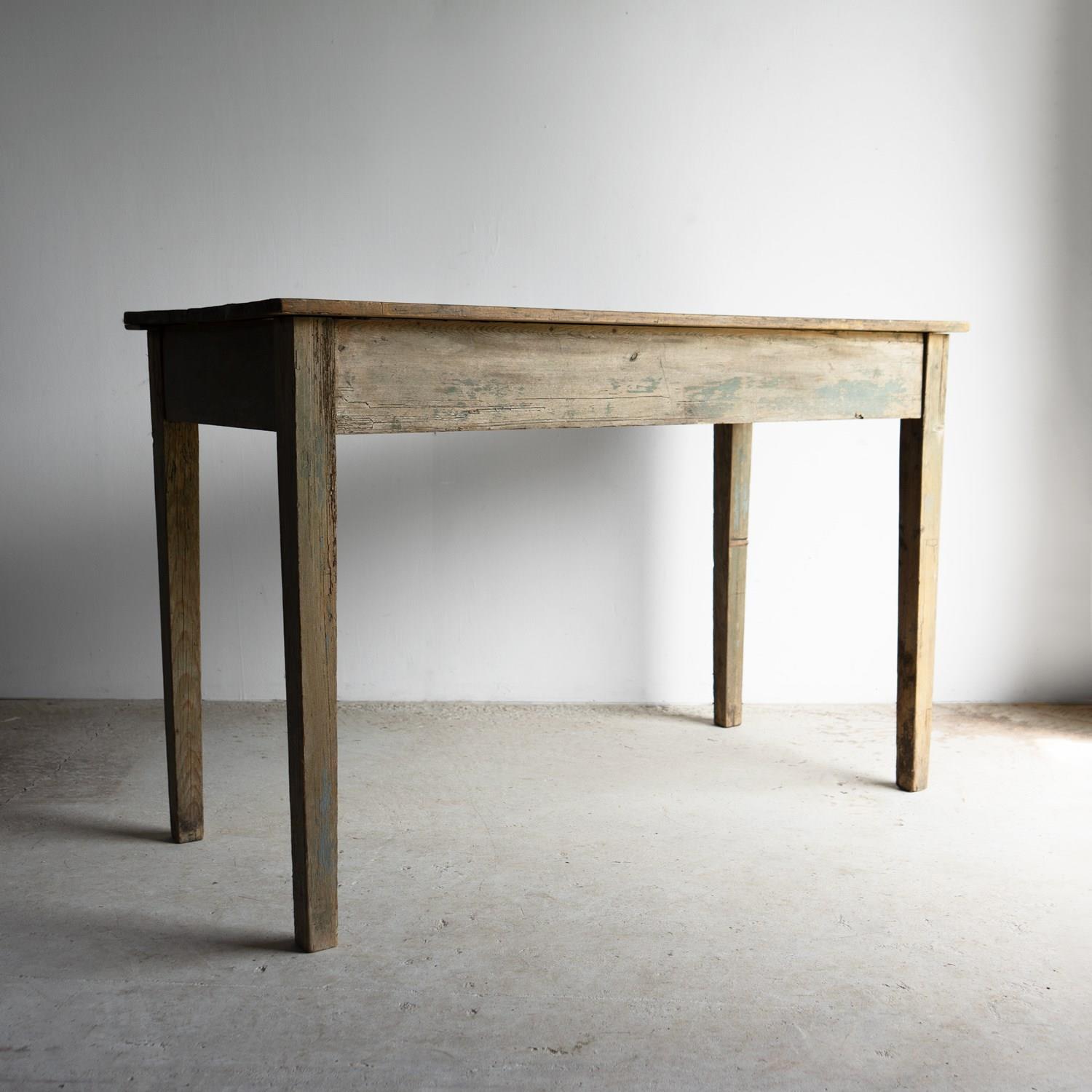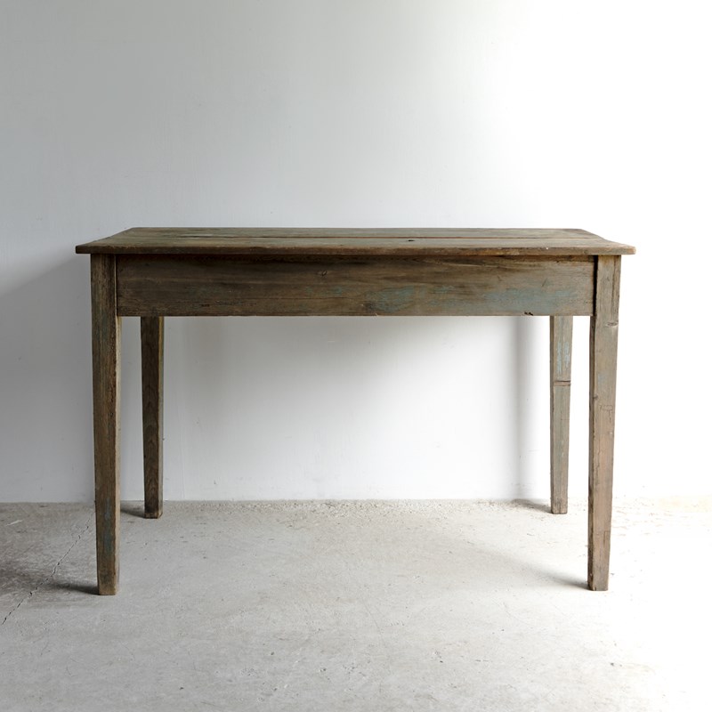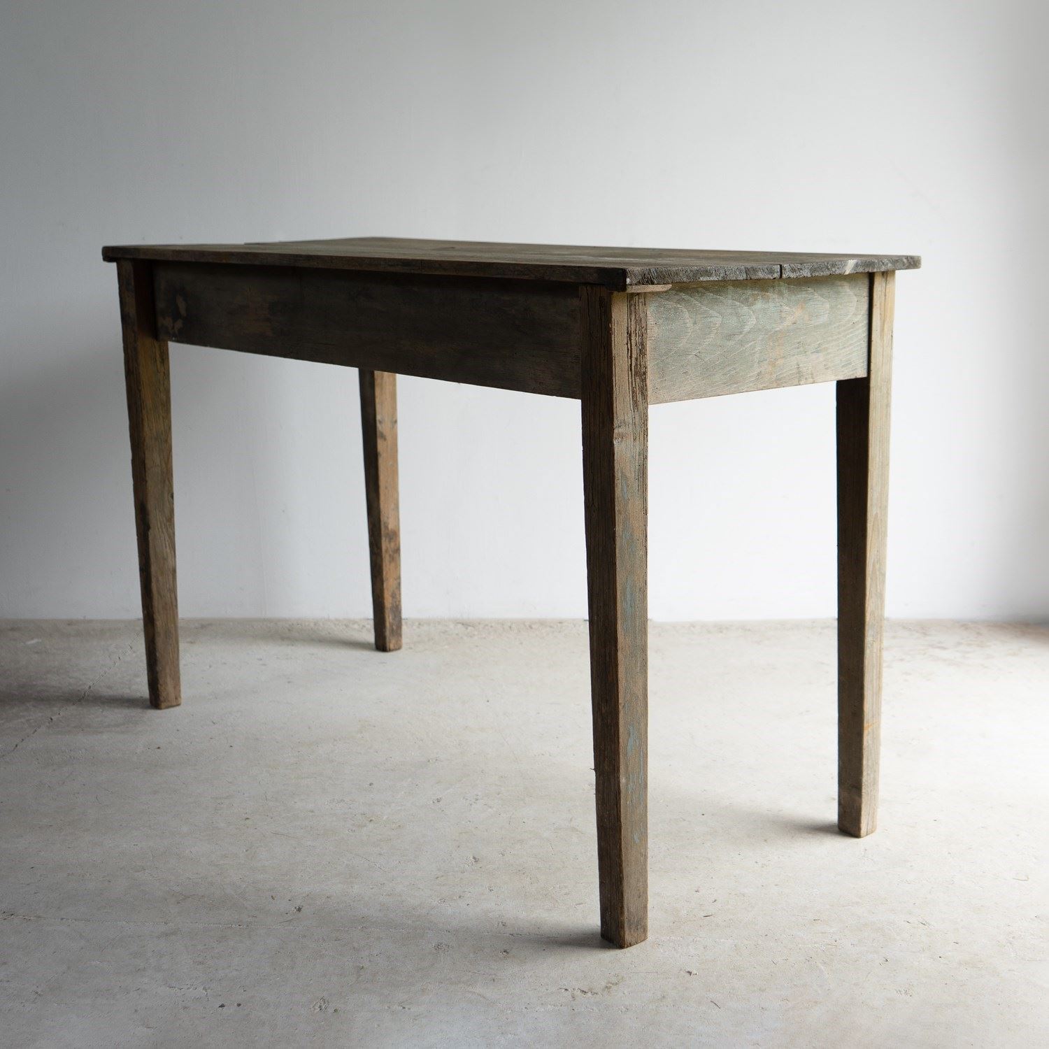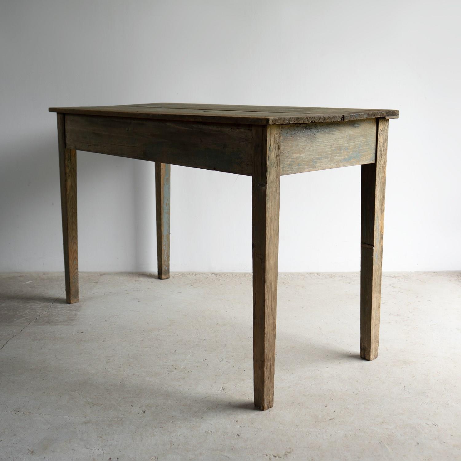 An antique side table, constructed of pine with tapered square legs, casting a simple and stylish silhouette.