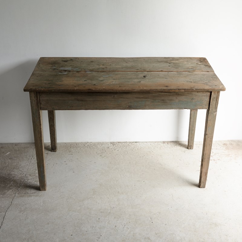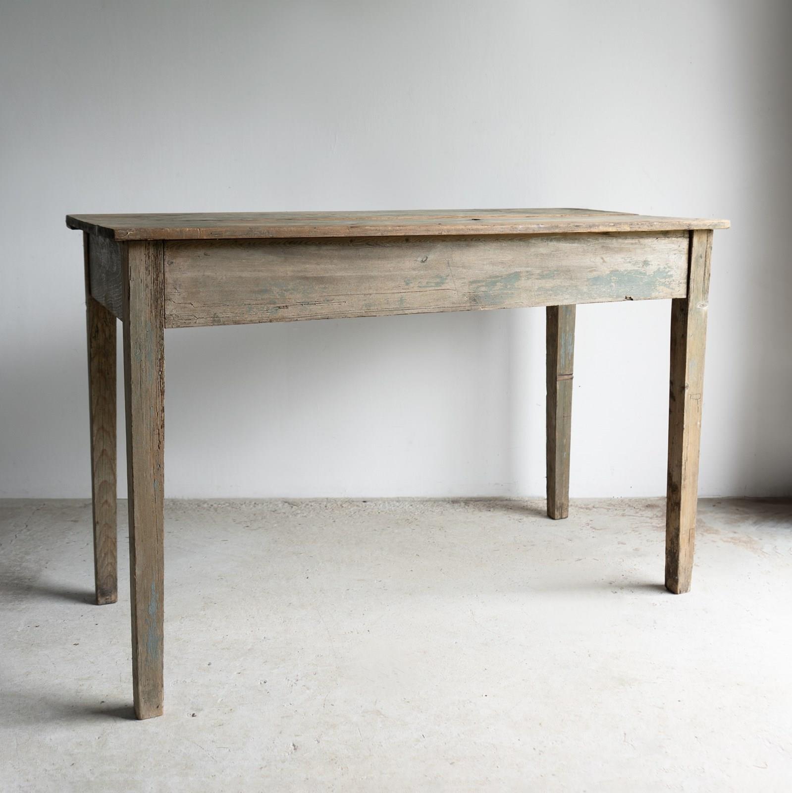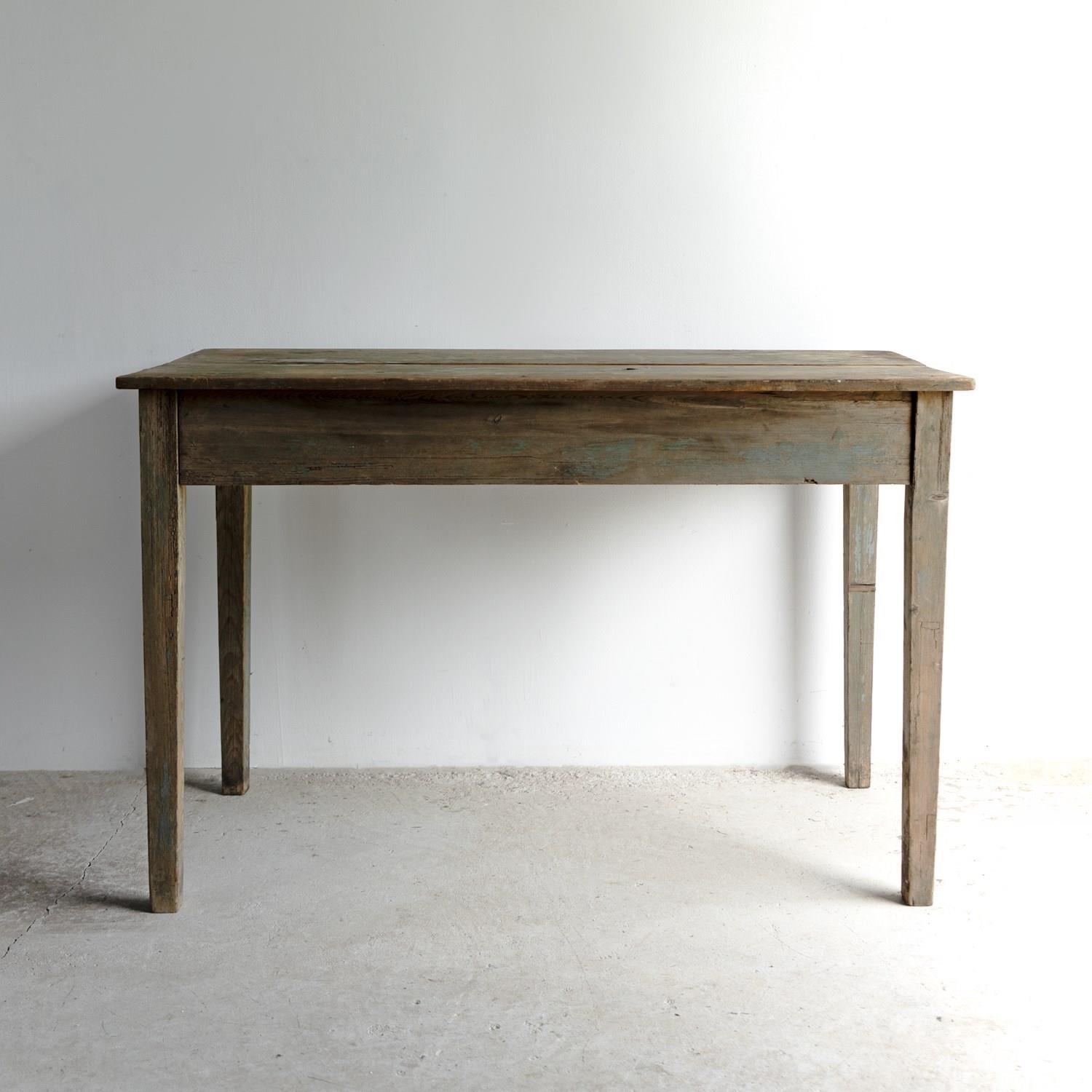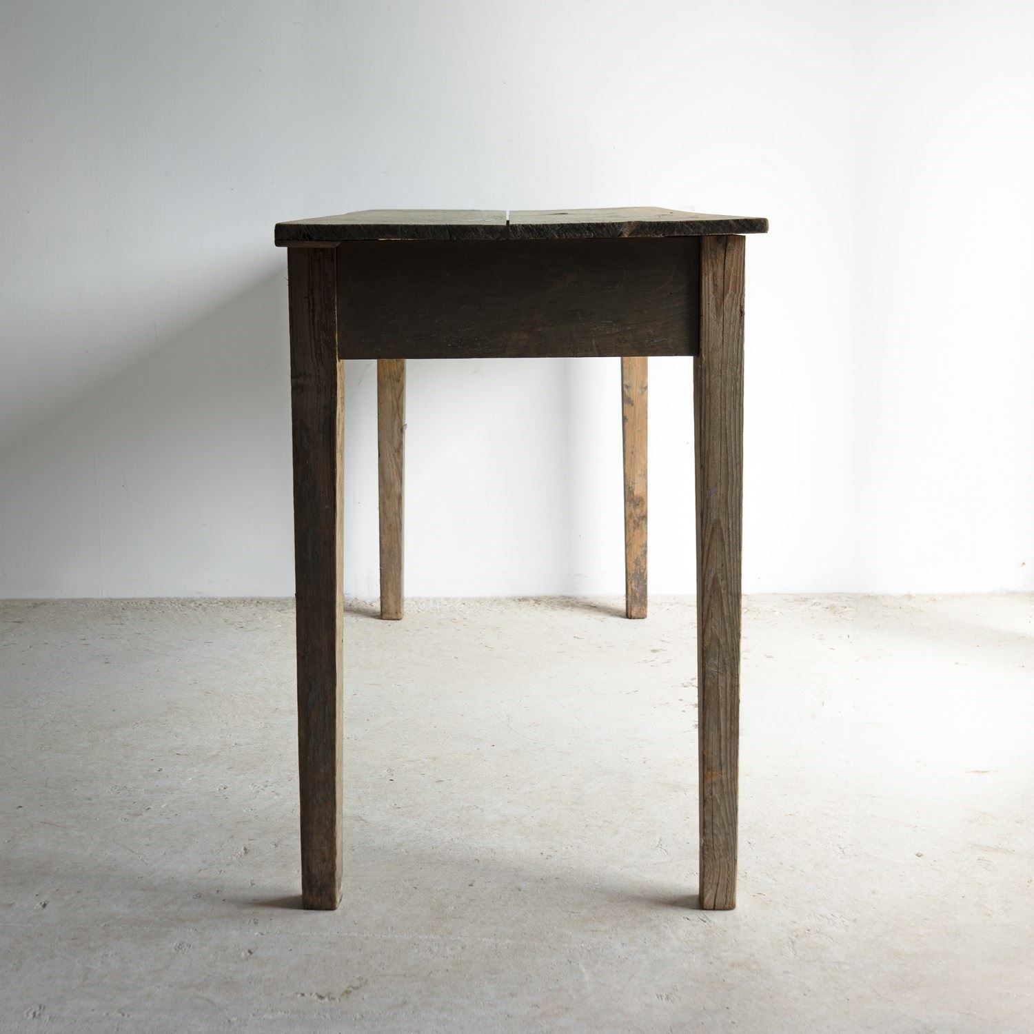 An antique side table, constructed of pine with tapered square legs, casting a simple and stylish silhouette.