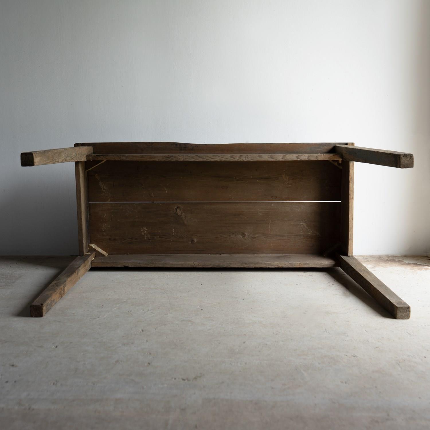 The table is in good vintage condition. It is solid and sturdy and is in usable condition. There is cosmetic wear and natural patina throughout, which we think adds to its charm and aesthetic and makes it what it is. There is some old, dead woodworm present, which we have treated for good measure. The joints have recently been sured up with wooden blocks underneath the top to aid the stability.