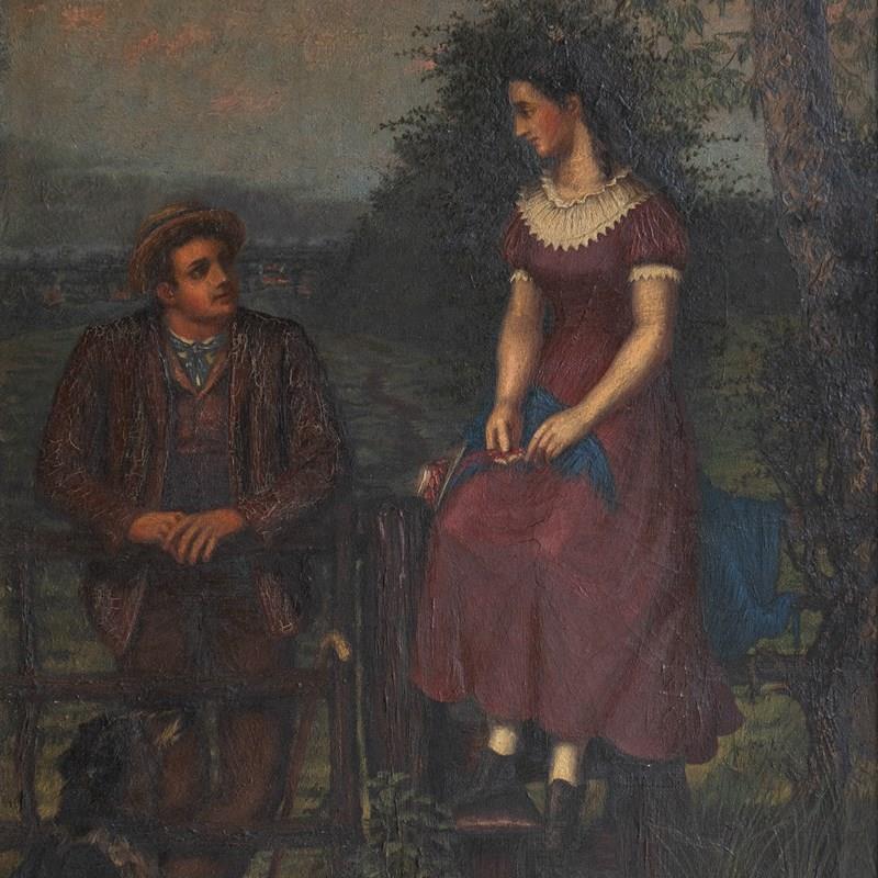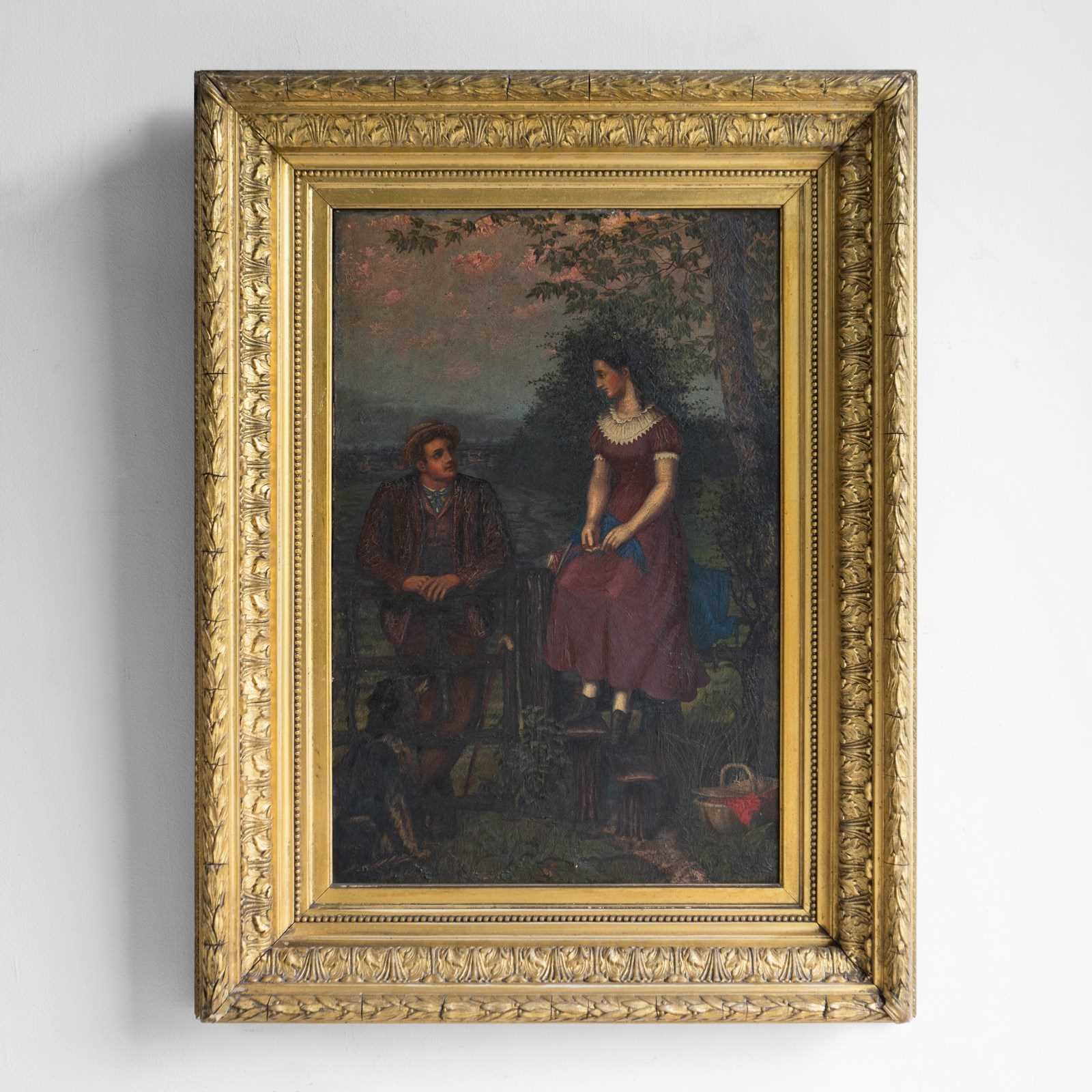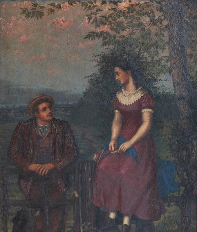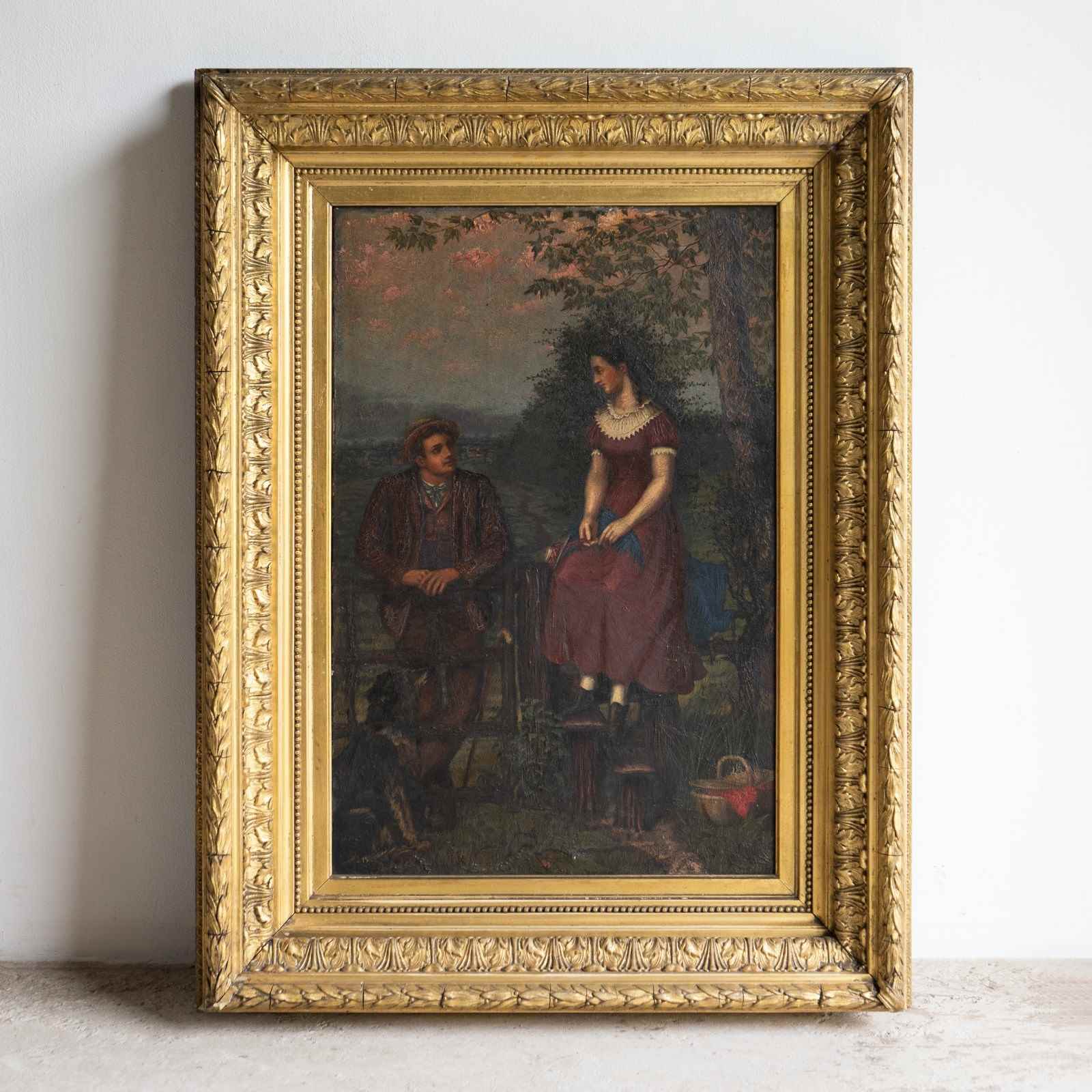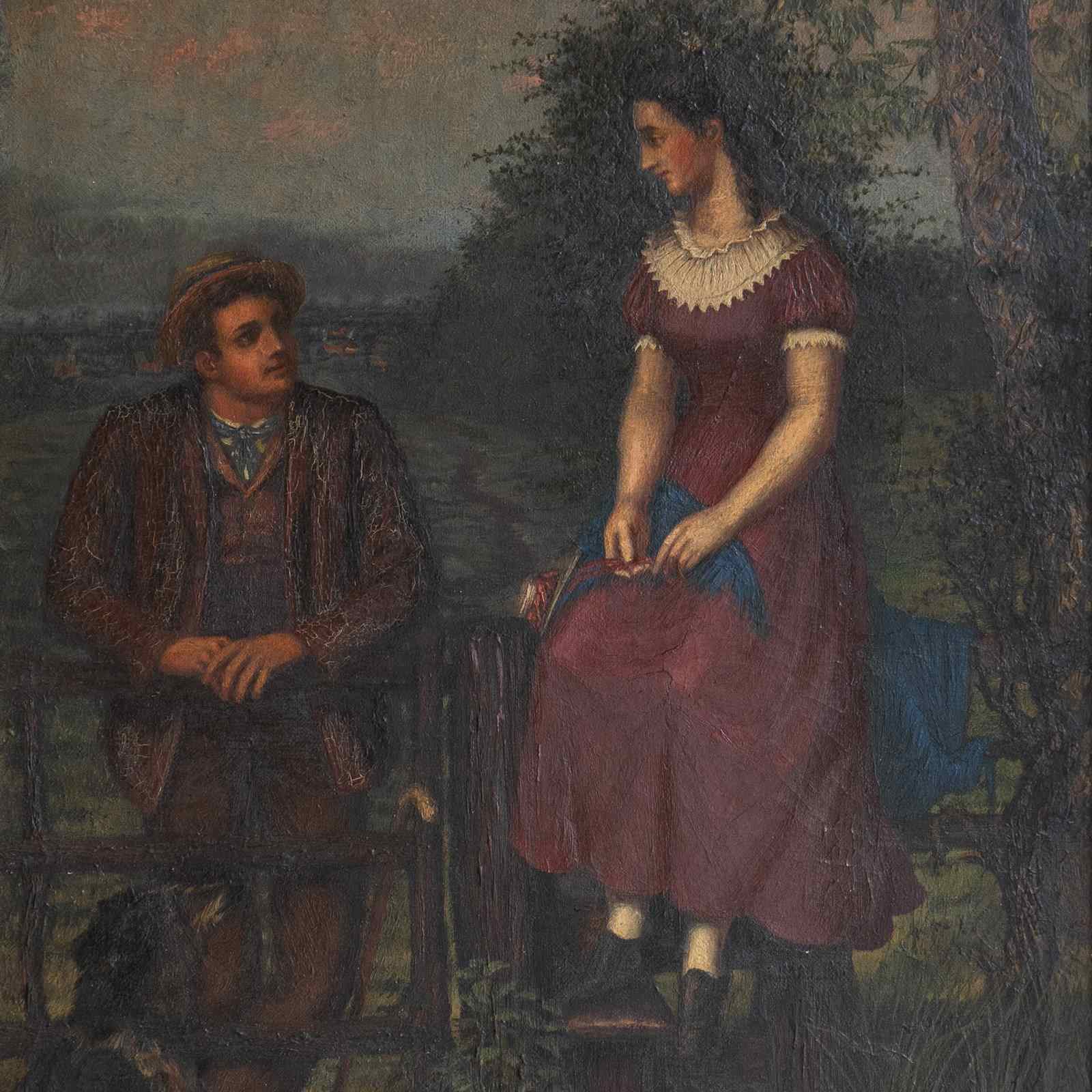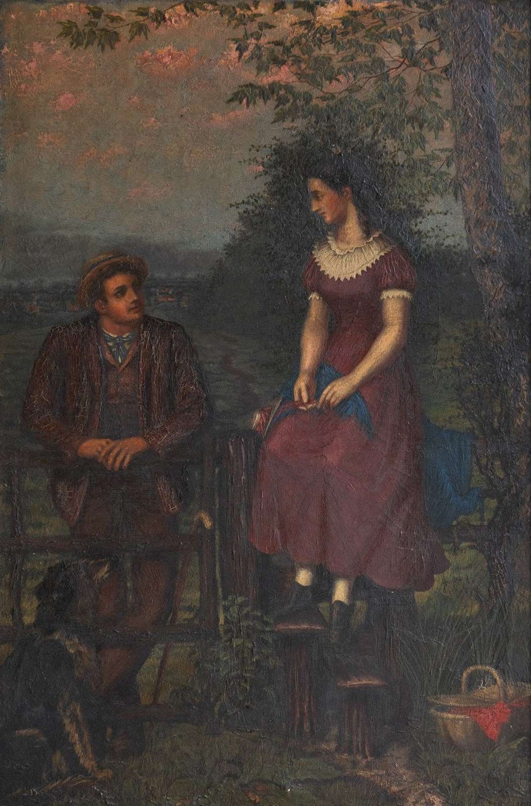 Antique original oil on canvas painting depicting one of the most charming scenes I can think of, it draws you in and tugs on your heartstrings. A young lady in a purple dress with a lace collar is perched up high on the fence above a stile, whilst a young gentleman, also dressed well in country attire, is leaning on the gate. They are looking into each other’s eyes with great affection. They are in a beautiful countryside setting, a collie sat in the bottom left is also gazing up at the pair, in the lower right, there is a basket full to the brim with a picnic wrapped in red cloth, and to top it all off, the most beautiful pinky mackerel sky sunset above.