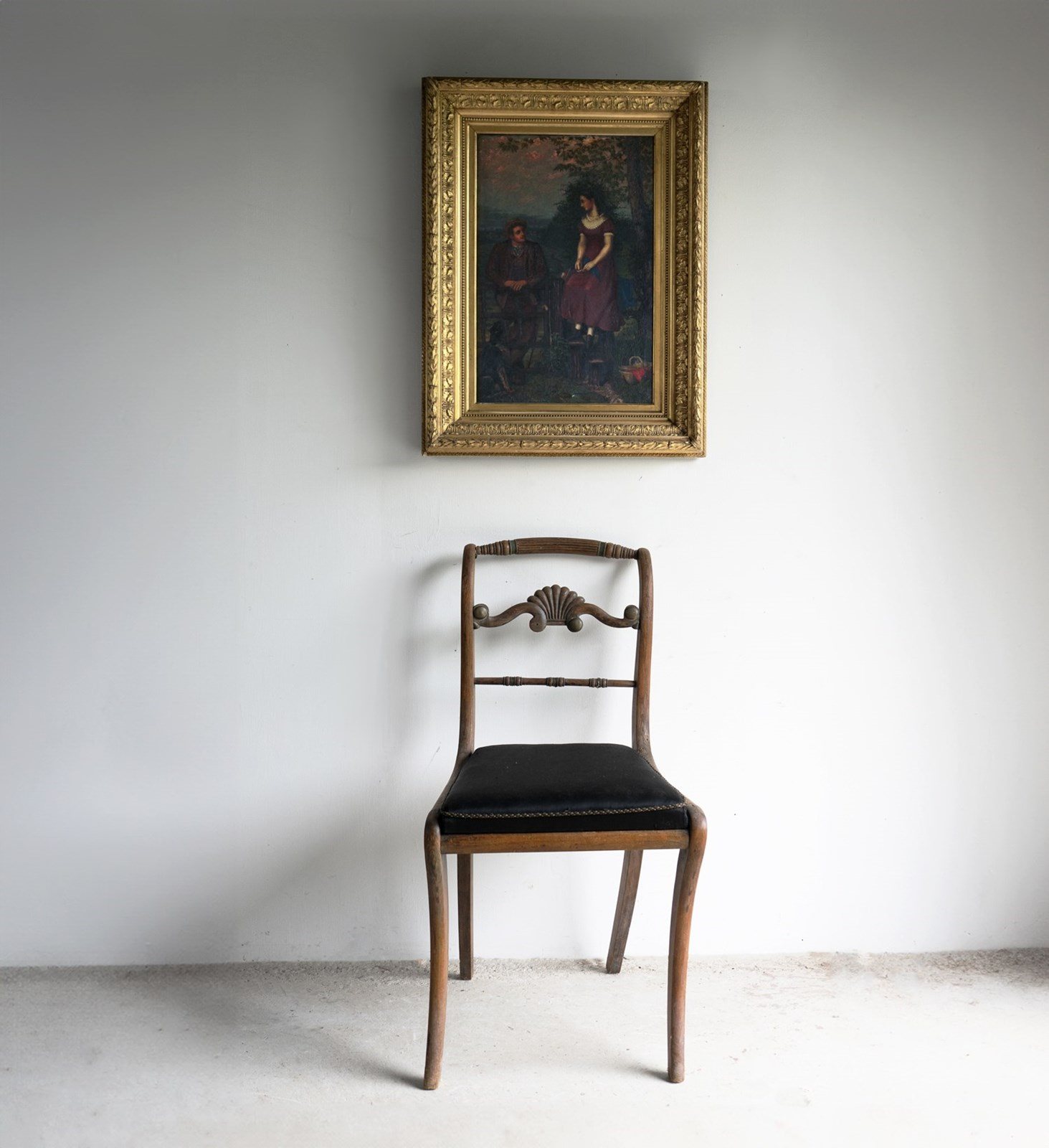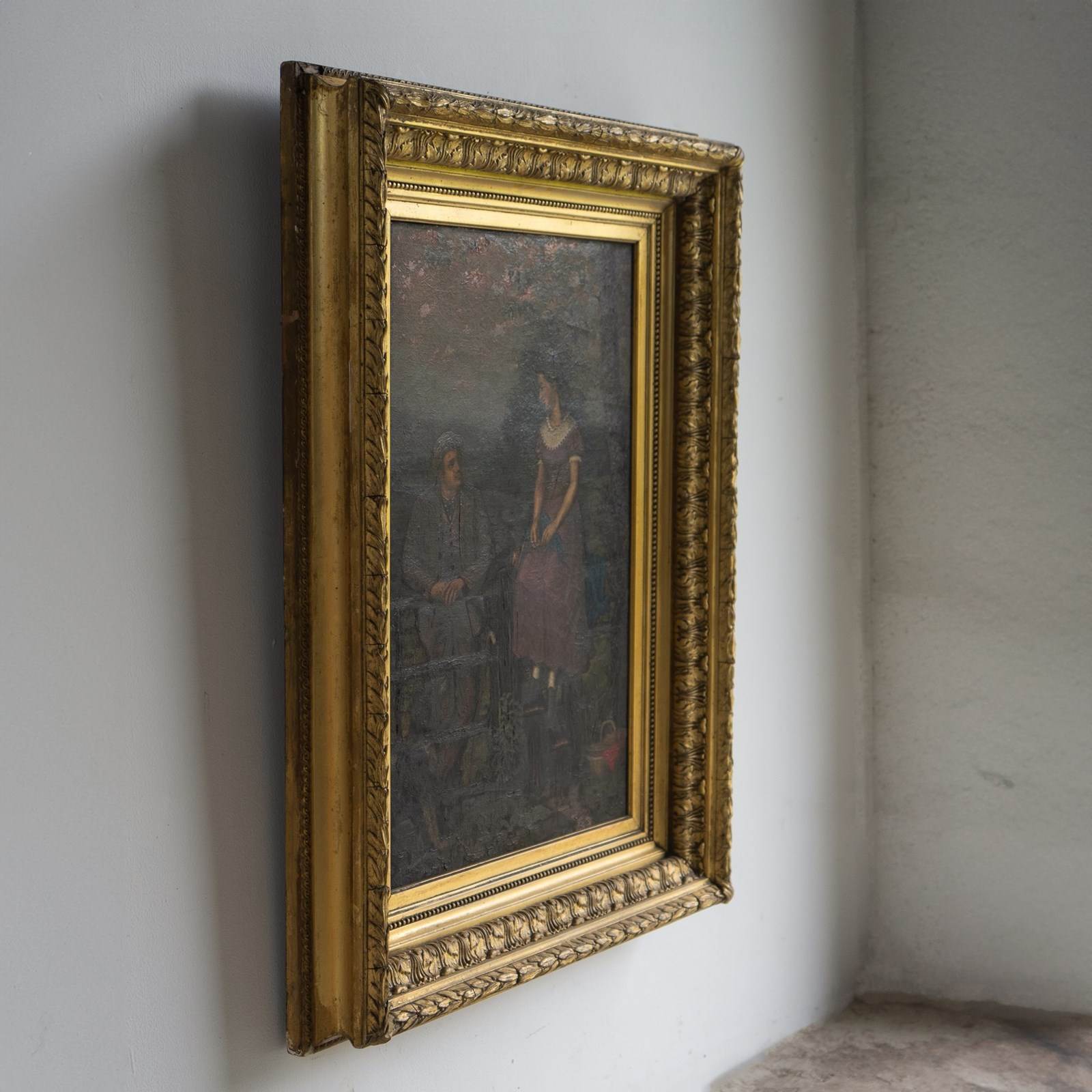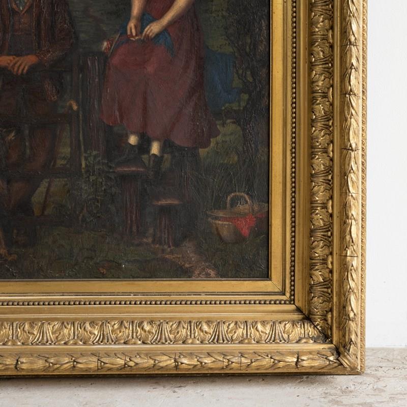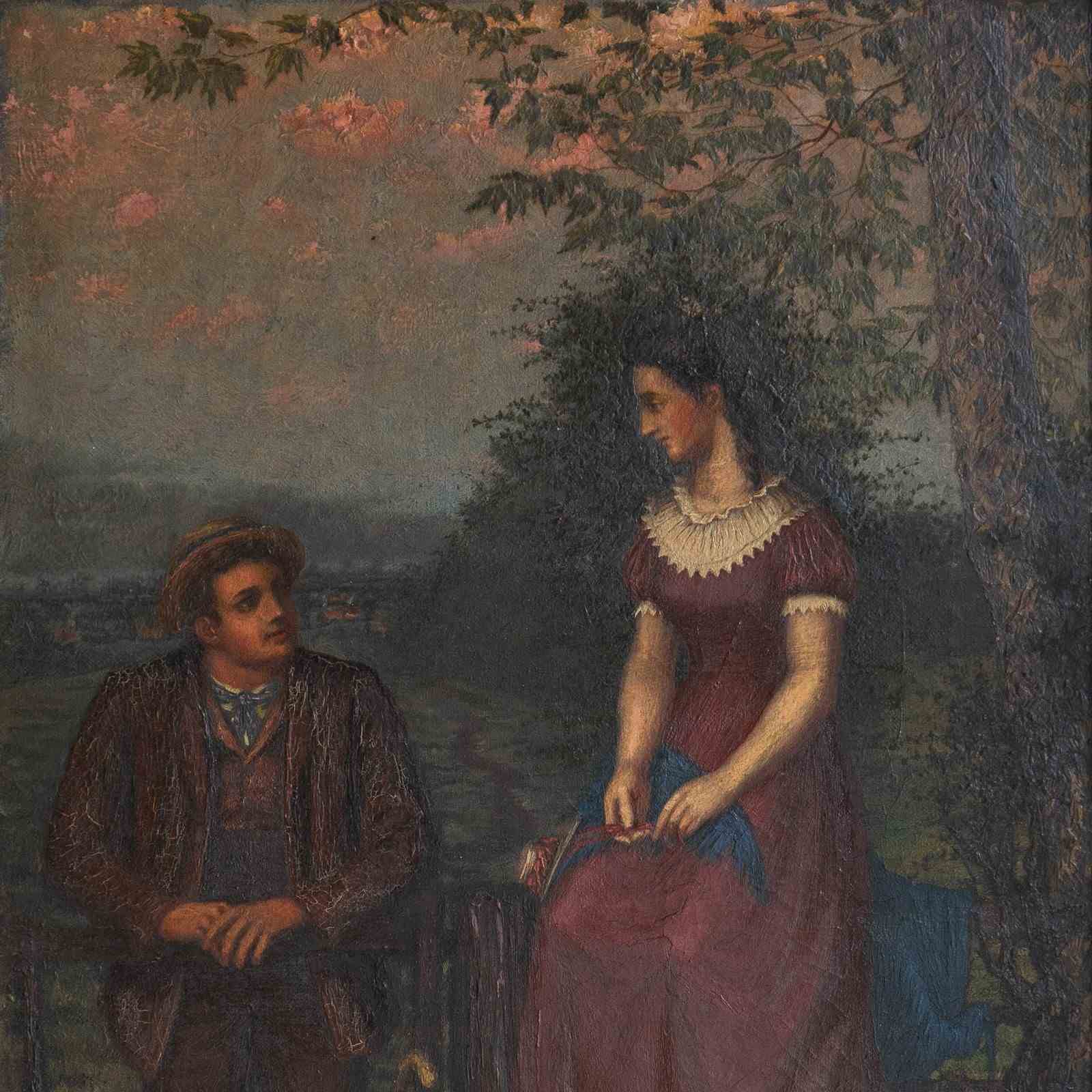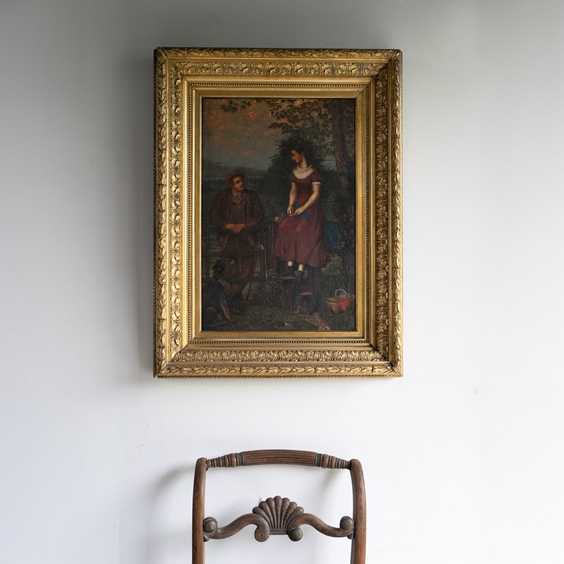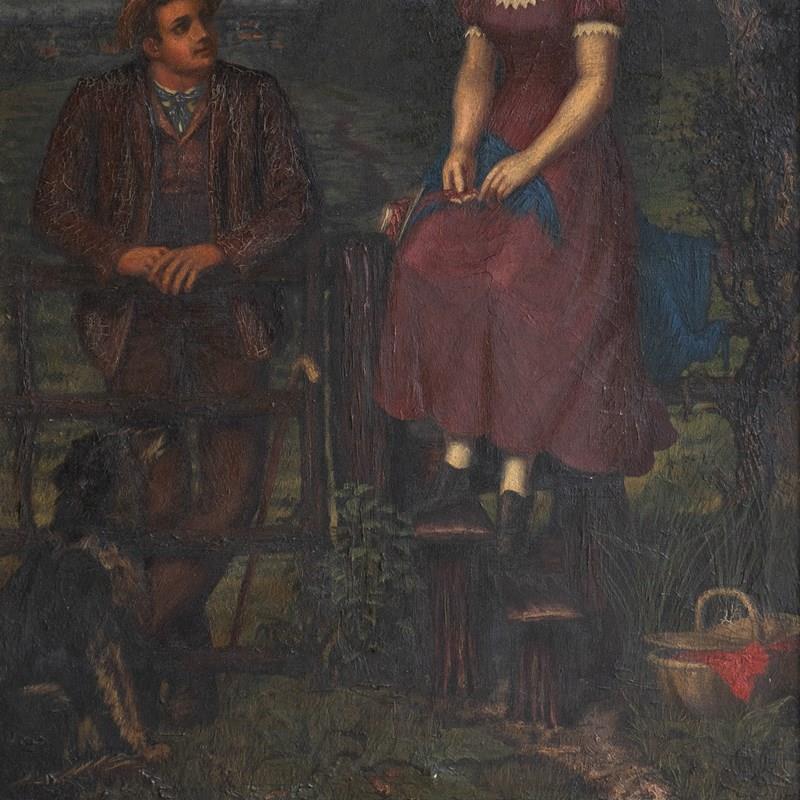 Antique original oil on canvas painting depicting one of the most charming scenes I can think of, it draws you in and tugs on your heartstrings. A young lady in a purple dress with a lace collar is perched up high on the fence above a stile, whilst a young gentleman, also dressed well in country attire, is leaning on the gate. They are looking into each other’s eyes with great affection. They are in a beautiful countryside setting, a collie sat in the bottom left is also gazing up at the pair, in the lower right, there is a basket full to the brim with a picnic wrapped in red cloth, and to top it all off, the most beautiful pinky mackerel sky sunset above.