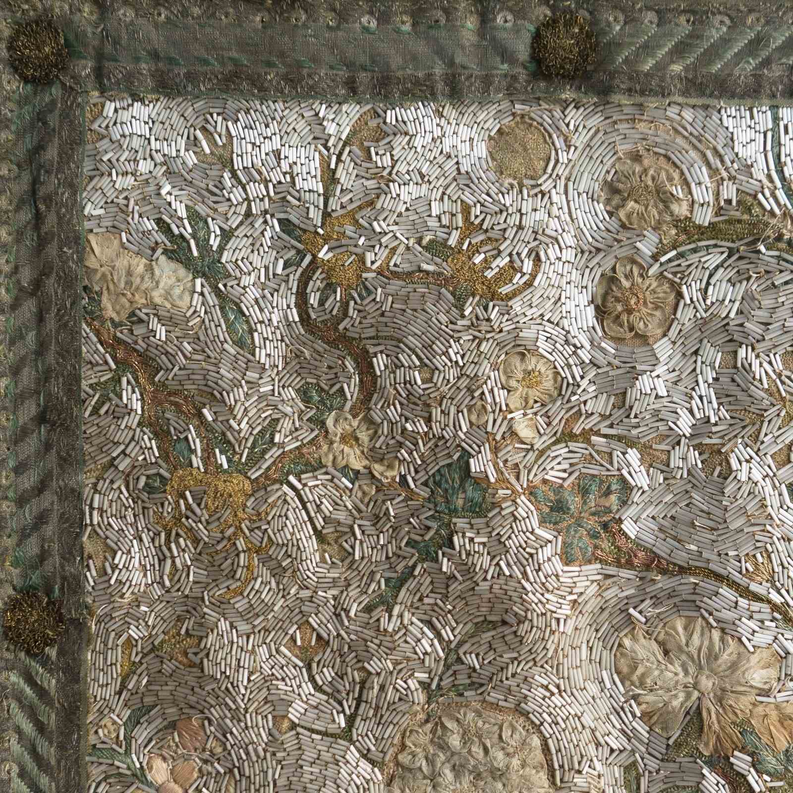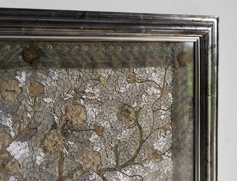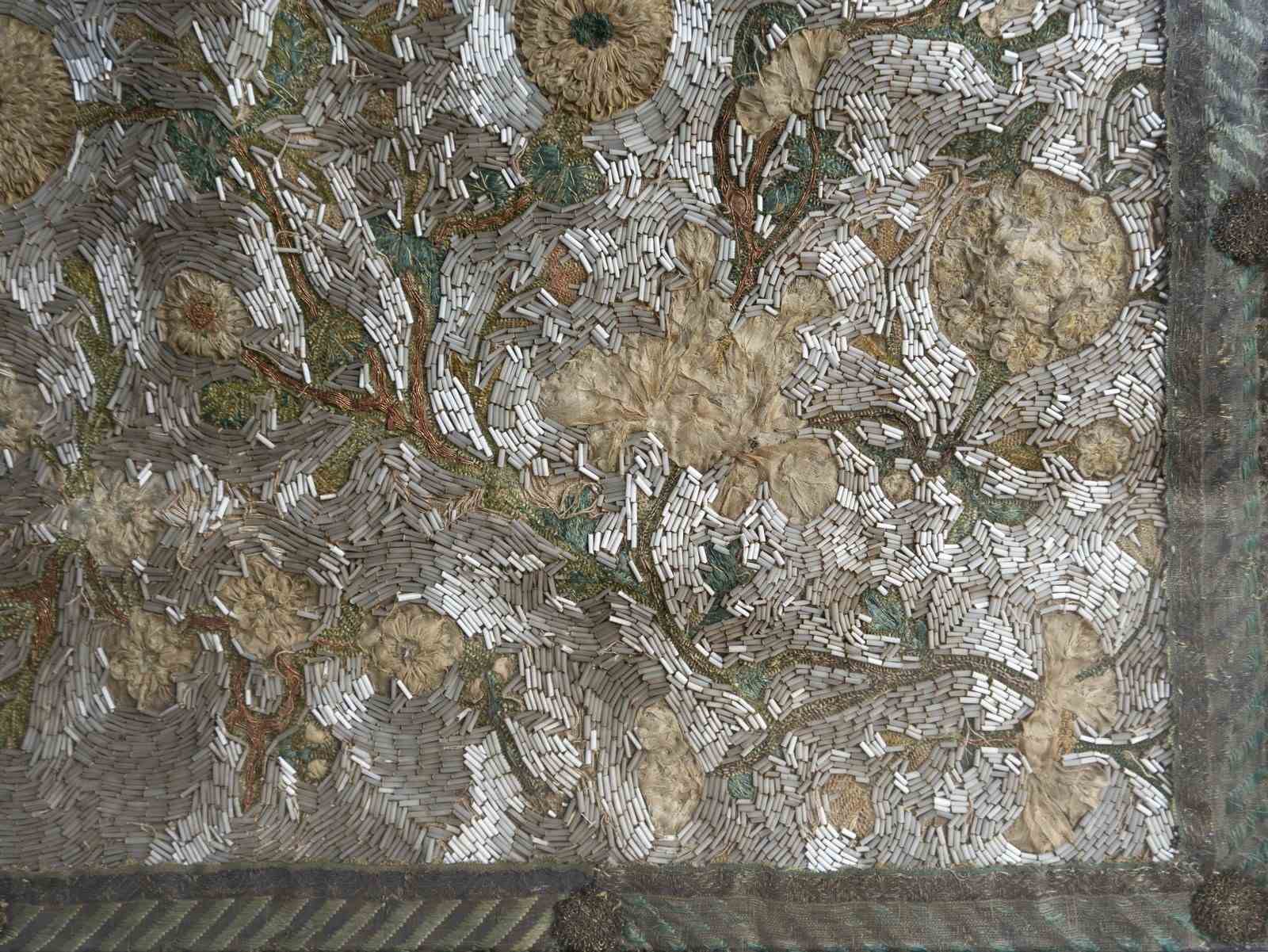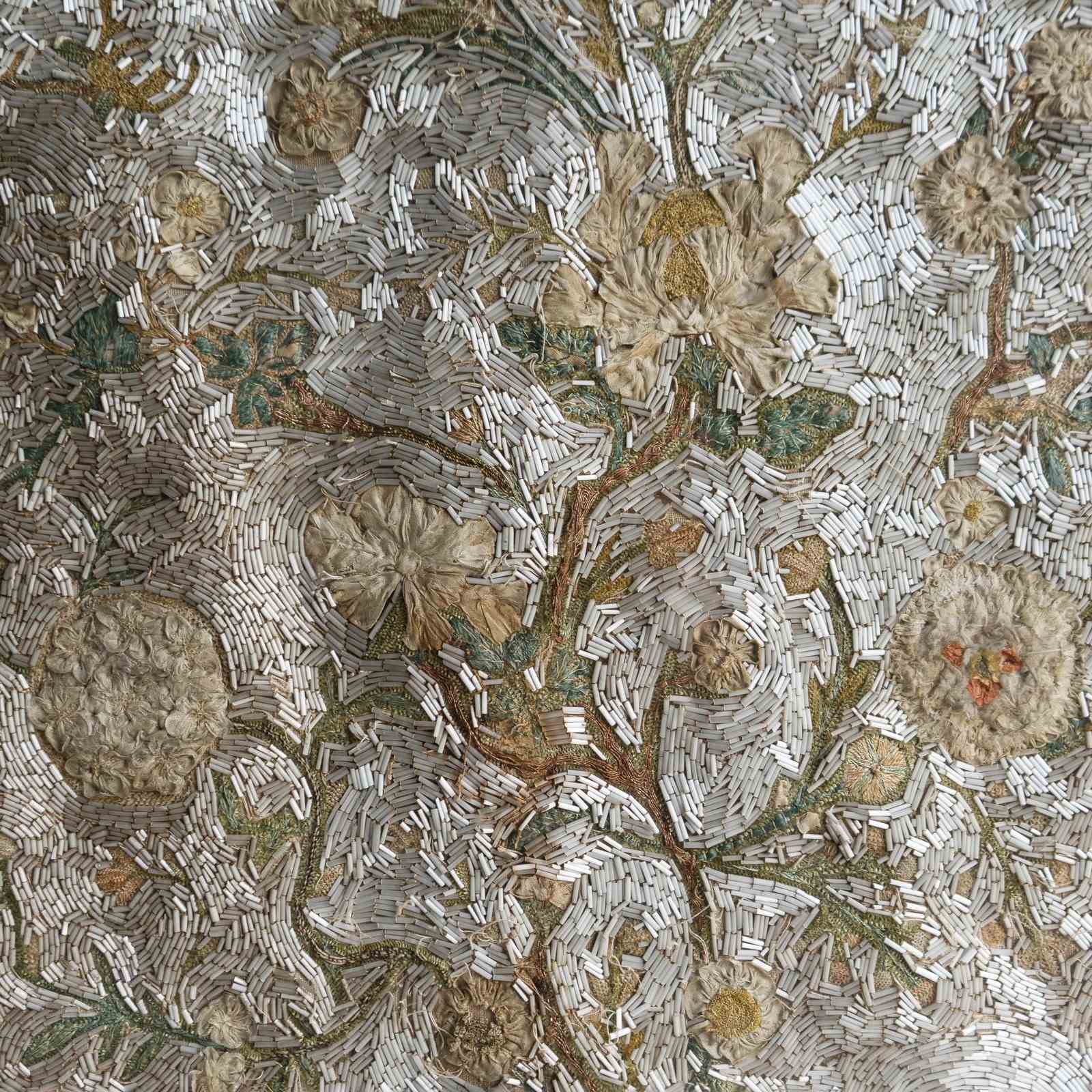 A hugely decorative piece depicting branches of a tree with different types of flowers and foliage. There is a somewhat timeless, almost abstract feel to the piece, and on close inspection, you can see the sheer amount of work it must have taken to complete, with many different techniques and materials used for each individual section. including raised stumpwork flowers, wirework, applied beadwork, as well as traditional embroidery techniques.