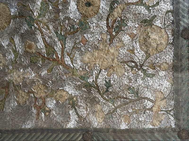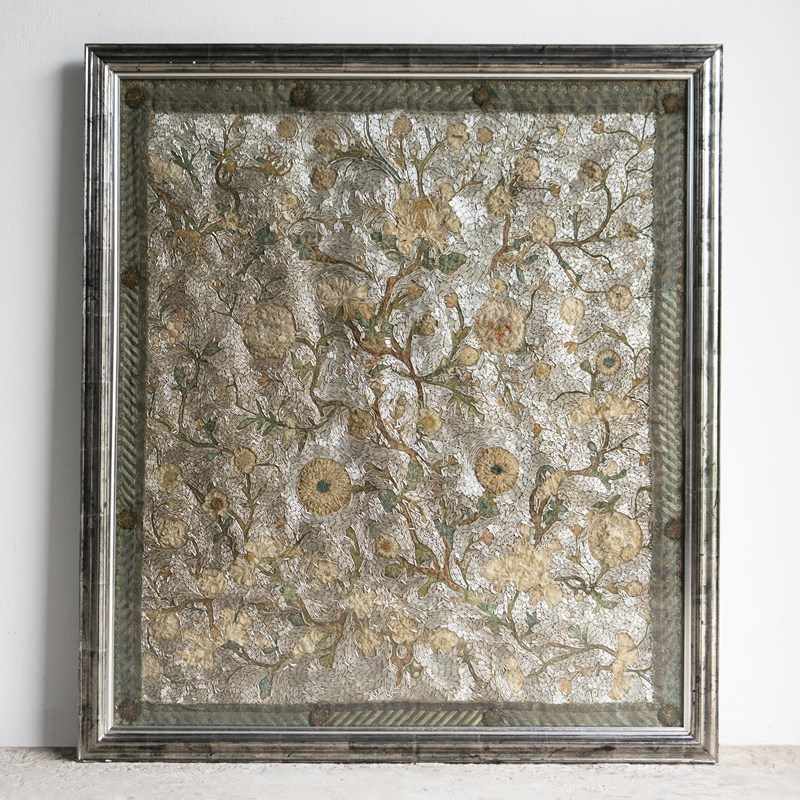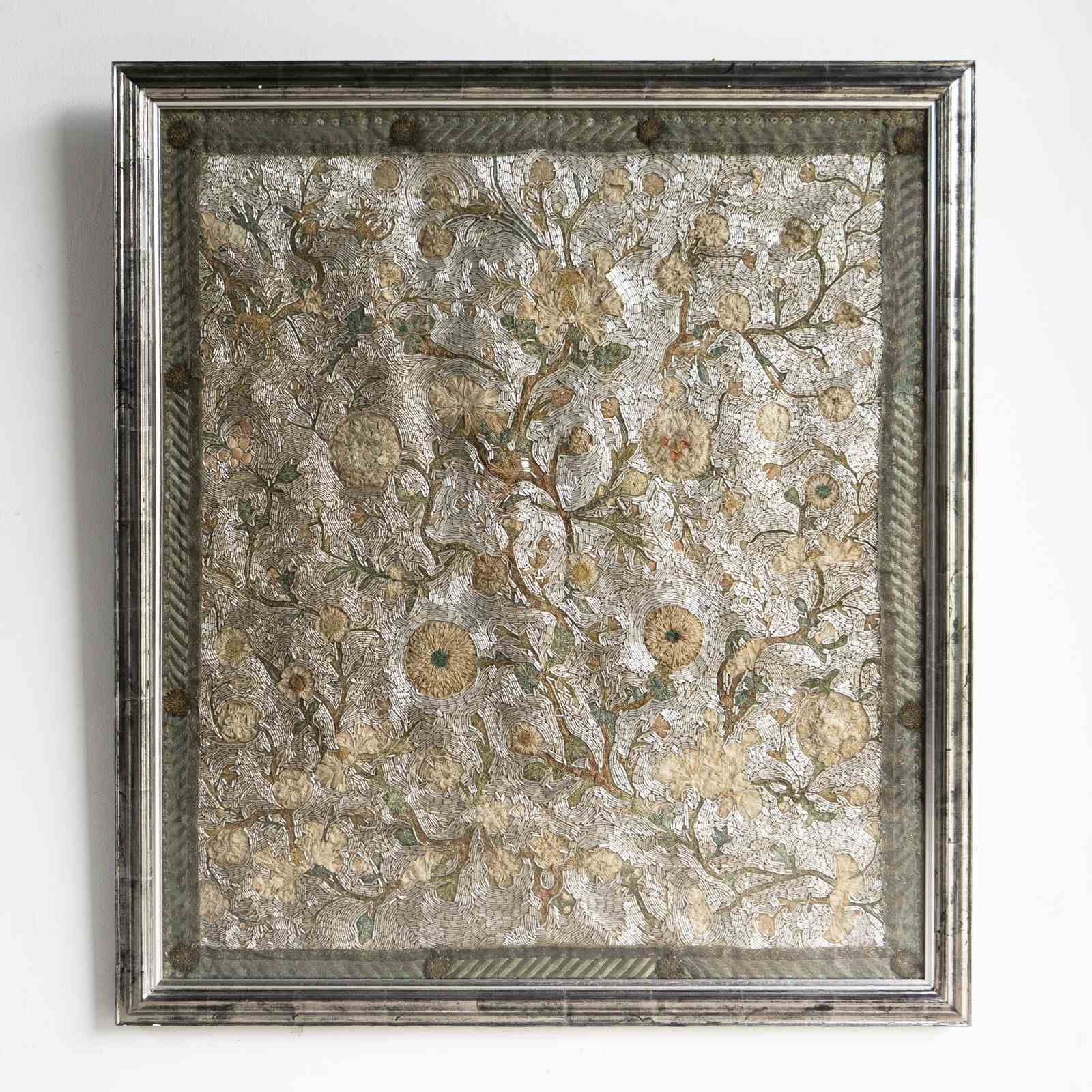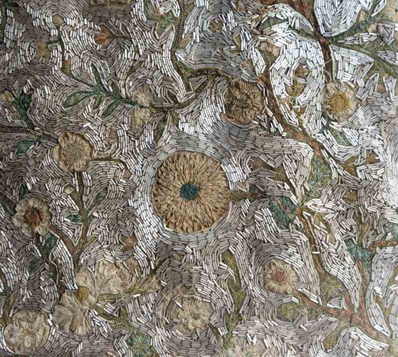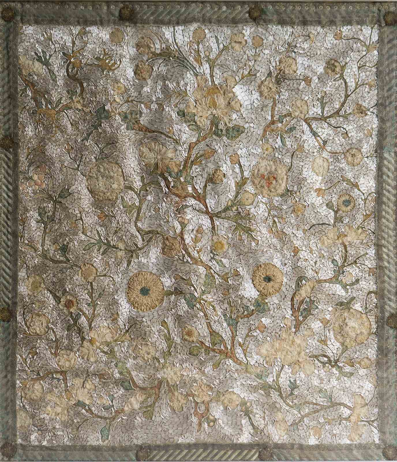 A hugely decorative piece depicting branches of a tree with different types of flowers and foliage. There is a somewhat timeless, almost abstract feel to the piece, and on close inspection, you can see the sheer amount of work it must have taken to complete, with many different techniques and materials used for each individual section. including raised stumpwork flowers, wirework, applied beadwork, as well as traditional embroidery techniques.