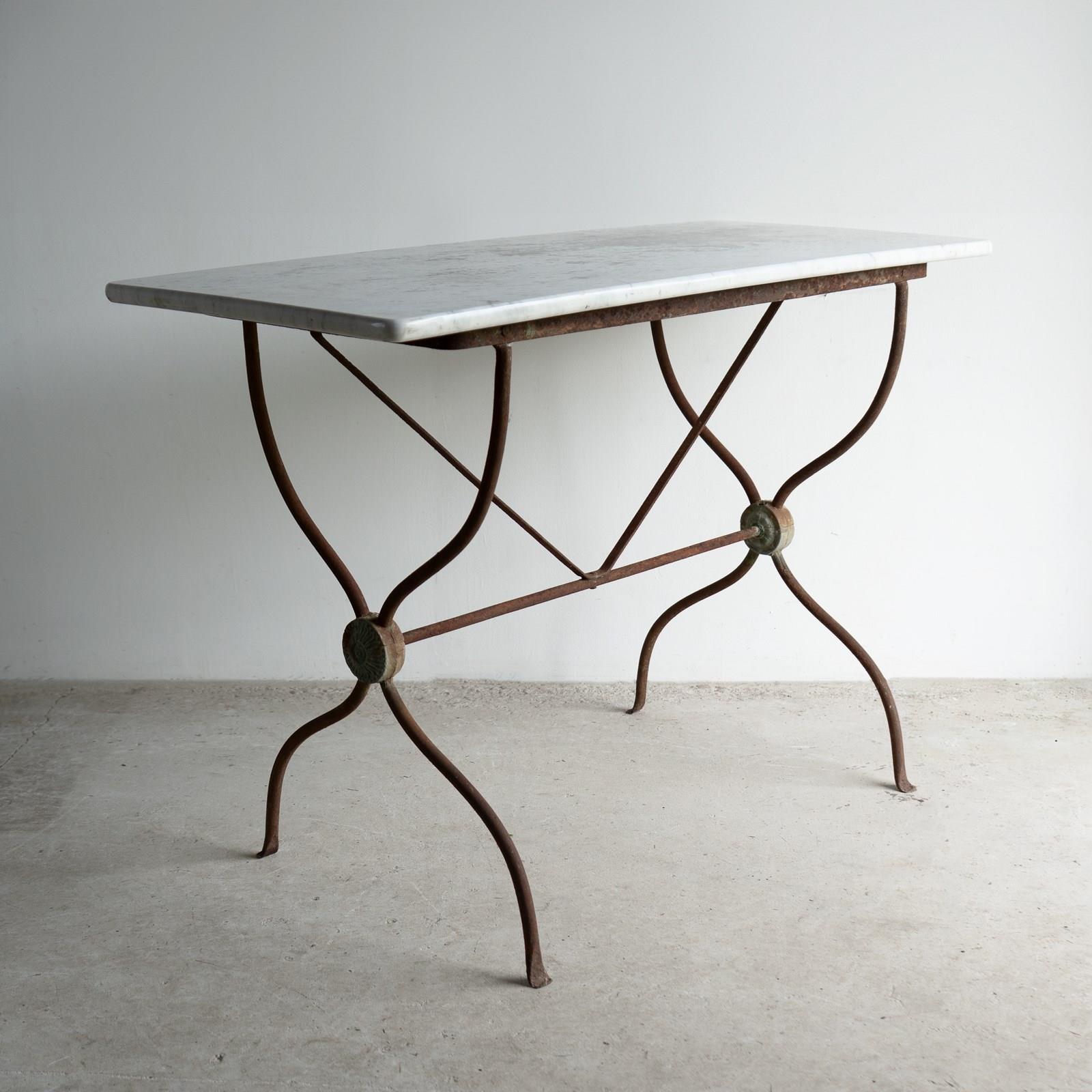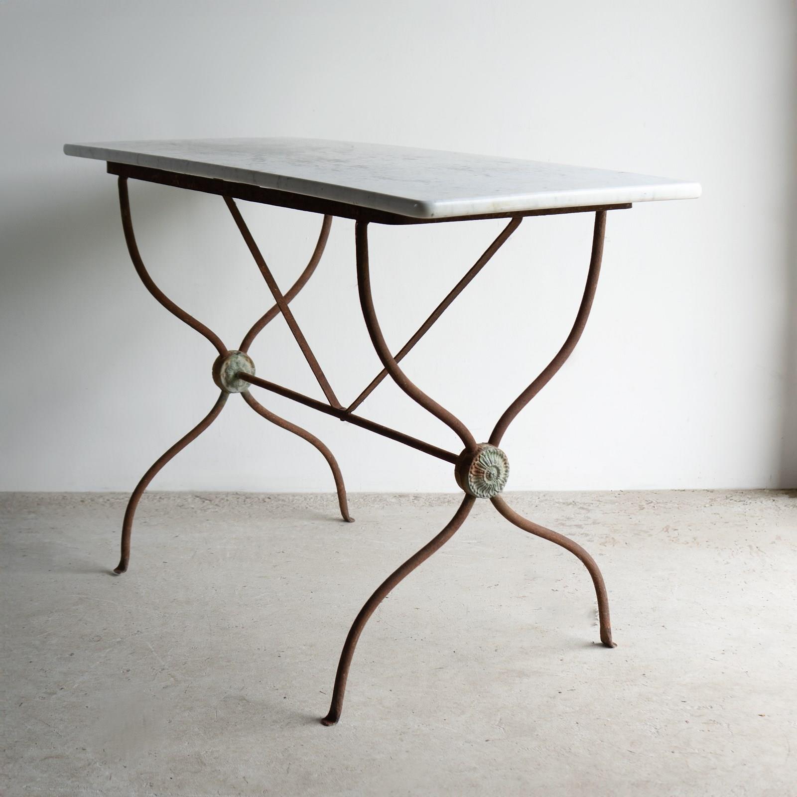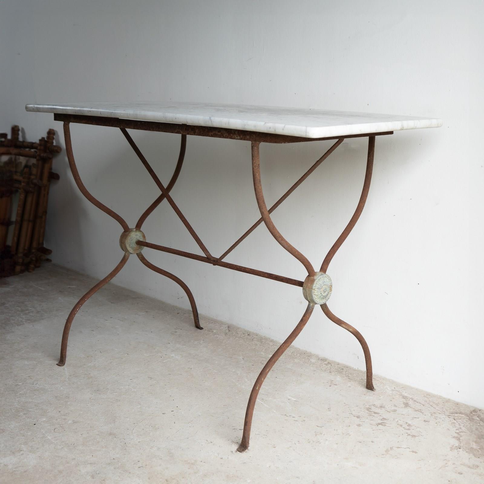 A decorative and useful antique table with a rectangular Carrara marble top on a shaped wrought iron frame with a neoclassical lead roundel at either end.