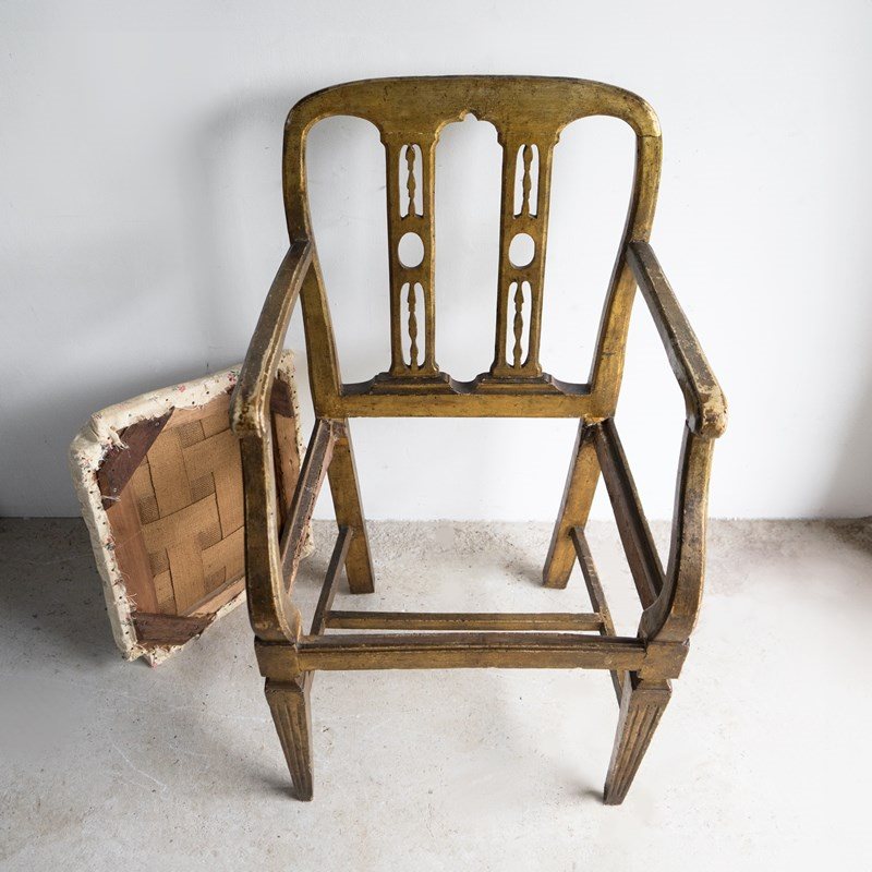 The chair is in good condition for its age. It is a perfectly usable chair and can be sat on. There is some slight movement in the joints, so I would probably suggest it being used as a side/occasional or bedroom chair rather than an everyday dining chair. The original gilding is worn but highly decorative. The silk on the seat pad is worn in places. Again, we love the way this looks, but it could easily be replaced. There is some old, dead woodworm present throughout the chair, which has been treated for good measure.