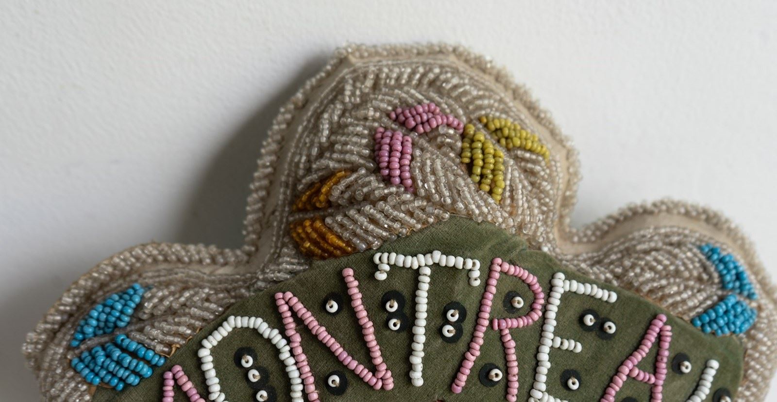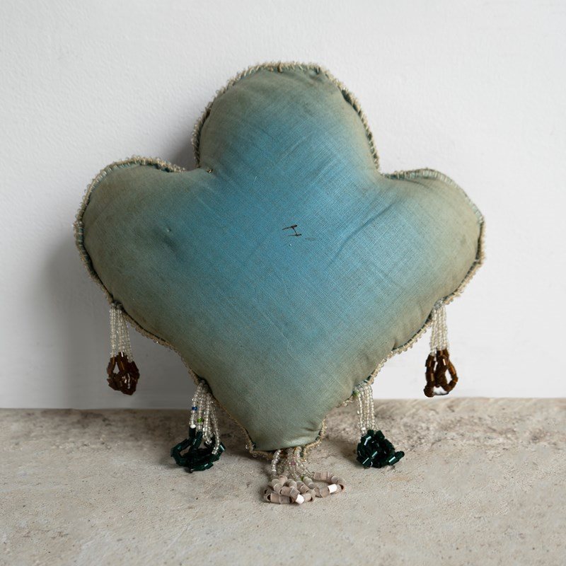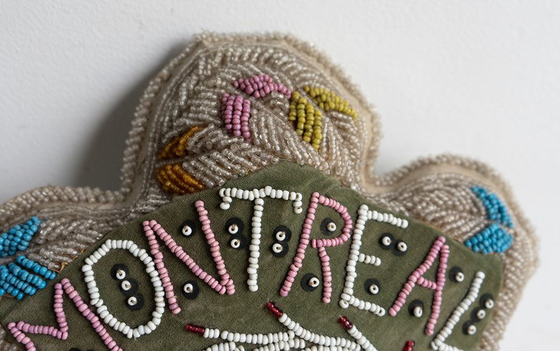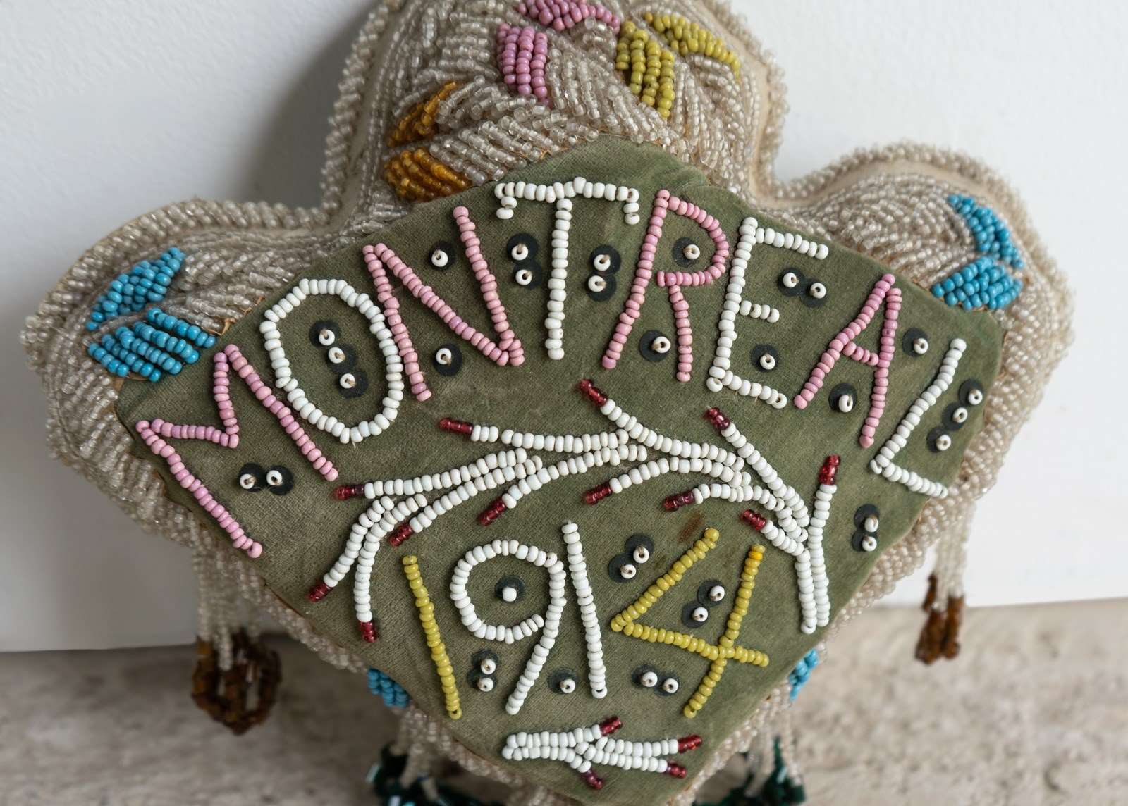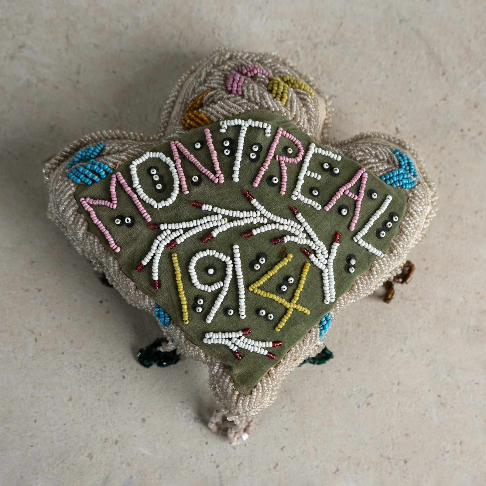 A pine sawdust-stuffed cushion with intricate and highly decorative glass beadwork on a green velvet ground, inscribed ‘Montreal’ and dated ‘1914’.
