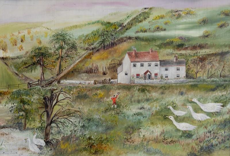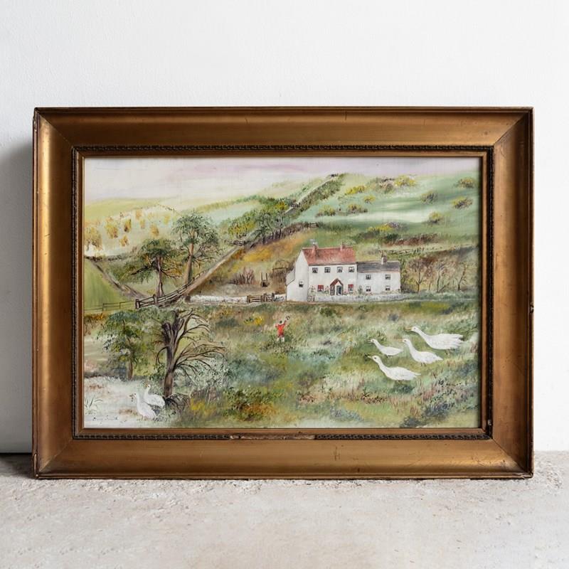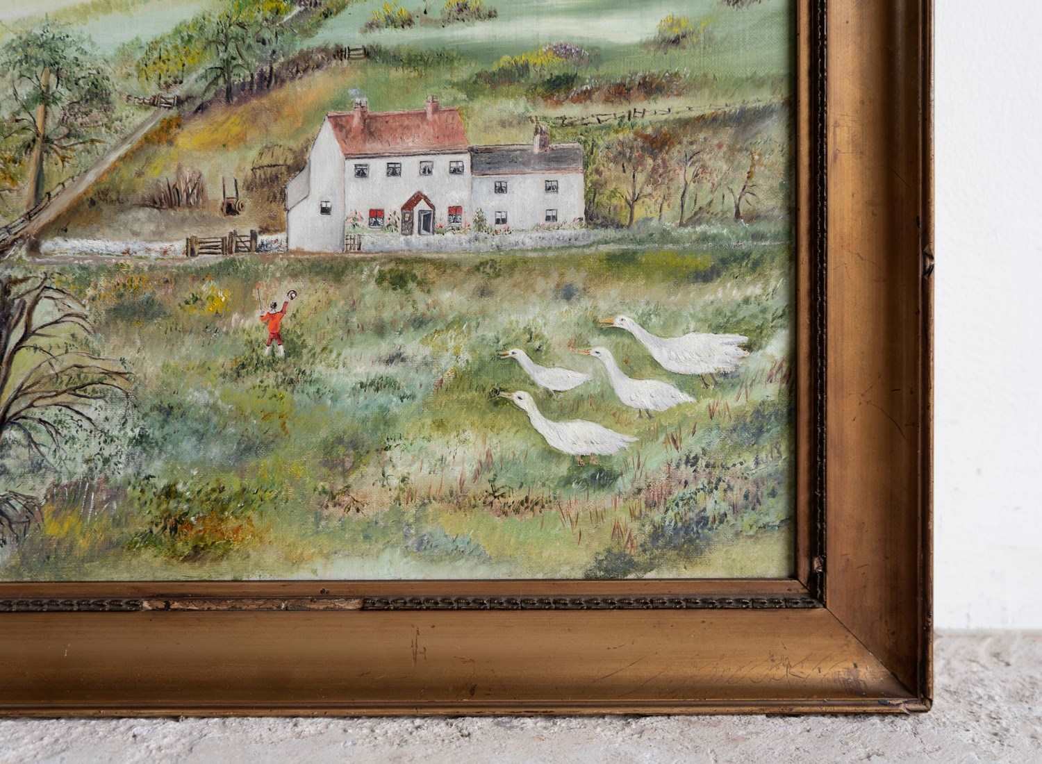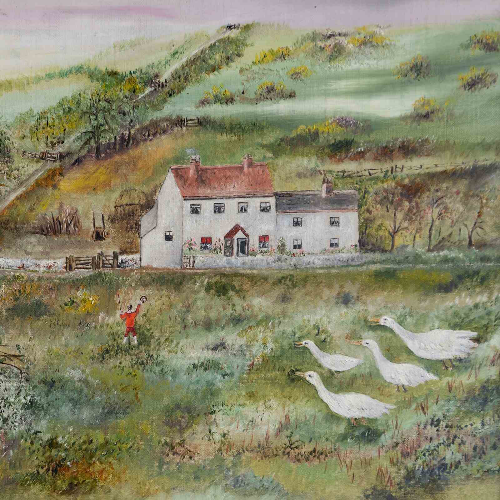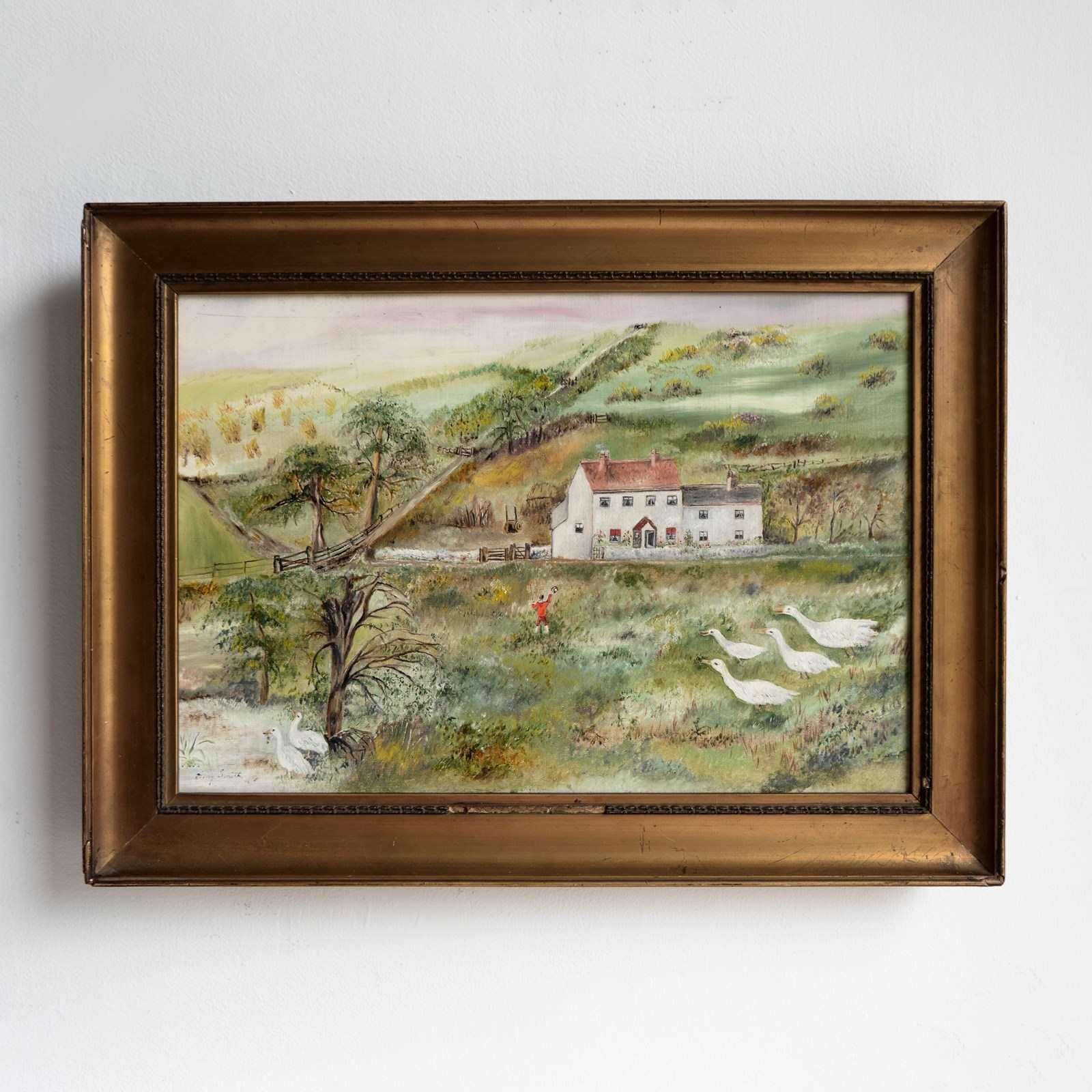 Painted in a naive, folky style. It appears as though the artist certainly knew her subject; the movement of the geese to the lower right feels very lifelike, and there is great attention to detail. The roses in front of the house, the smoke from the chimney, the fences and gates throughout the picture and the hay stooks in the fields are all wonderfully depicted and hugely evocative.