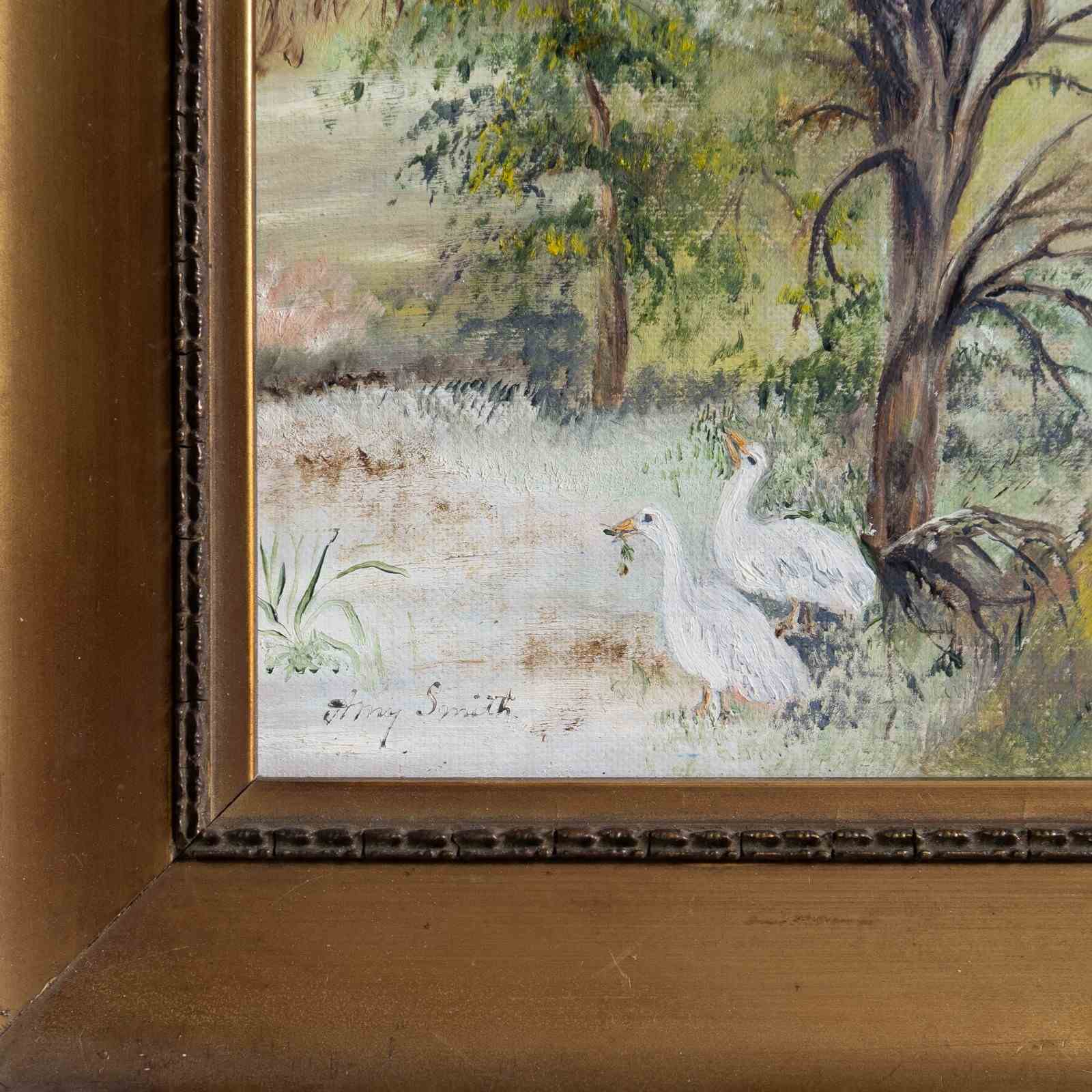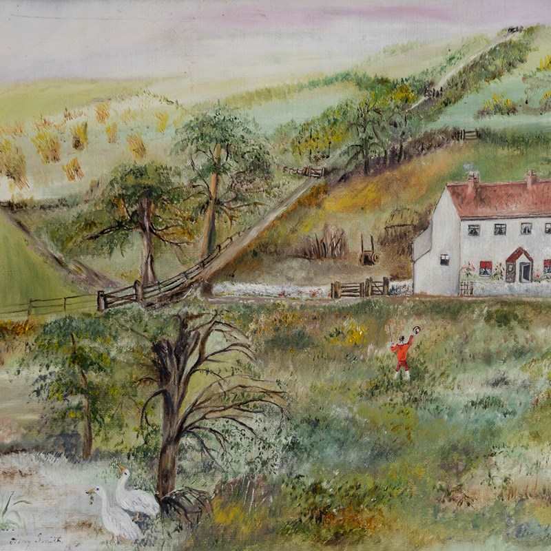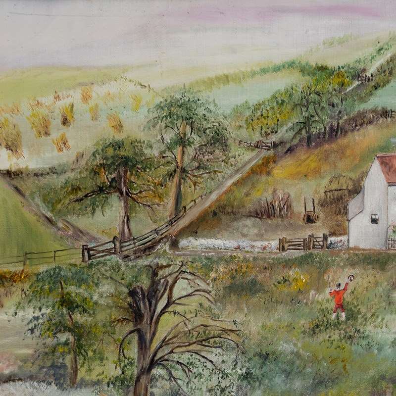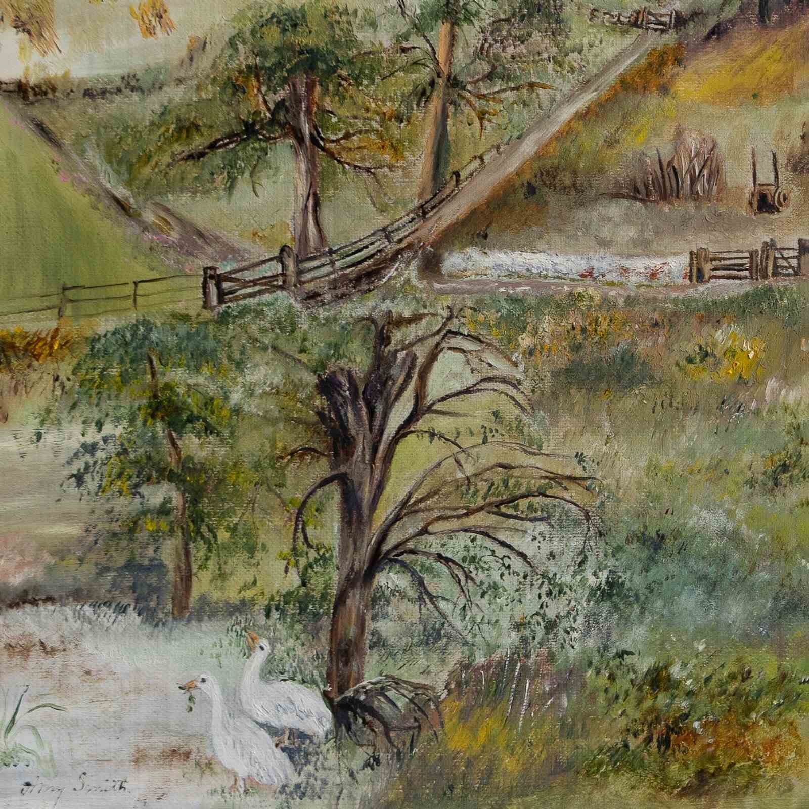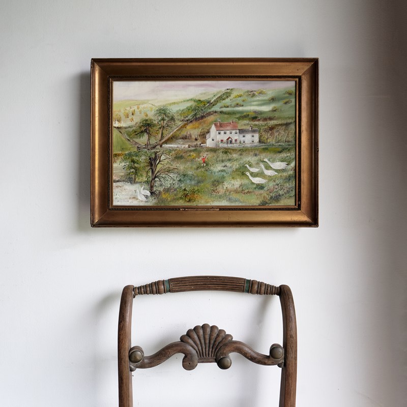 Painted in a naive, folky style. It appears as though the artist certainly knew her subject; the movement of the geese to the lower right feels very lifelike, and there is great attention to detail. The roses in front of the house, the smoke from the chimney, the fences and gates throughout the picture and the hay stooks in the fields are all wonderfully depicted and hugely evocative.