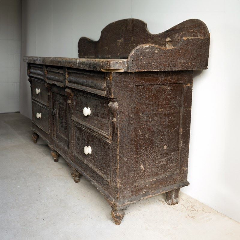 The dresser has been well used over the years for various purposes and has wear and imperfections throughout commensurate with this. There are honest old repairs, missing pieces, dents, scratches, stains etc. which make it what it is. It is still a very usable piece of furniture. Its condition reflects its life and its overall aesthetic is part of the reason we fell for it and we believe this adds to its charm and decorative appeal.