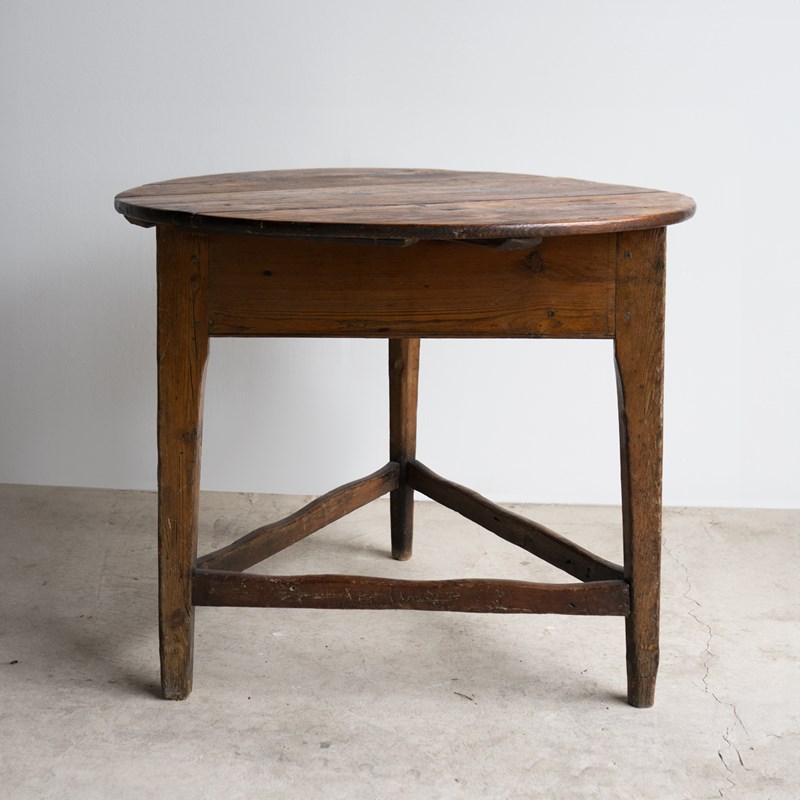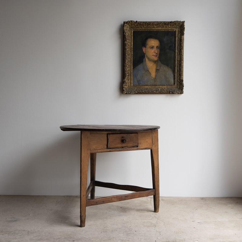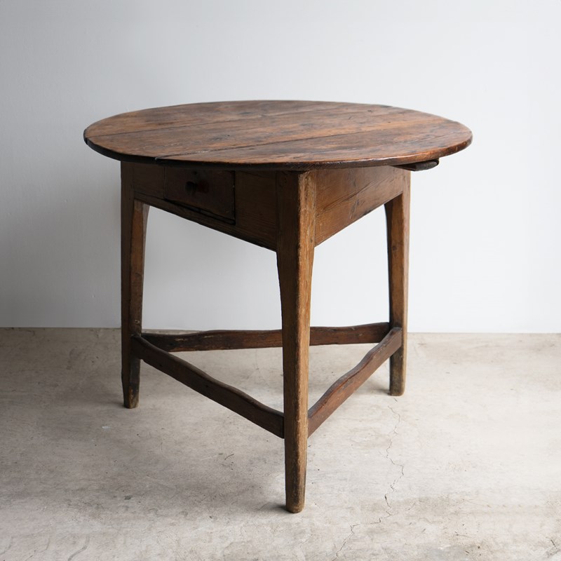 A handsome and stylish cricket table of slightly unusual form with an integral drawer in the apron and three tapered legs united by stretchers naturally worn over time by people’s feet.