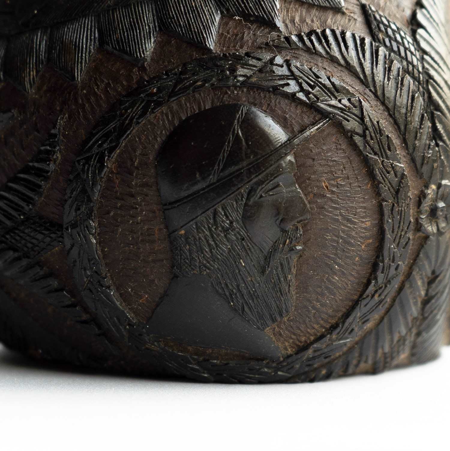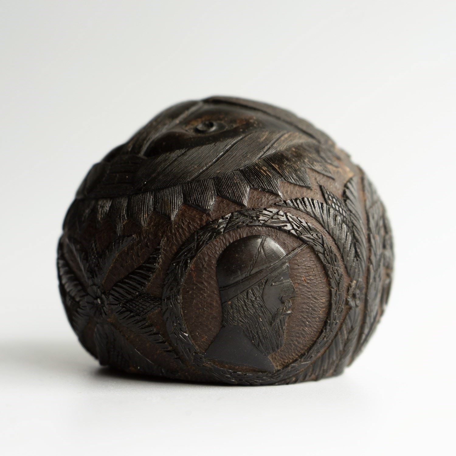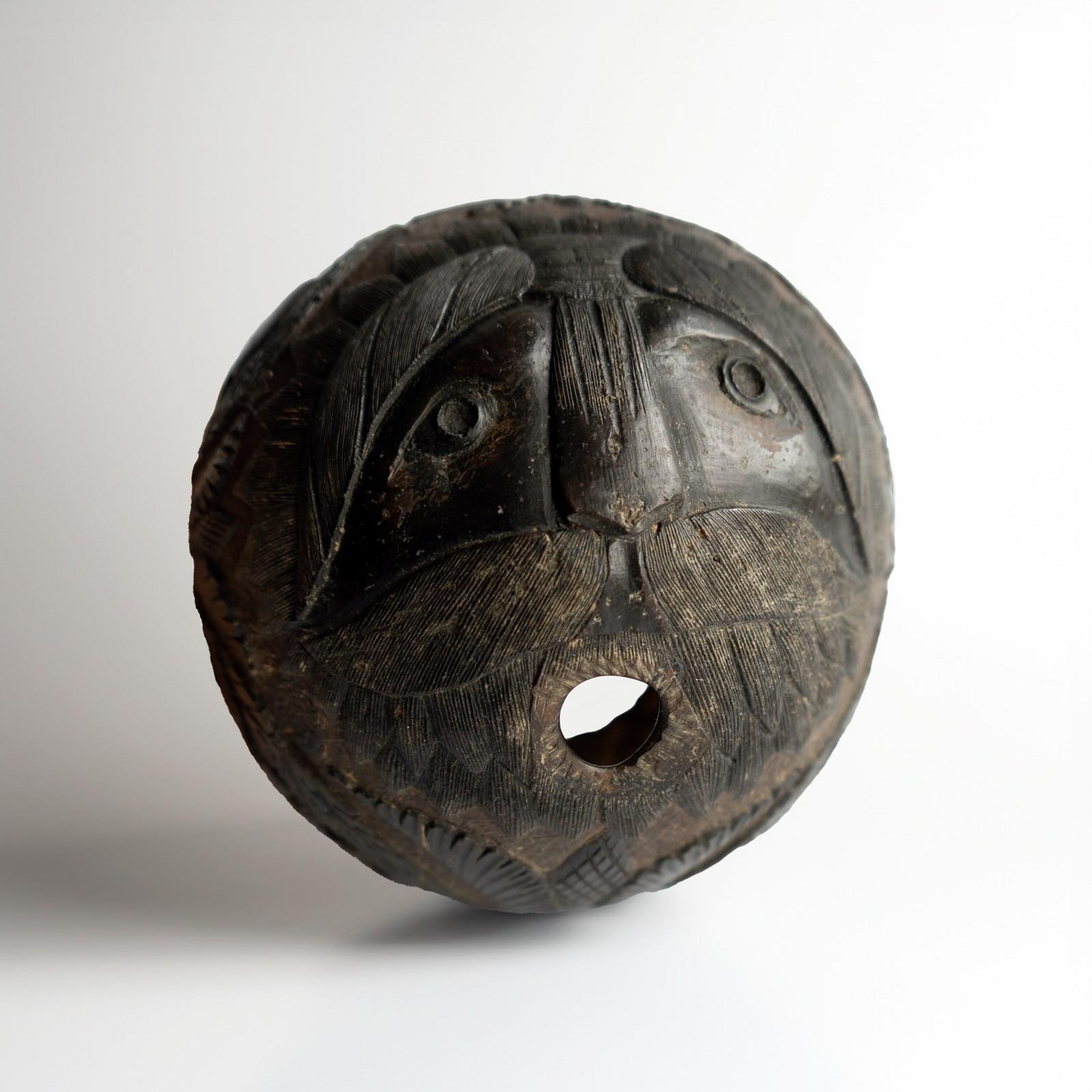 An intricately carved coconut with a face on one side which makes use the naturally occurring holes and pits of the coconut to form a man’s eyes and mouth with other features carved into the surface depicting his nose, moustache, eyebrows with great attention paid to the individual hairs. He is wearing what appears to be some form of a headdress.