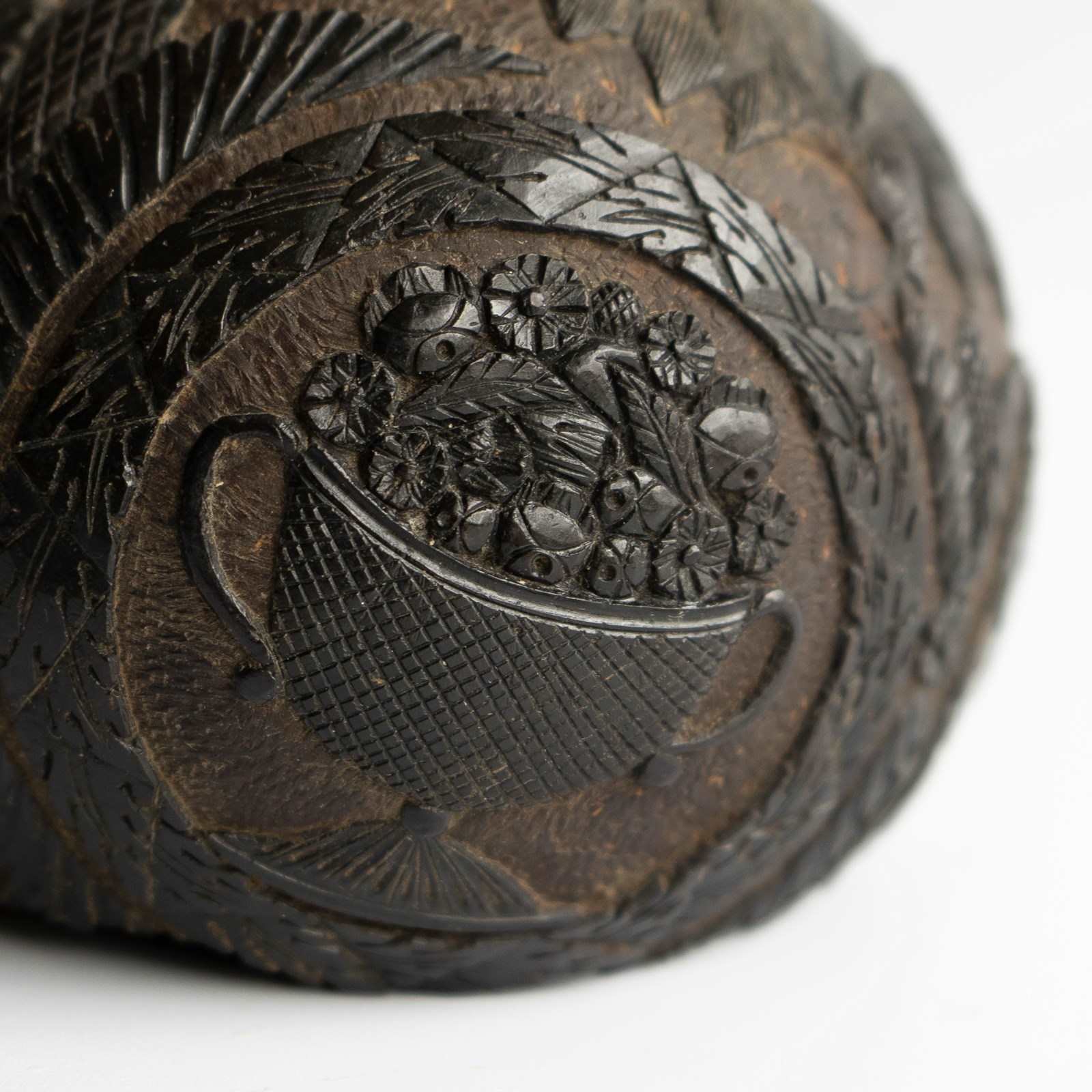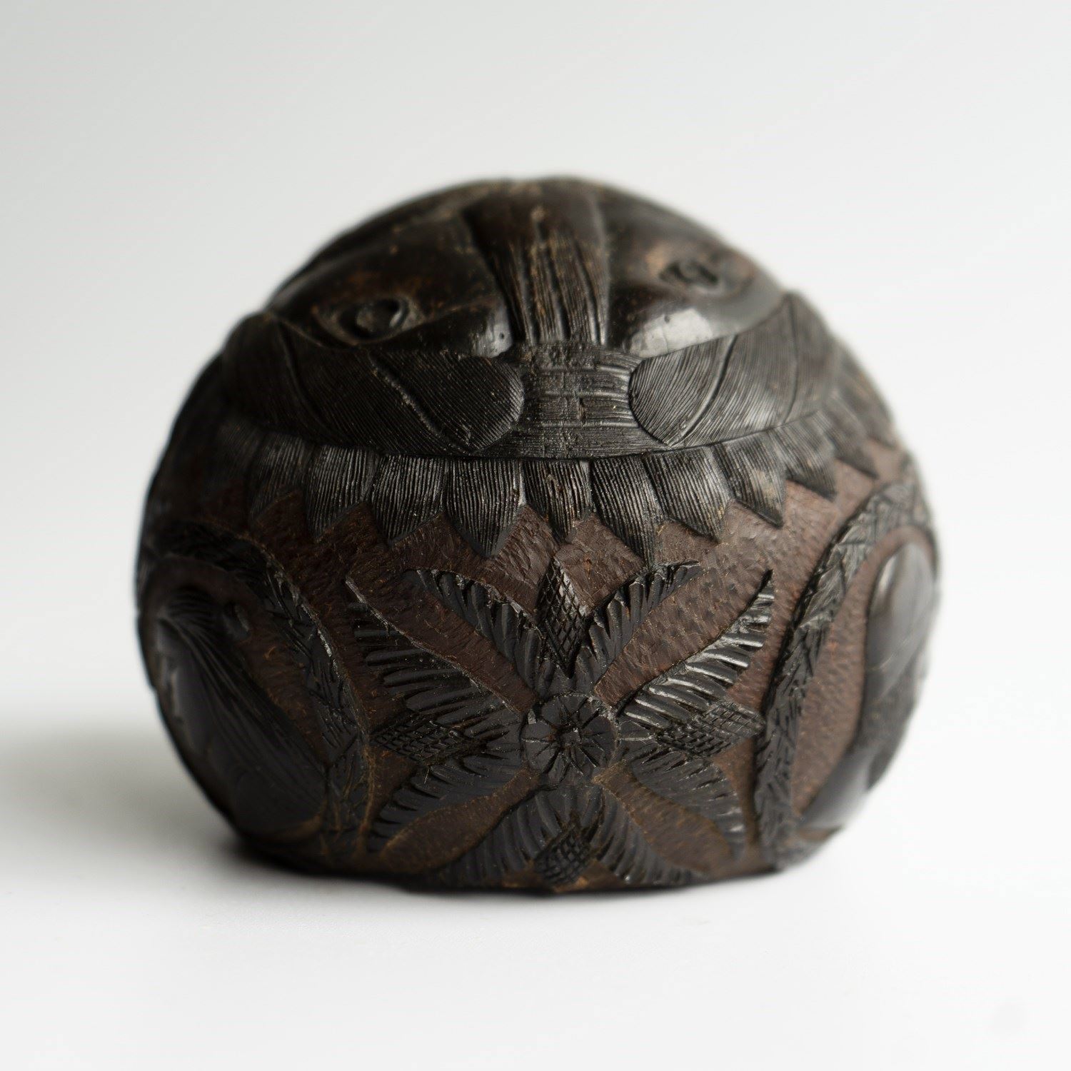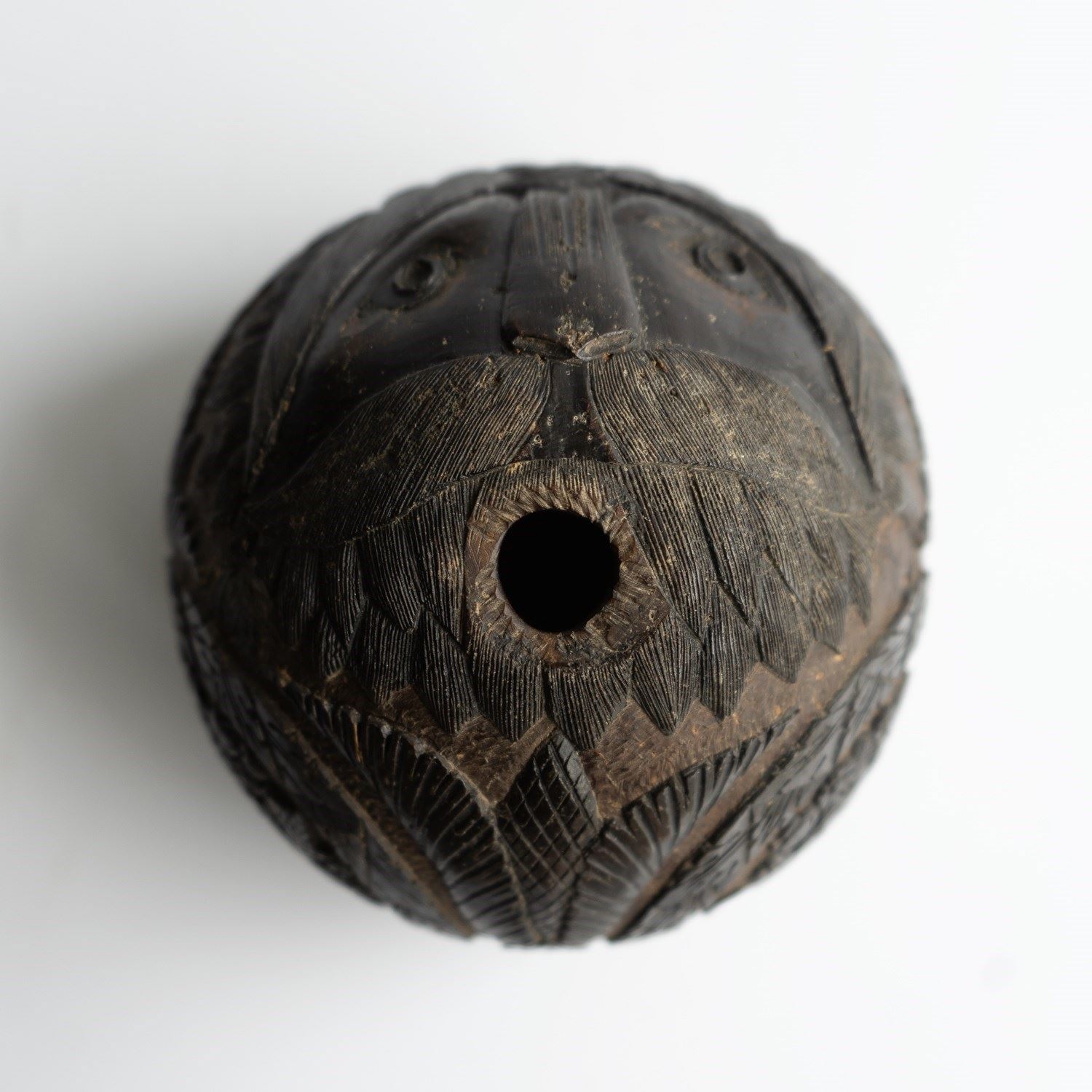 An intricately carved coconut with a face on one side which makes use the naturally occurring holes and pits of the coconut to form a man’s eyes and mouth with other features carved into the surface depicting his nose, moustache, eyebrows with great attention paid to the individual hairs. He is wearing what appears to be some form of a headdress.