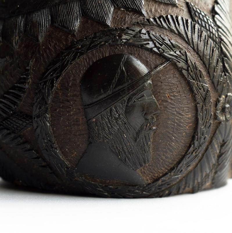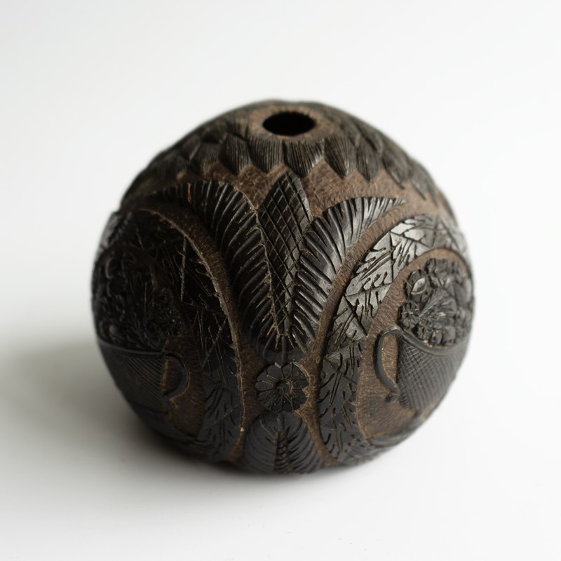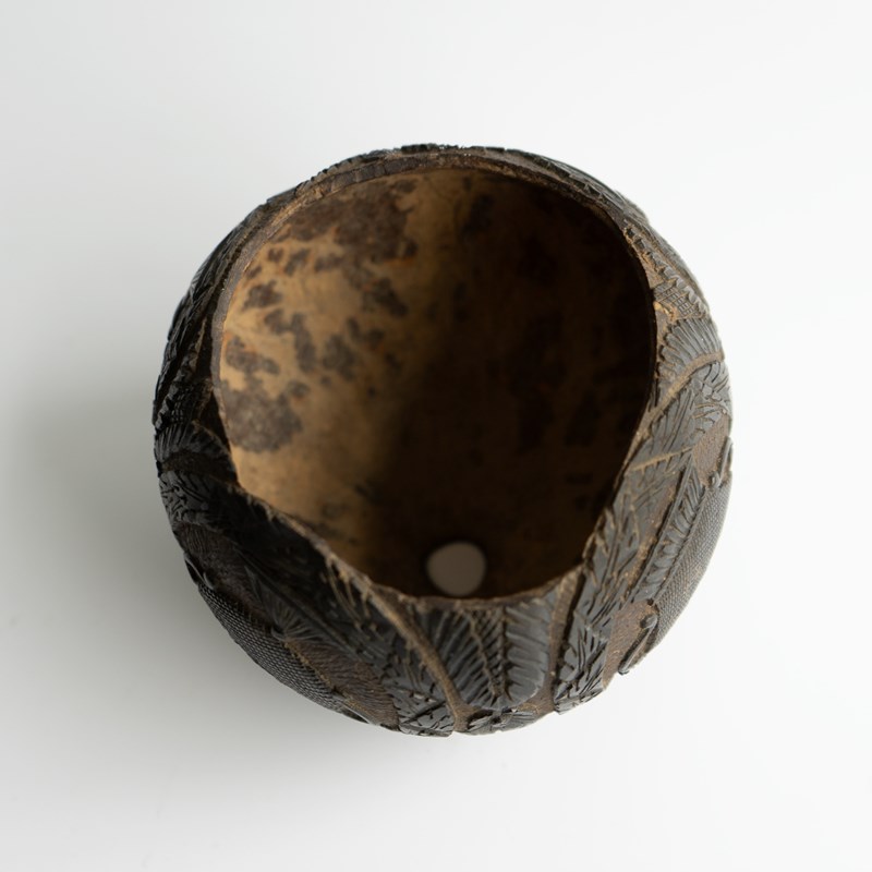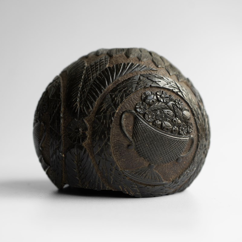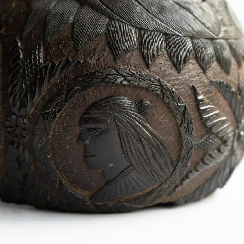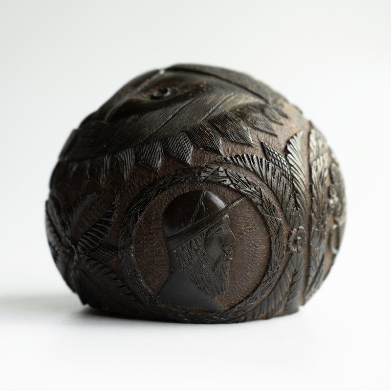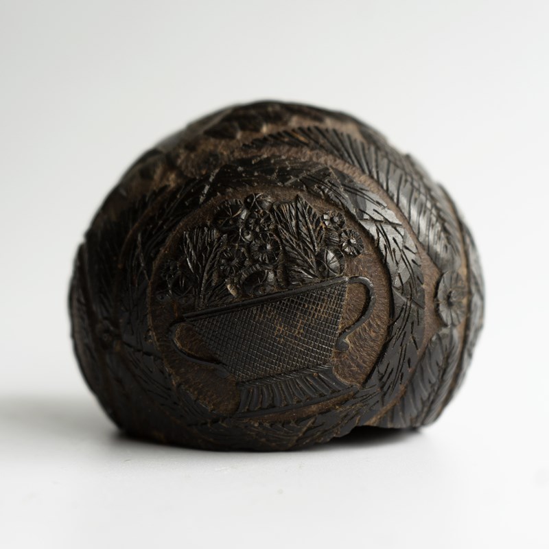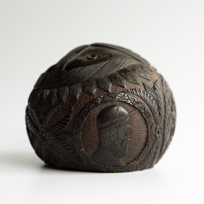 Known as ‘Bugbears’ carved coconuts like this one were hand carved by sailors in the 18th and 19th centuries who were travelling from tropical locations, mainly from the East or West Indies to pass the time aboard and can feature different themes usually depicted in a naive or folky manner.