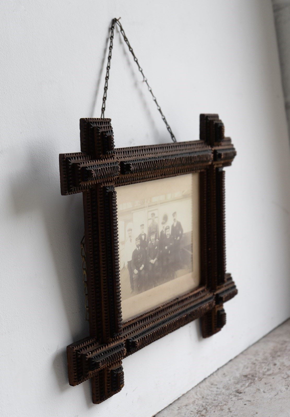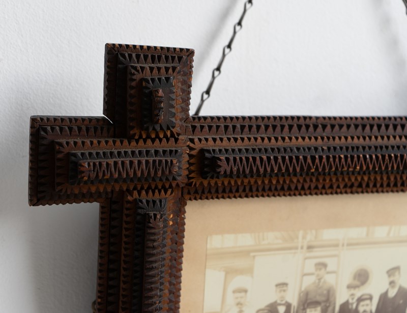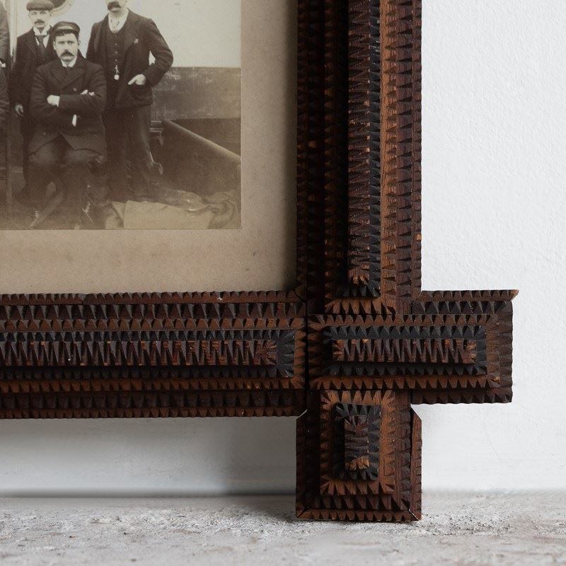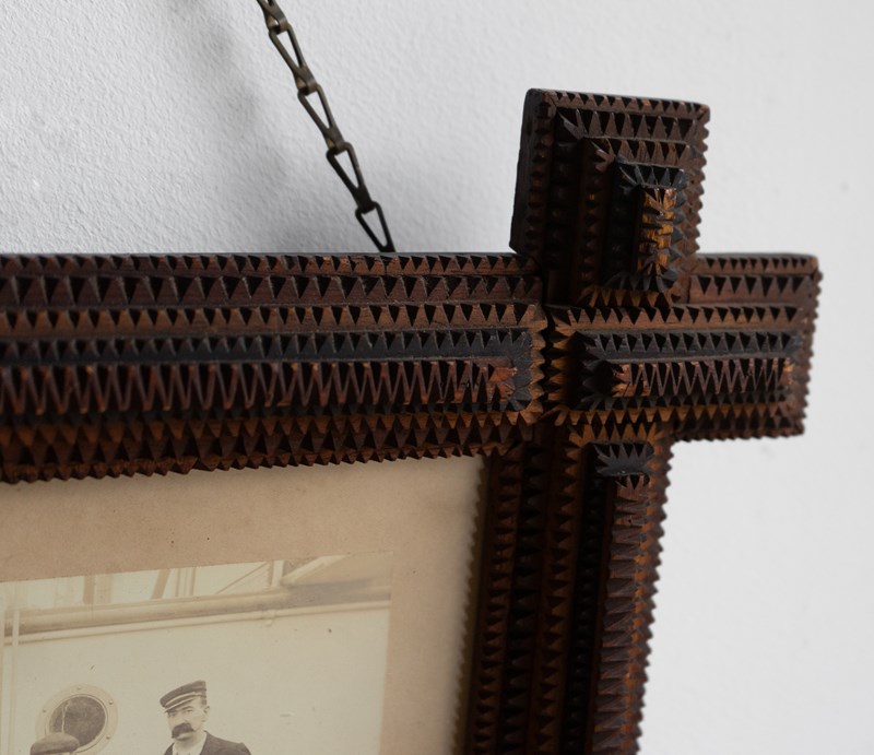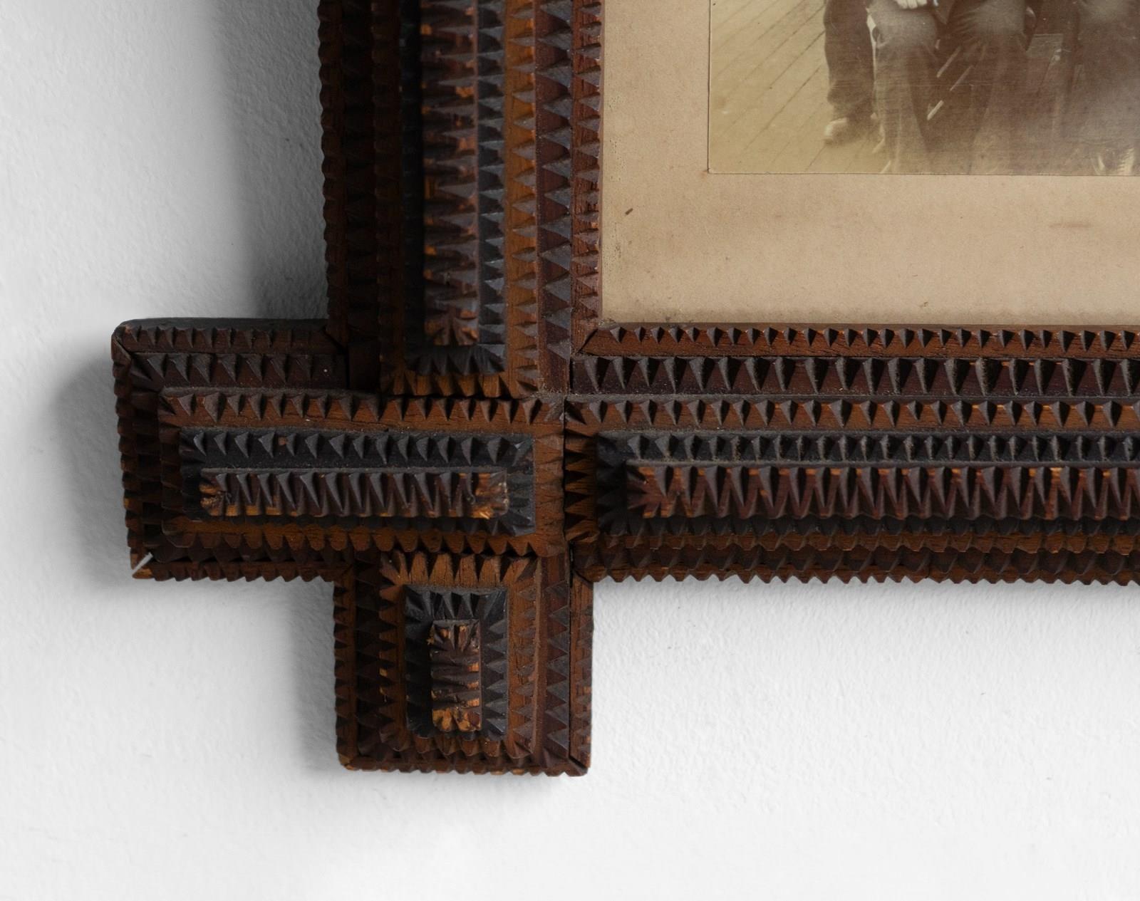 Antique folk art carved photo frame, with typically notched hand-crafted tramp art picture frame of deep form.