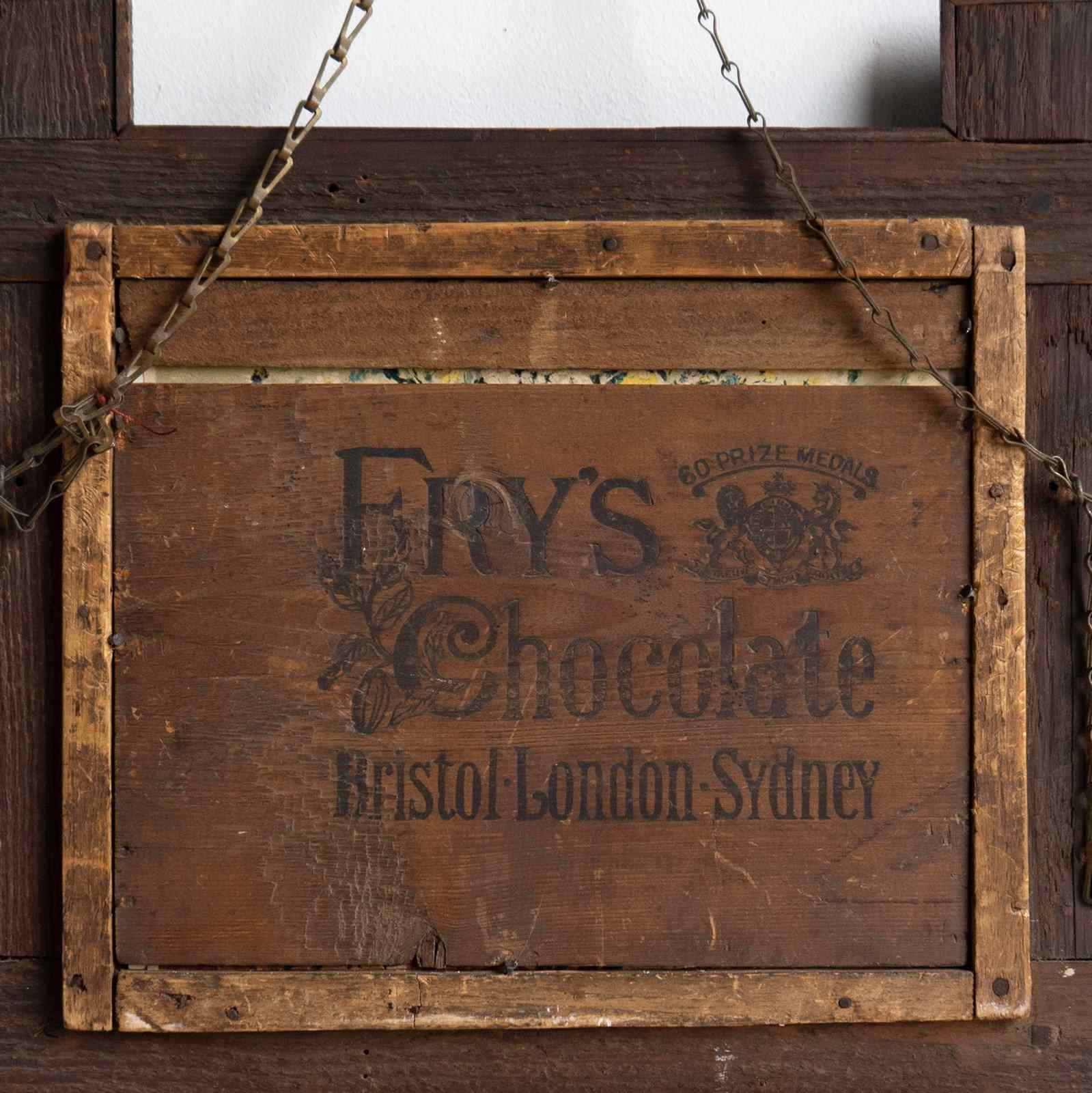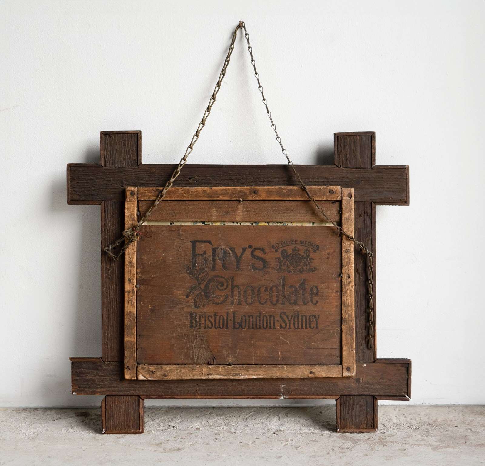 The frame is made from an old Fry’s Chocolate crate with the original advertising to the rear panel.