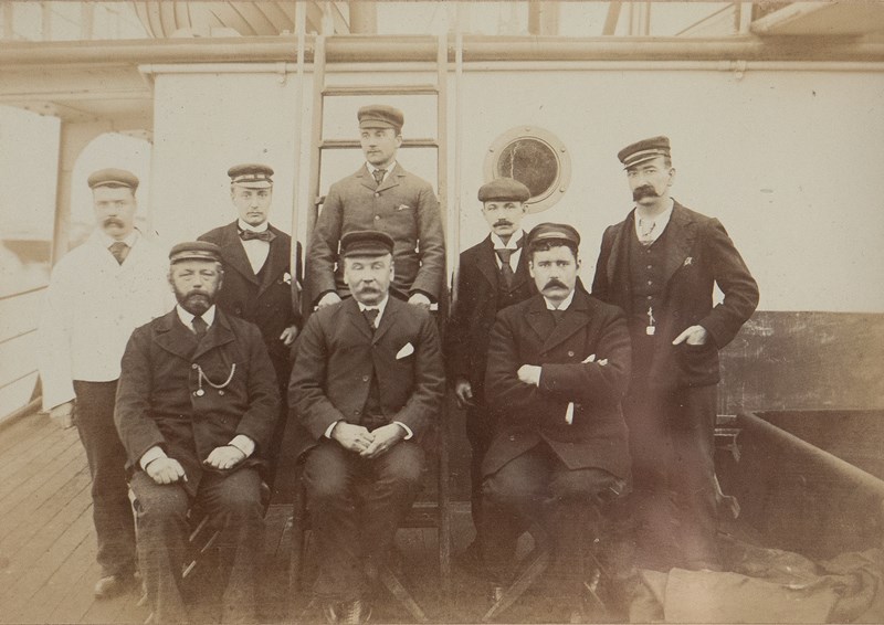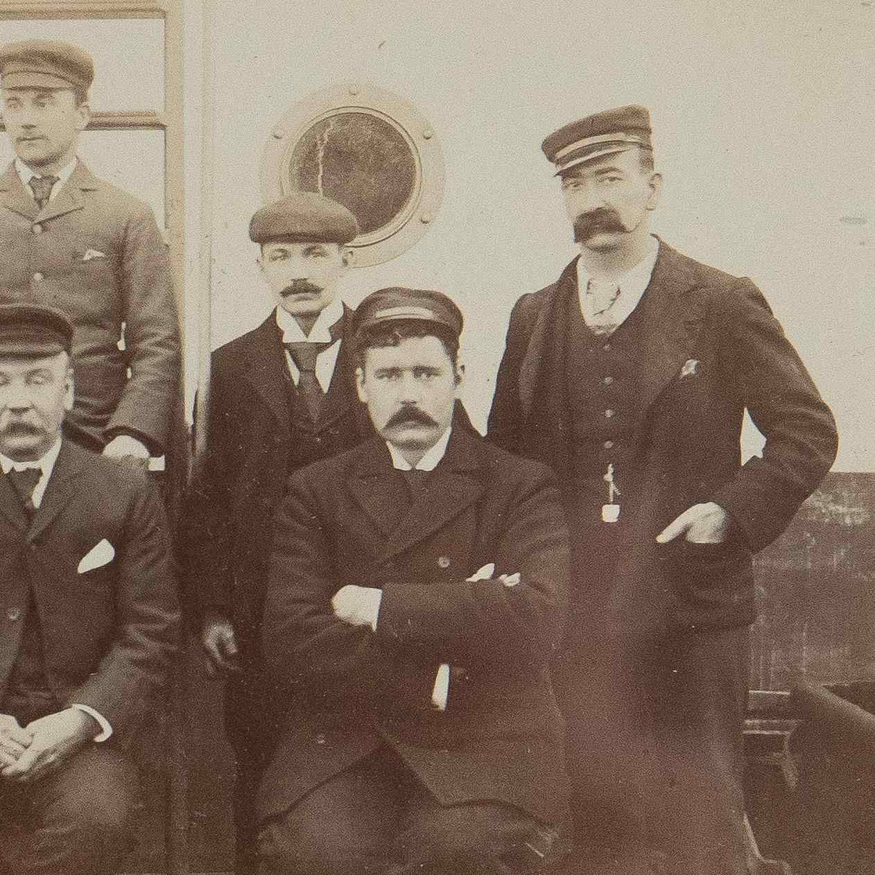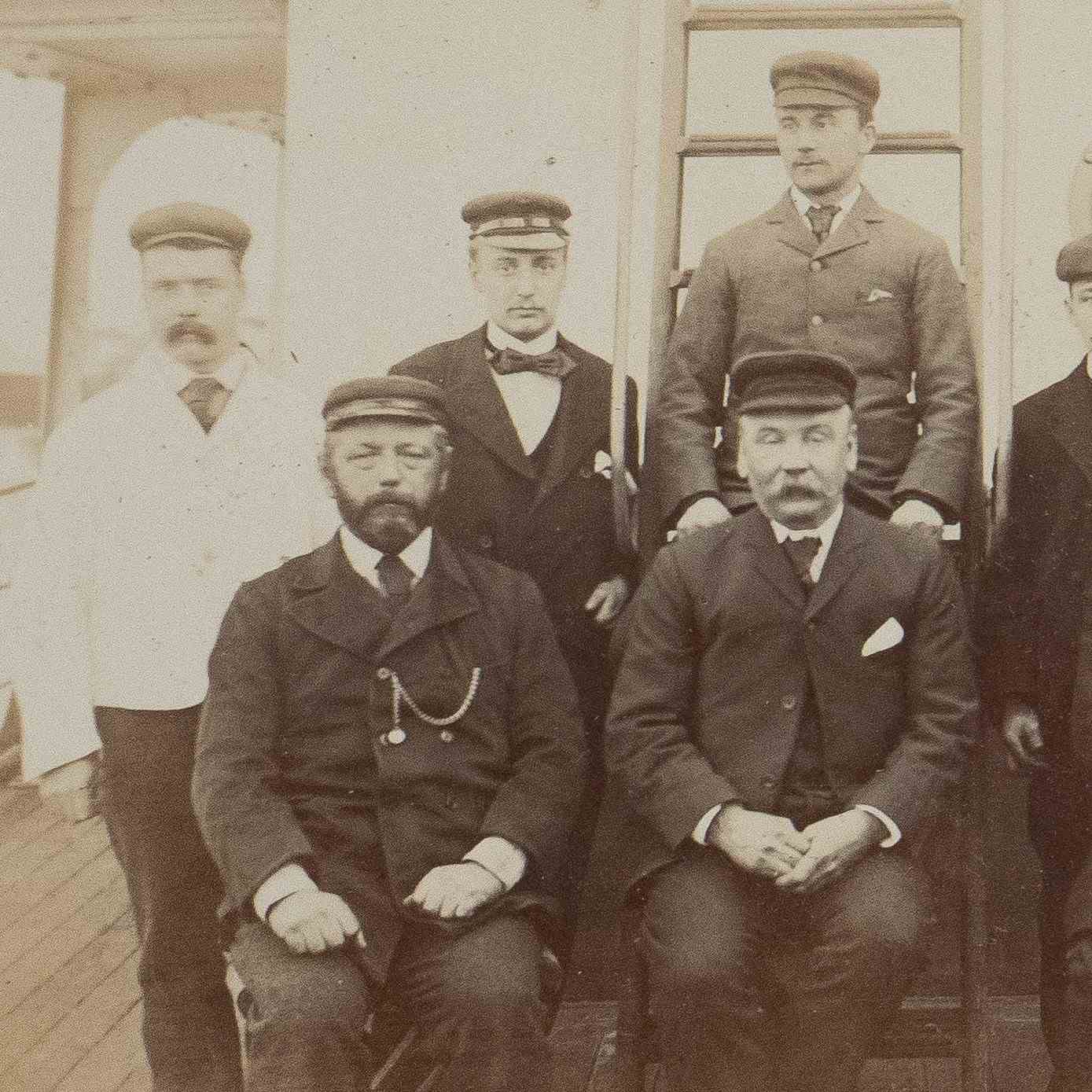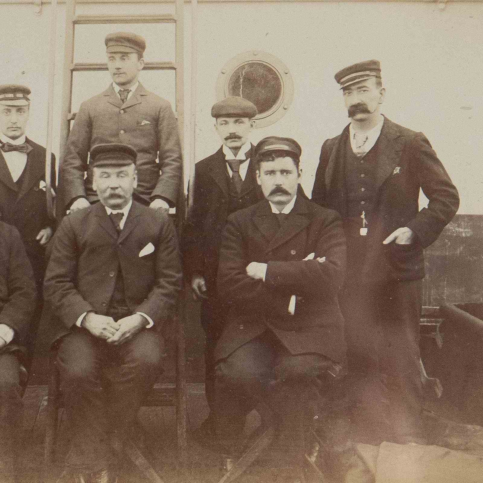 Charming original black and white photograph depicting a crew of characterful sailors on a ship.