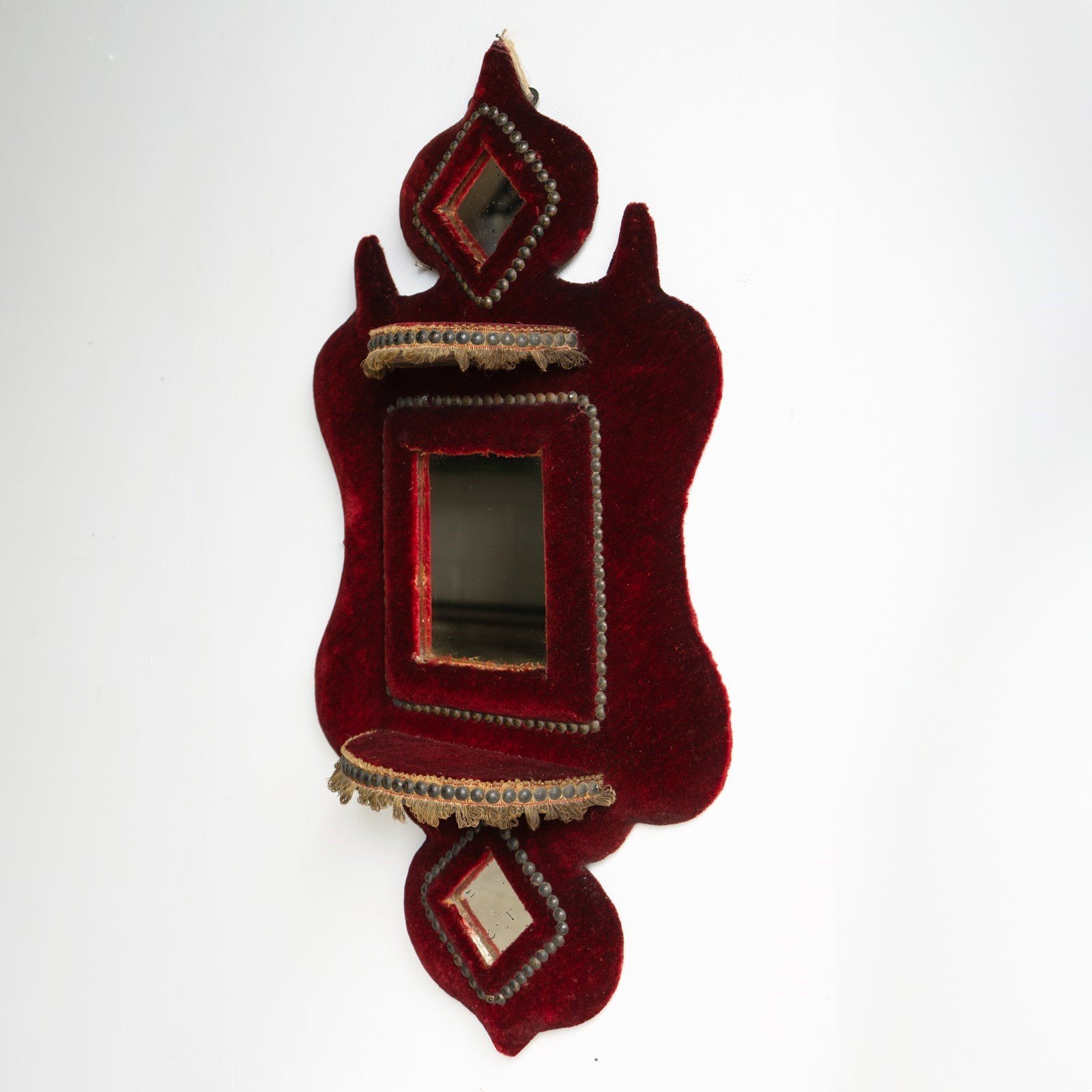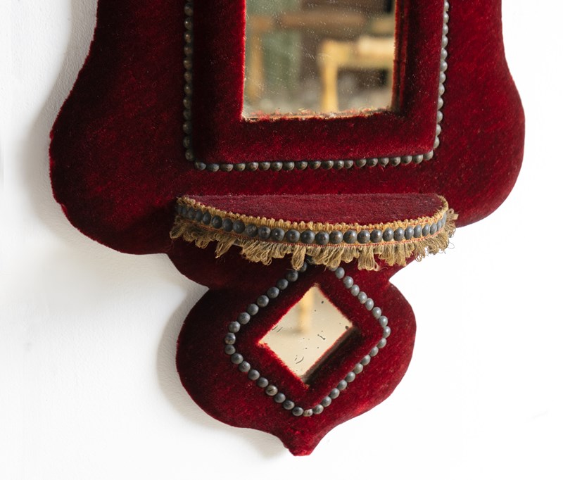 An antique mirrored shelf. A decorative mirror with sumptuous red velvet-covered, shaped frame in the Gothic taste.