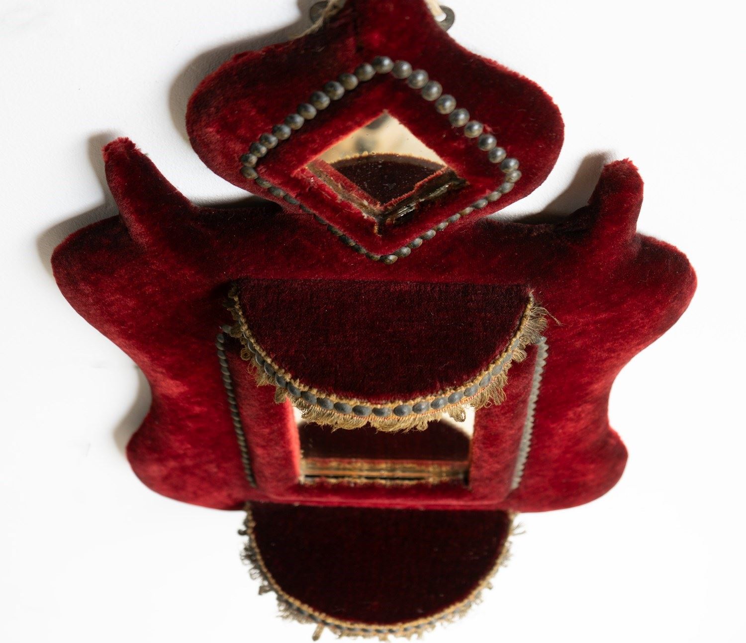 Two small demi-lune-shaped shelves are also studded and fringed in gold thread.