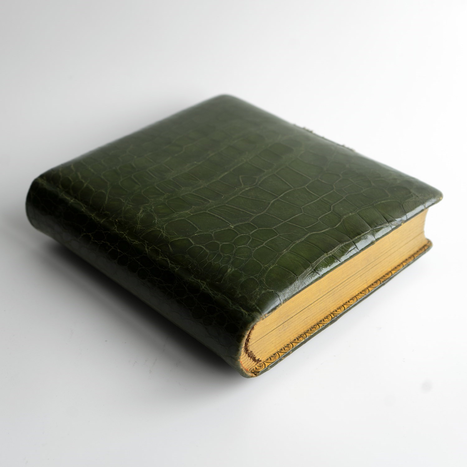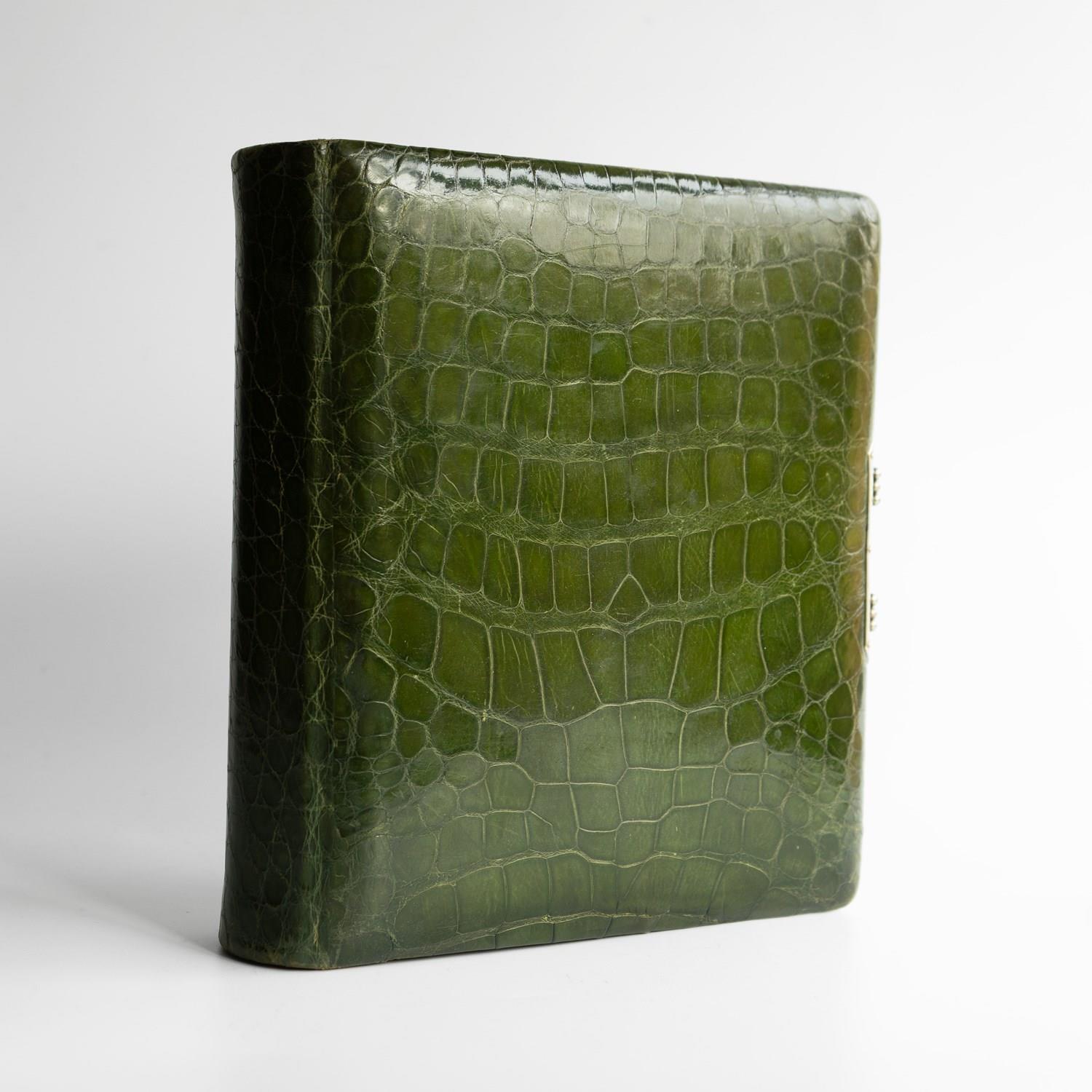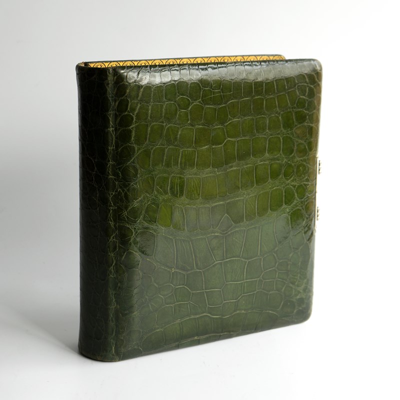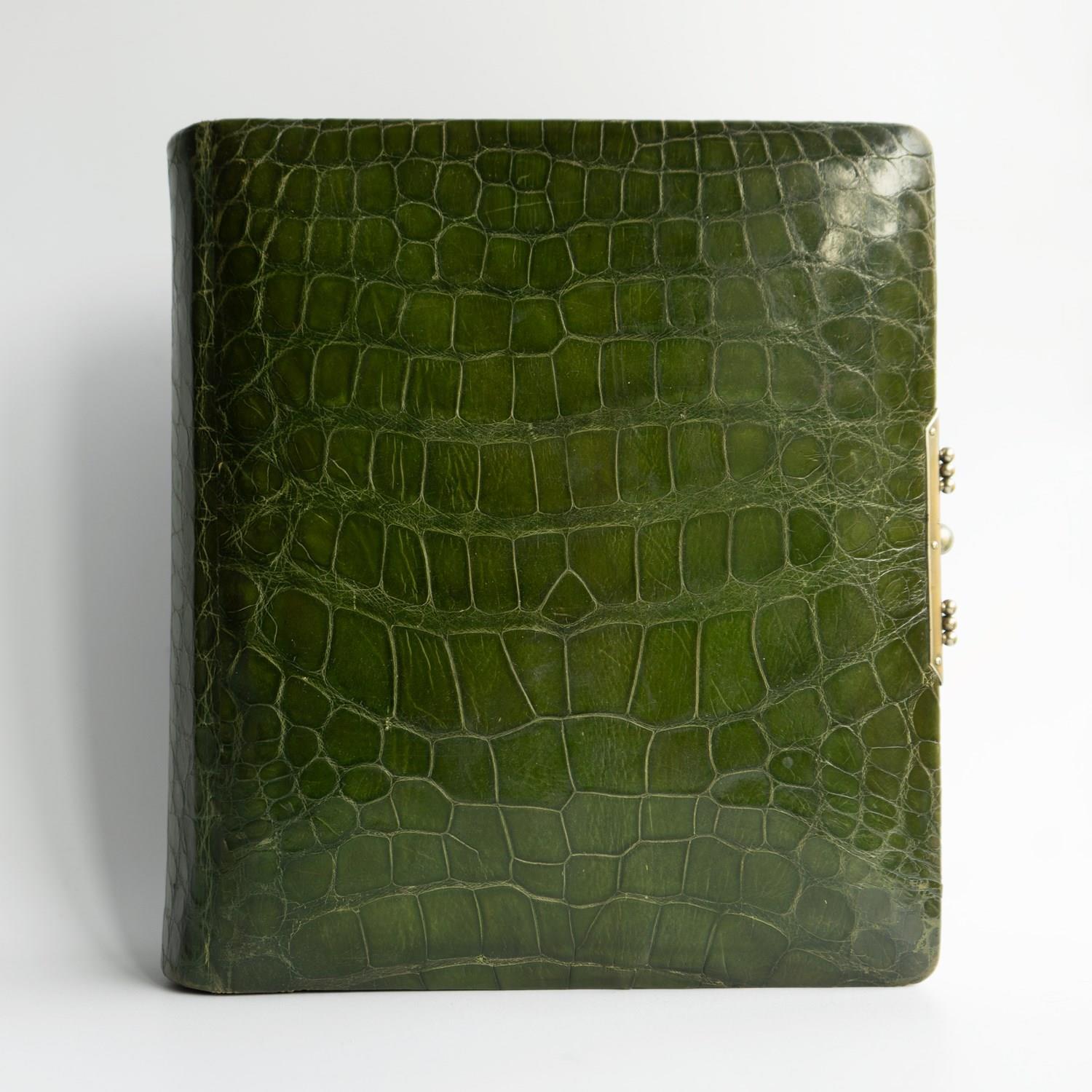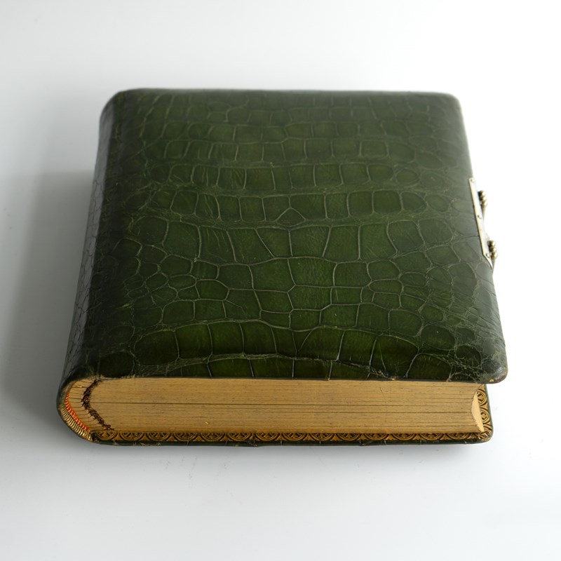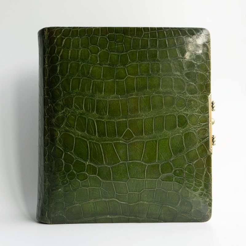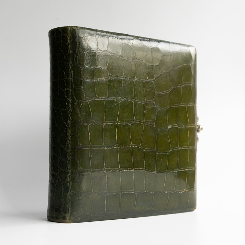 A very stylish and good quality photograph album with a darkish pea green crocodile skin cover and a silver plated brass clasp in the art nouveau style. Gilt edges and end papers with fabulous stylised floral motifs in the manner of William Morris.