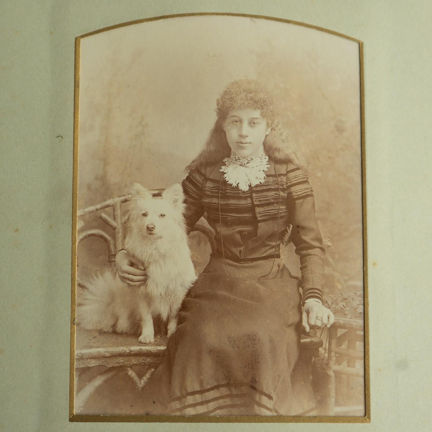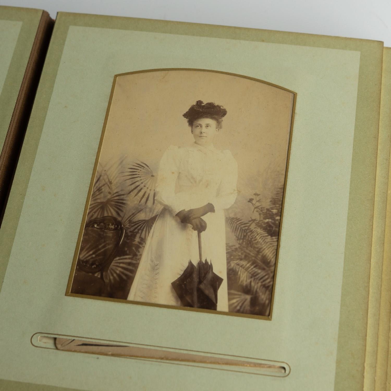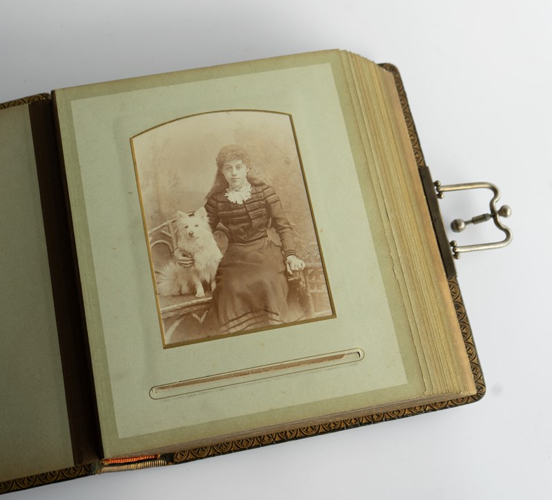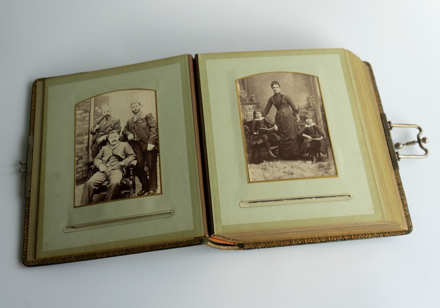 The contents filled with thirty one original portrait photographs of the period, depicting a wide array of people in wonderful costumes of the day including men, women. children, and dogs some military uniforms, musical instruments and intriguing backdrops etc.