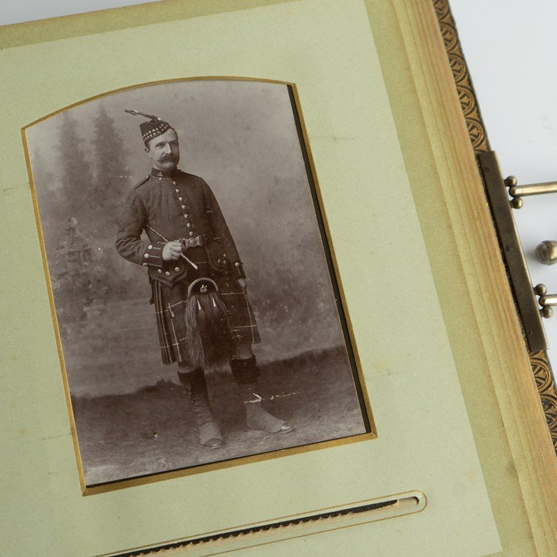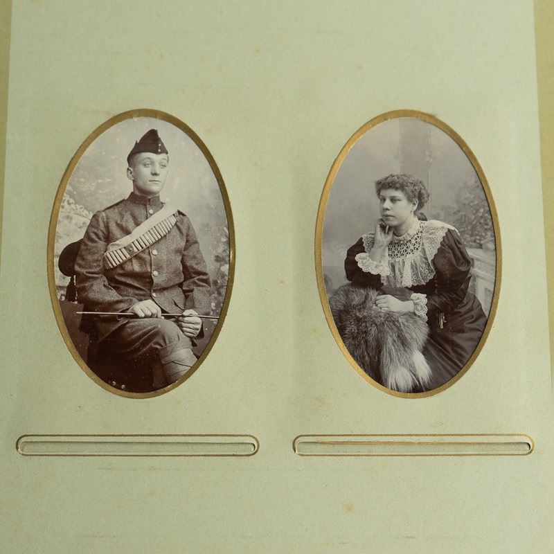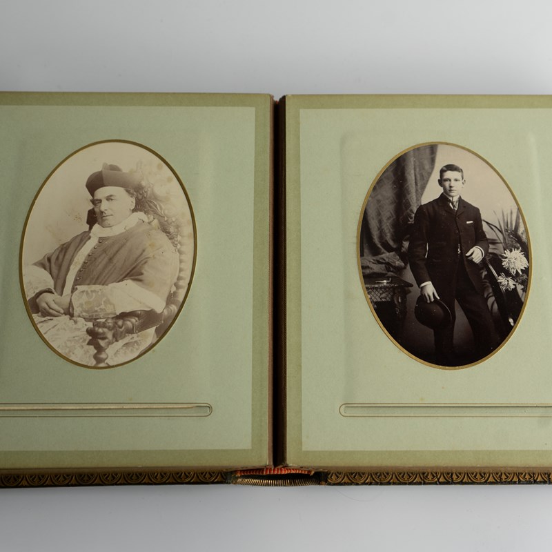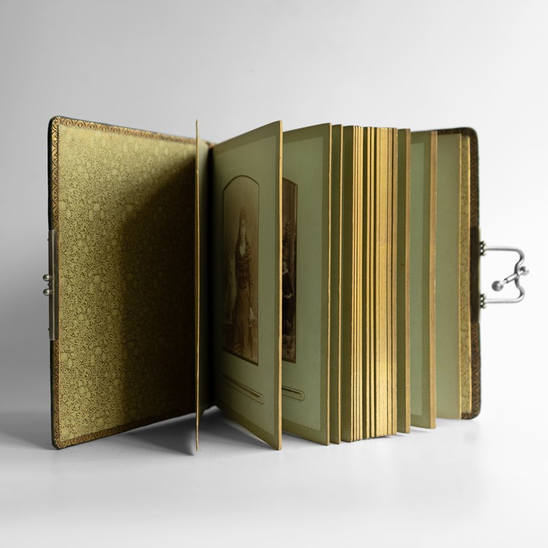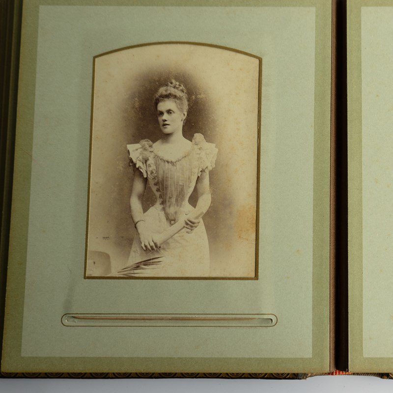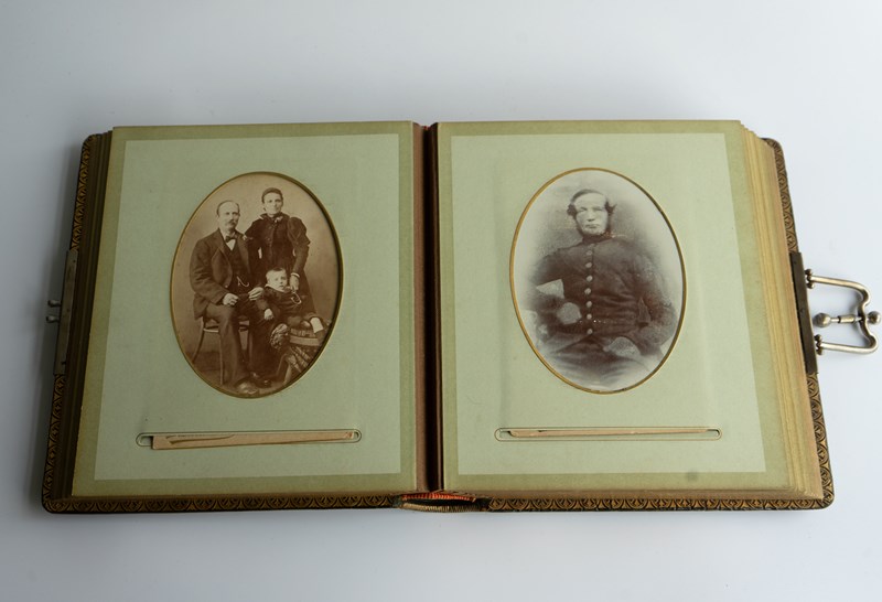 The contents filled with thirty one original portrait photographs of the period, depicting a wide array of people in wonderful costumes of the day including men, women. children, and dogs some military uniforms, musical instruments and intriguing backdrops etc.