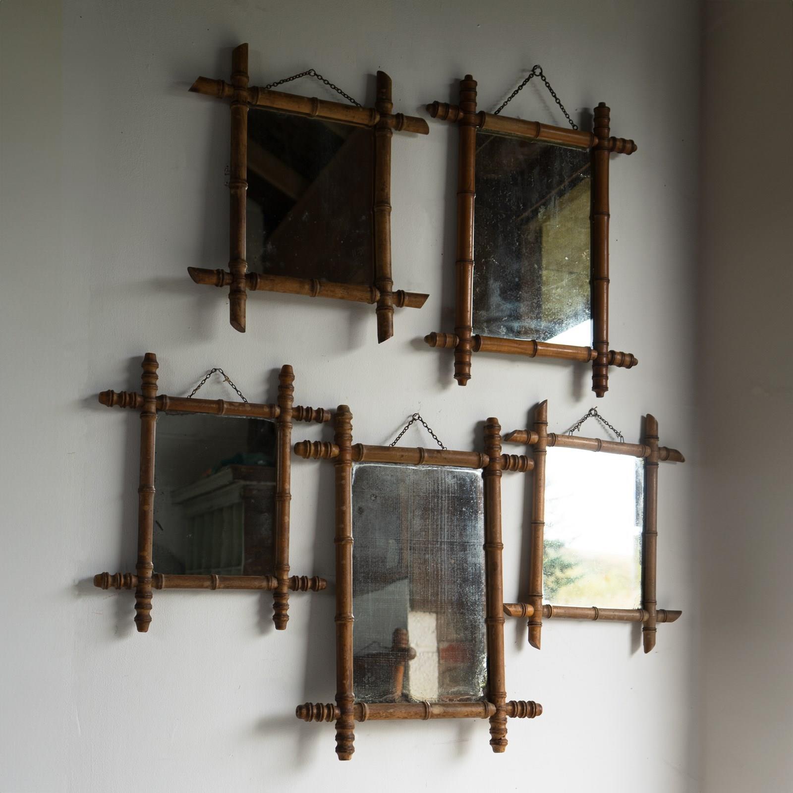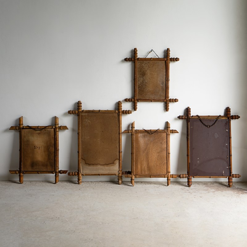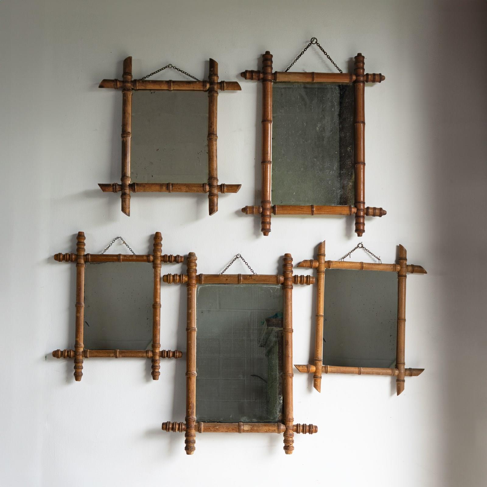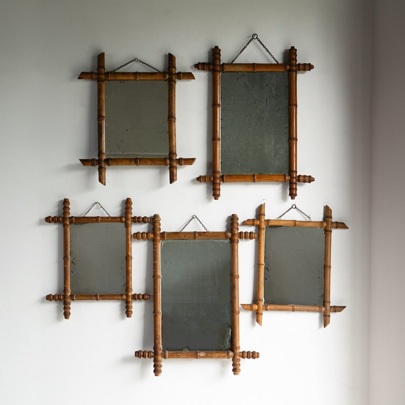 Vintage wooden framed hanging mirror collection. Five original examples of French faux bamboo wall mirrors.