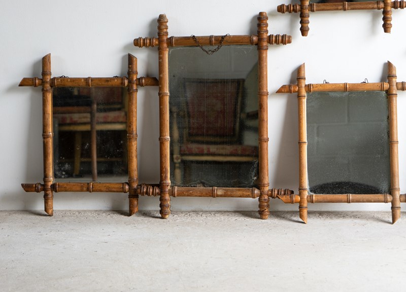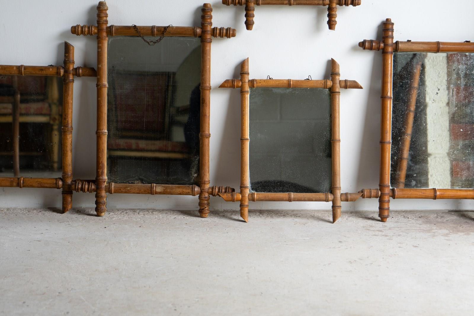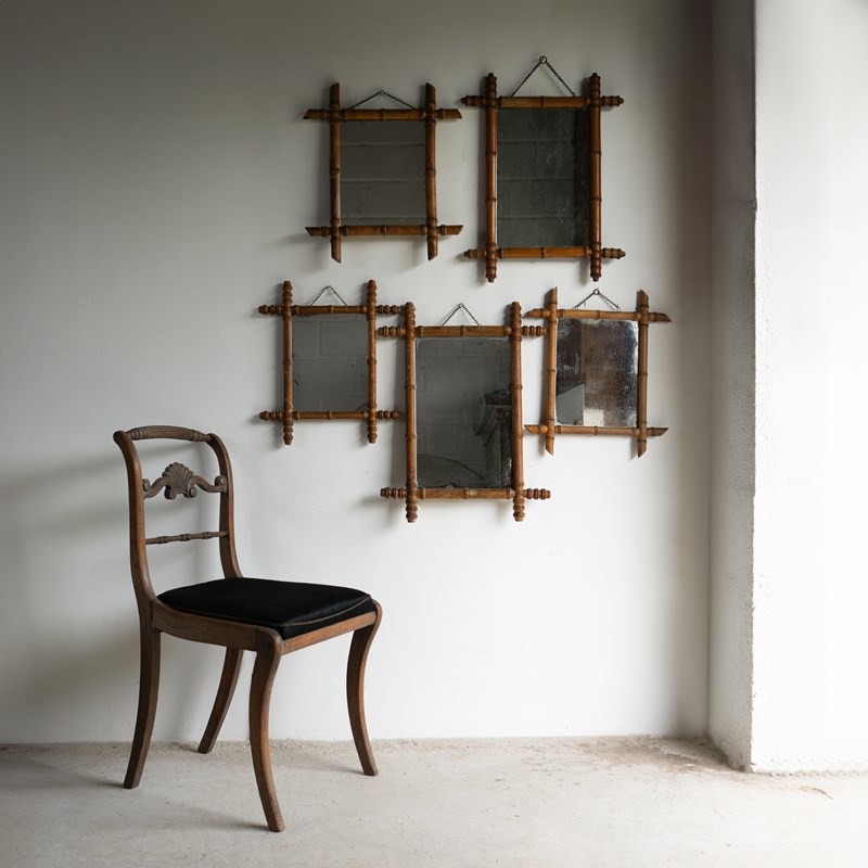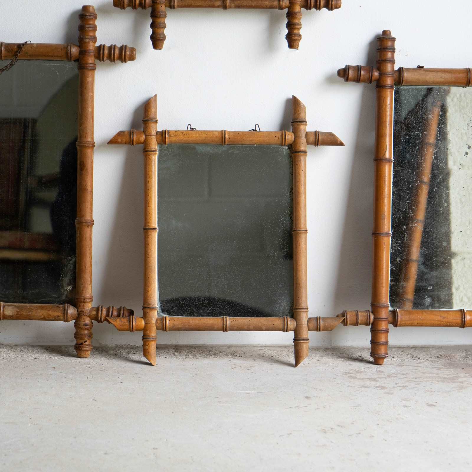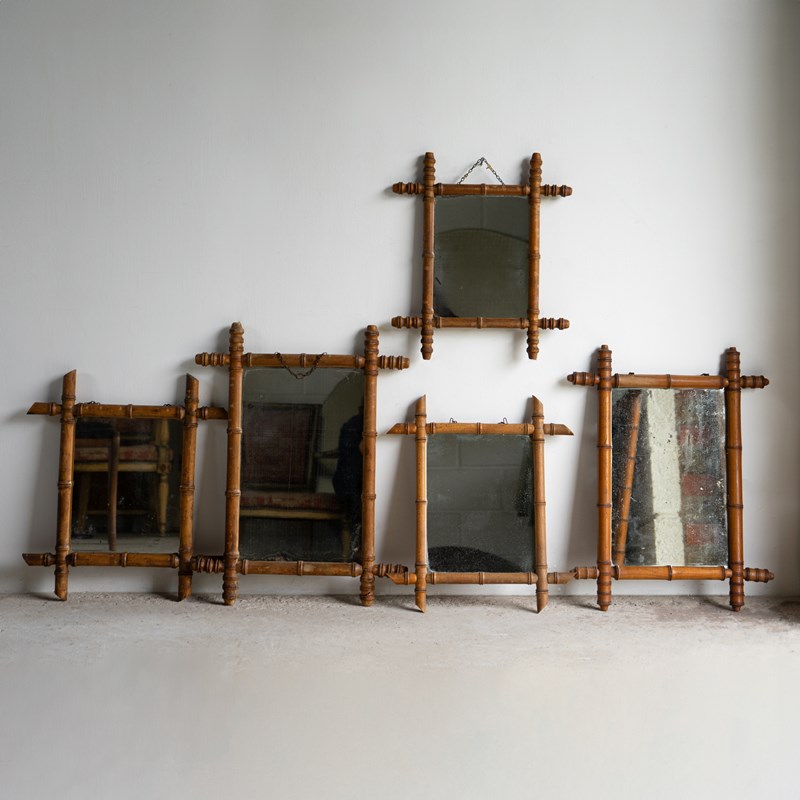 Vintage wooden framed hanging mirror collection. Five original examples of French faux bamboo wall mirrors.