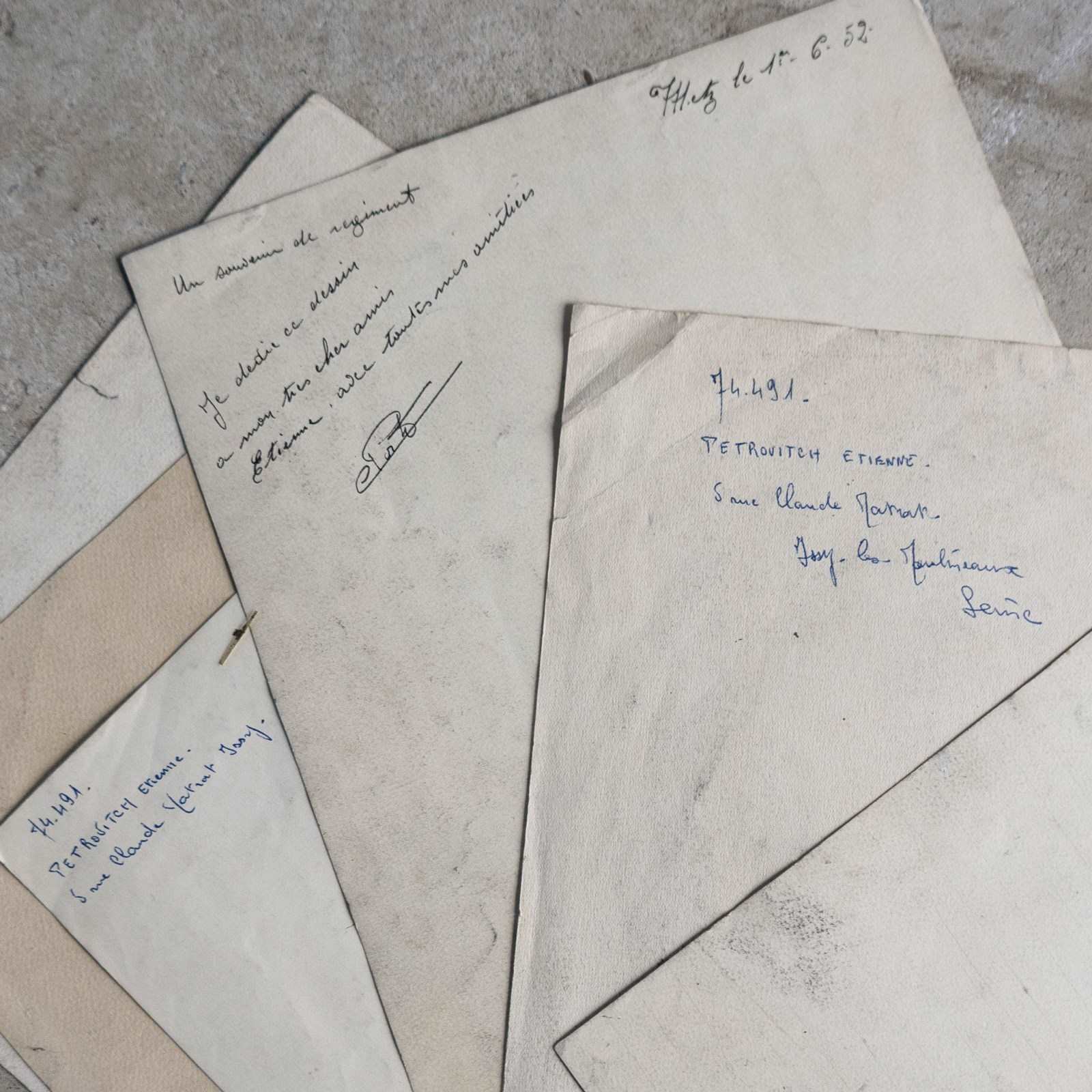 All by the same hand, and most are signed Petrovitch. From a few inscriptions, we have identified that the artist was Etienne Petrovitch, and his address was 5 Rue Claude Matrat, Issy-les-Molineaux, Hautes-de-Seine, on the outskirts of Paris. There is also an inscription on one that talks about a ‘regiment’. The only Etienne Petrovitch I can find of the period is Etienne Pedro Petrovitch (1909-1989), who was born in Romania and fought for the French Resistance in WWII, so it would make sense to be by his hand.