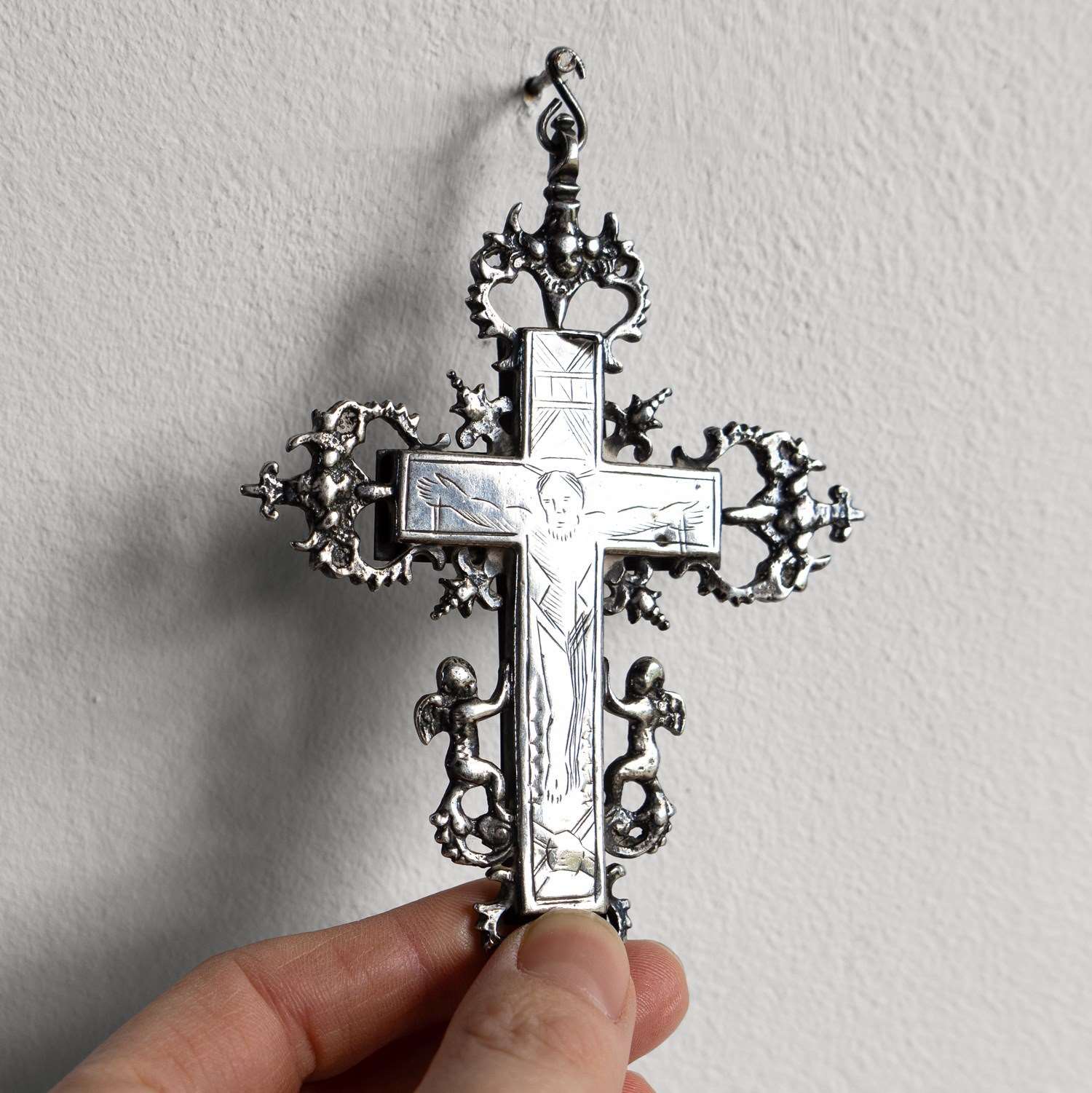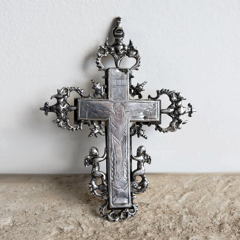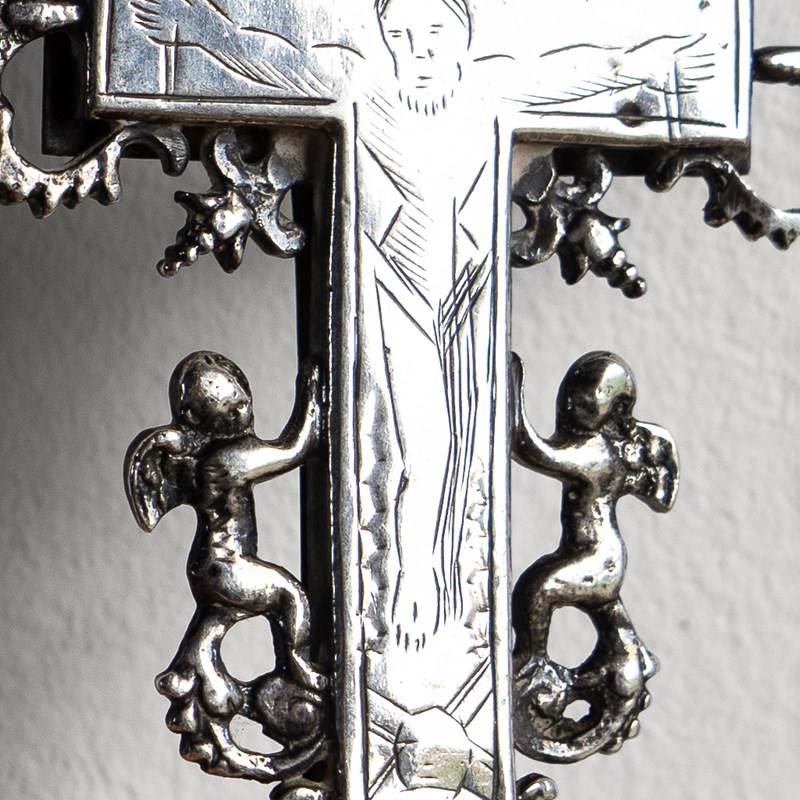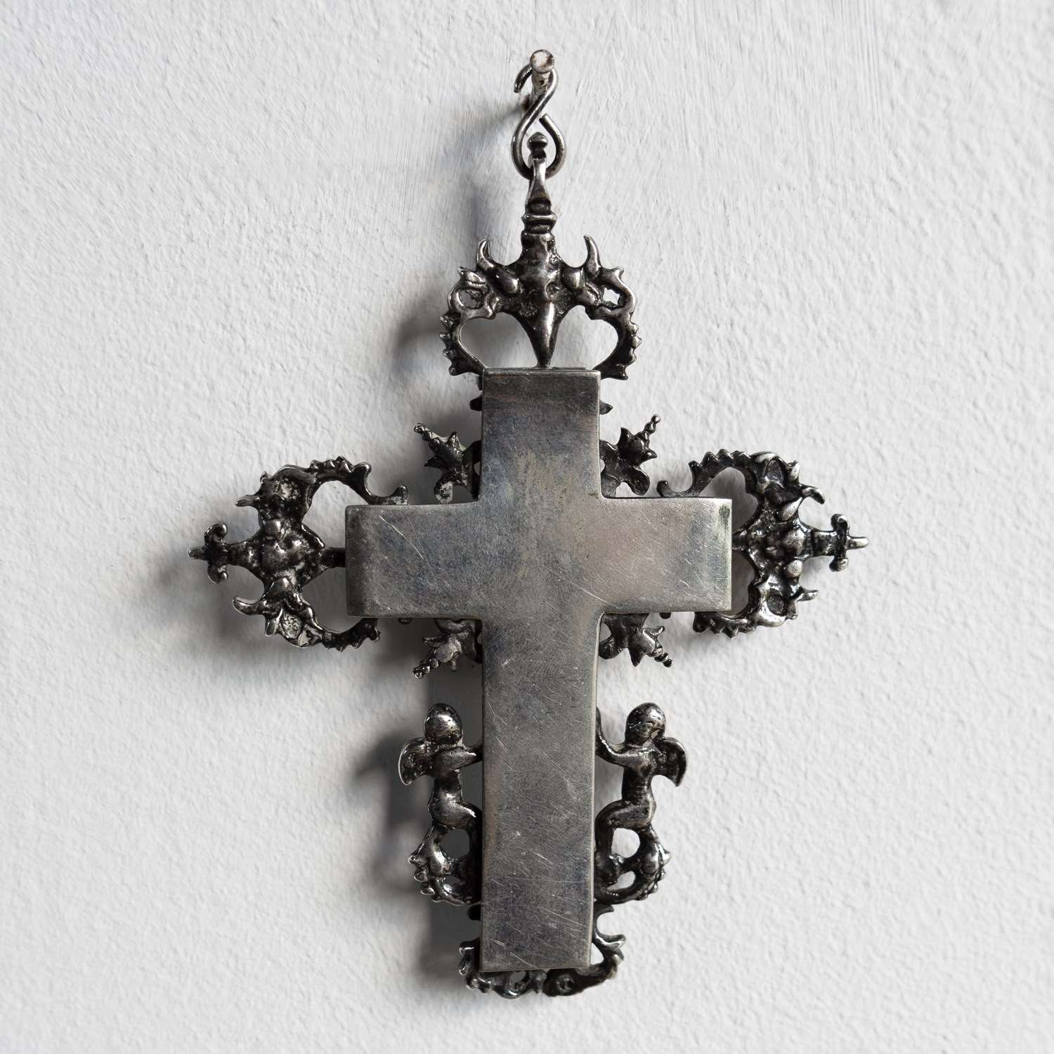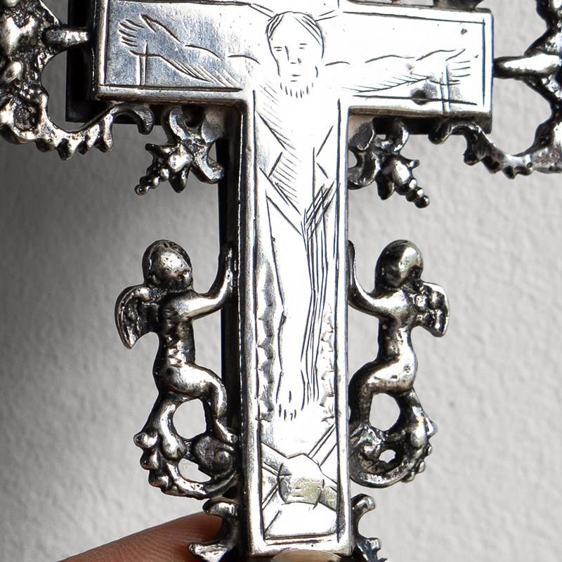 The central cross is surrounded by decorative silver embellishments in the form of catholic symbols, including winged angels/cherubs and what appear to be sacred hearts with daggers, etc., surrounded by thorns.